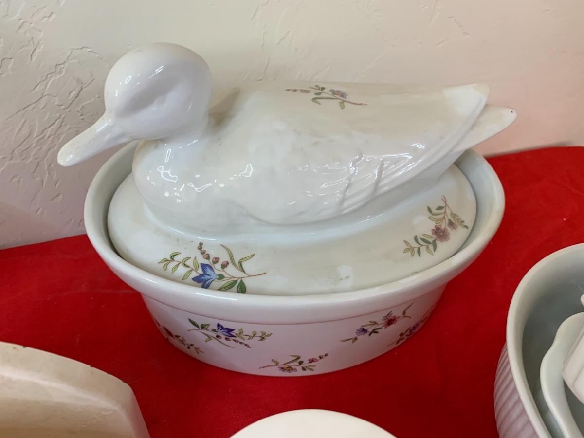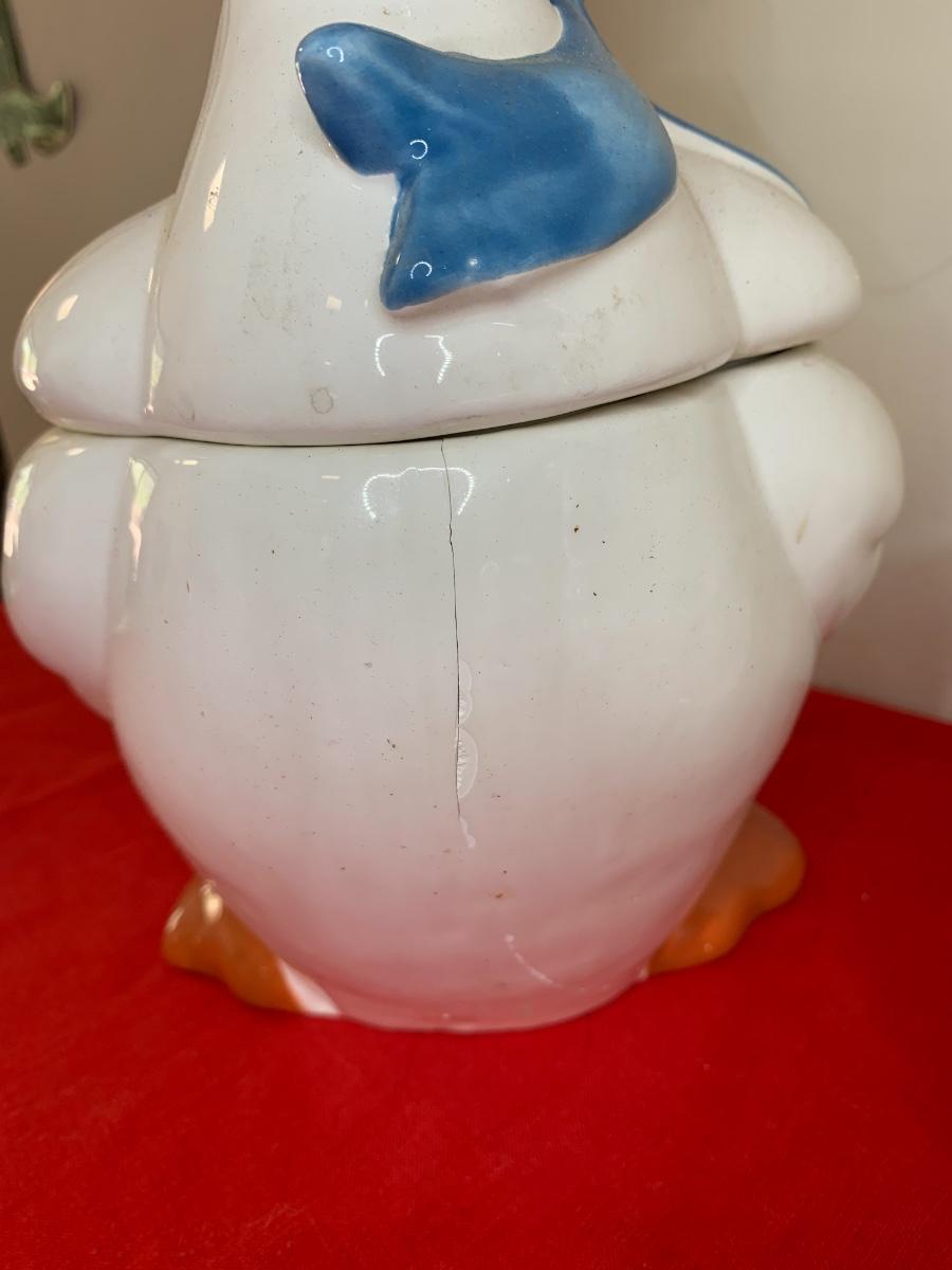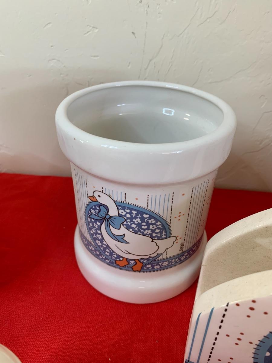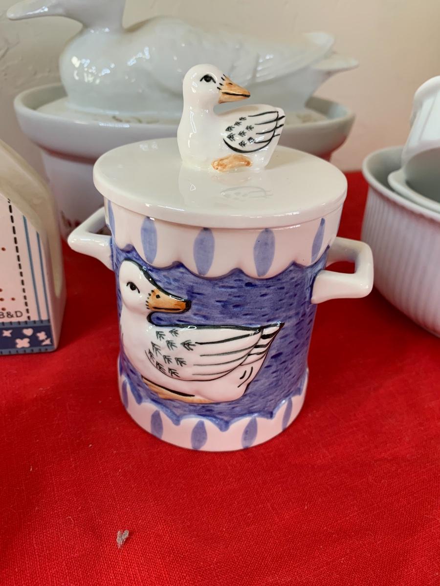 Lot includes one large duck cookie jar (cracked down the breast plate), salt and pepper shakers, napkin holder, butter knife, ornaments and more!