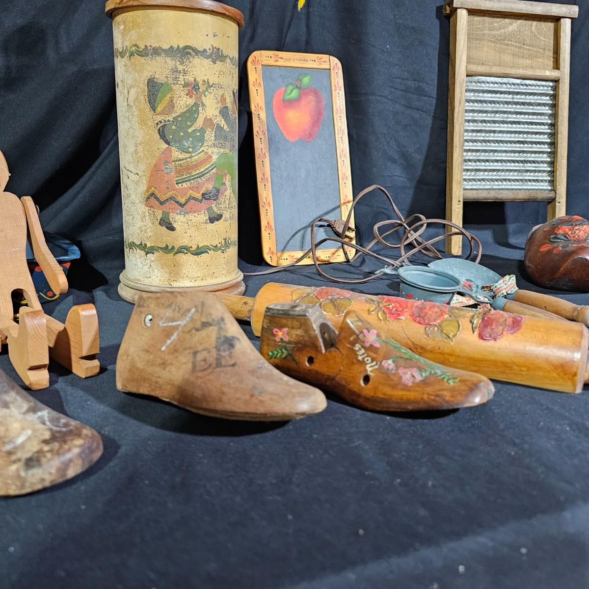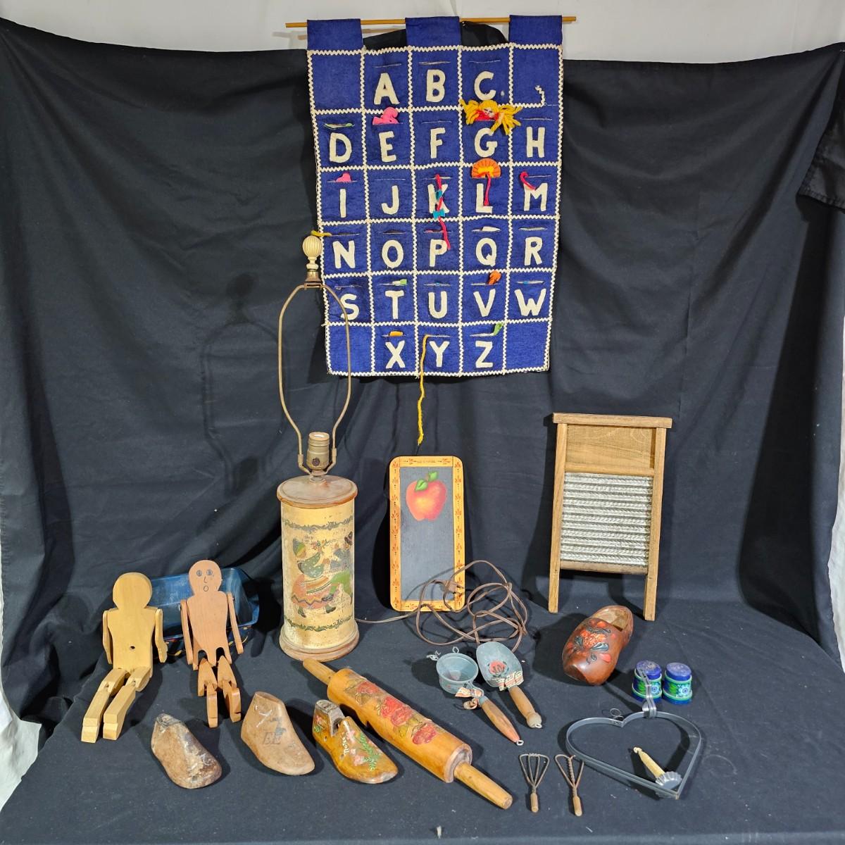 Fun knick-knacks to decorate your home with. Shelf sitters, washboard, wooden shoe, children's shoe lasts, a lamp and more. Lamp measures 5.5"D x 27"H, has three way switch and powered on when plugged in. Washboard is 8" x 15" and alphabet tapestry is 16" x 22". See photos for details. Shipping available.