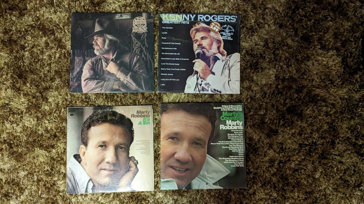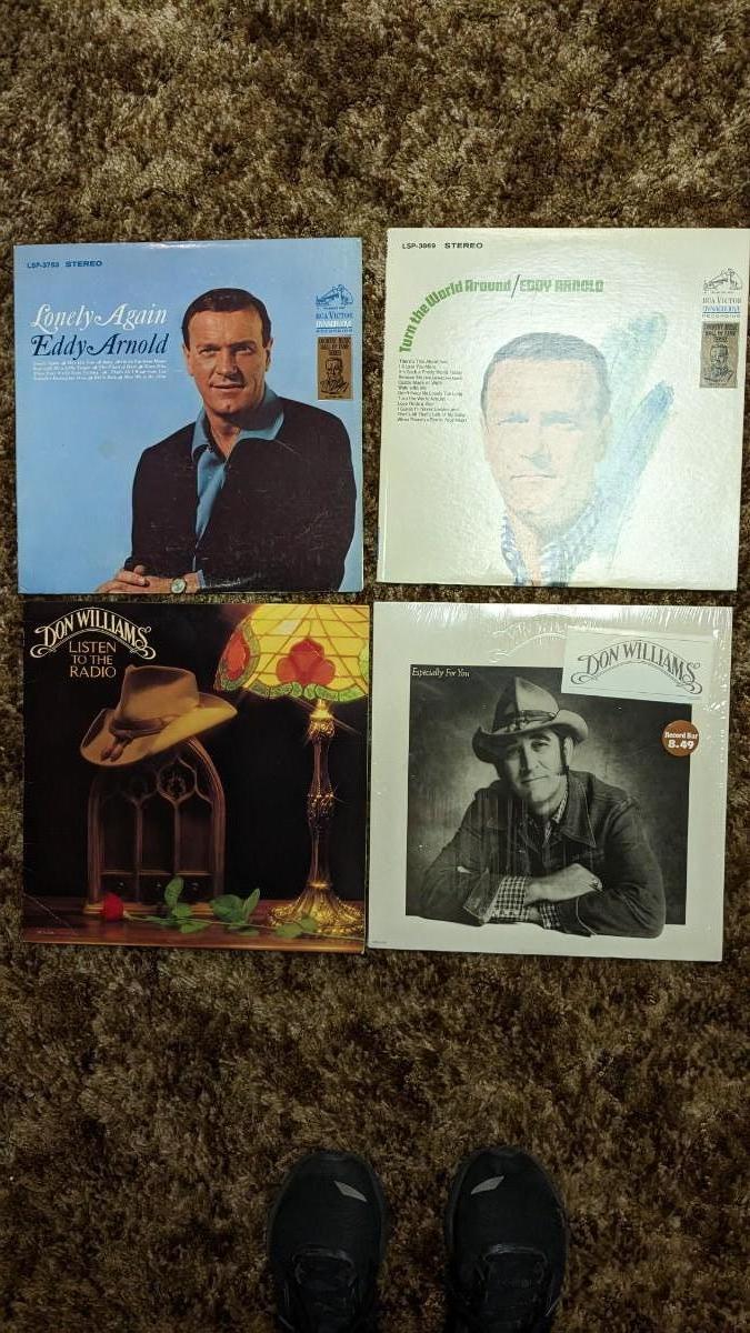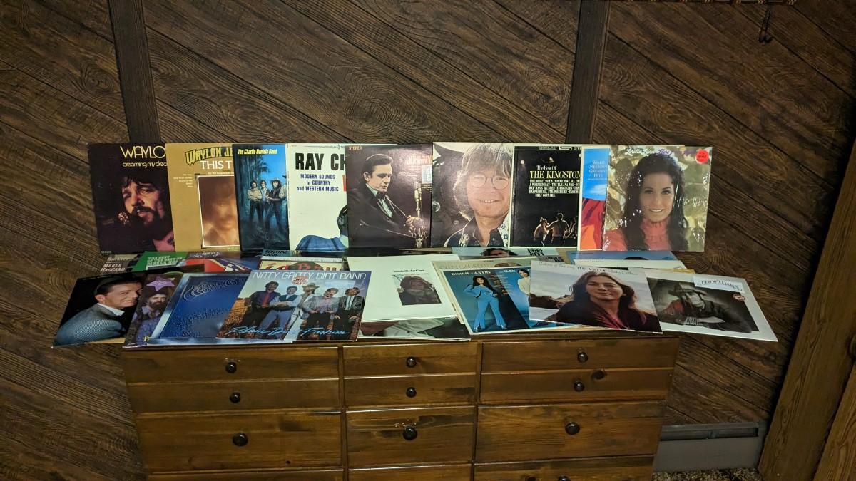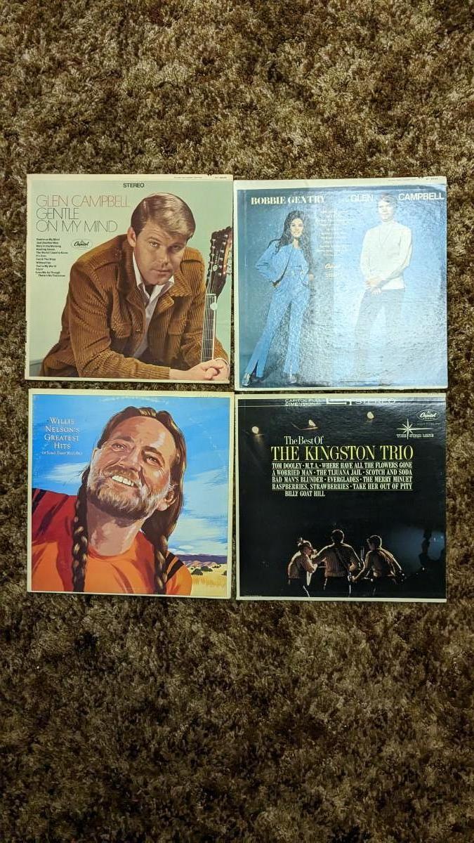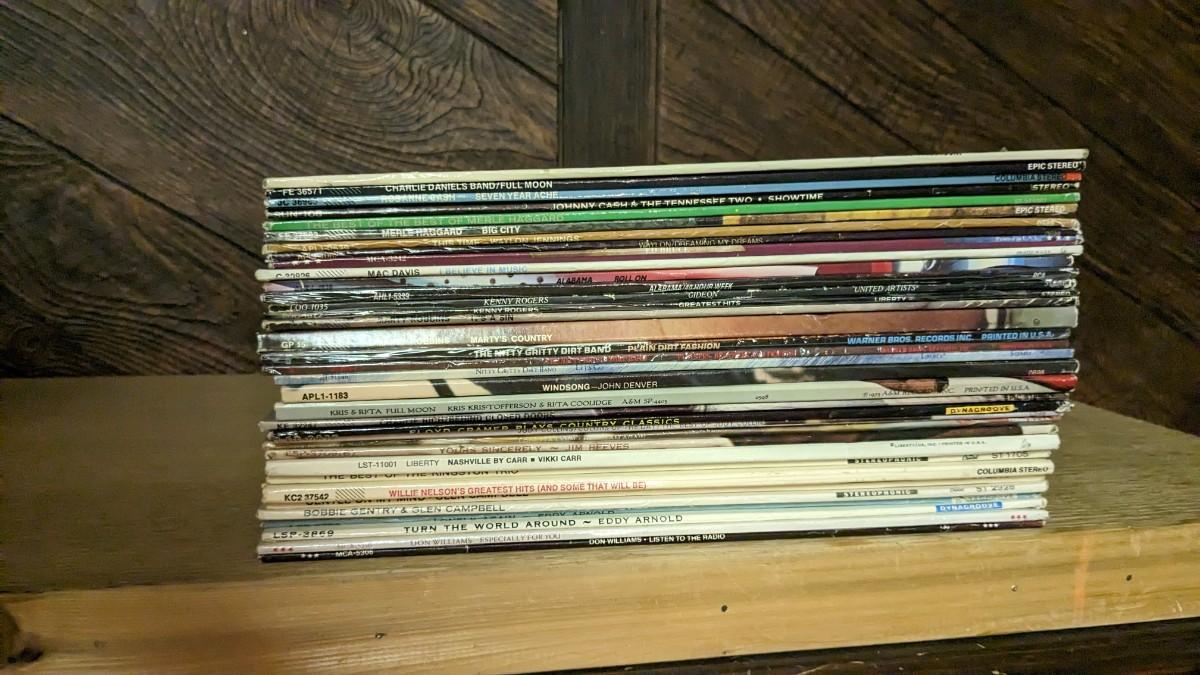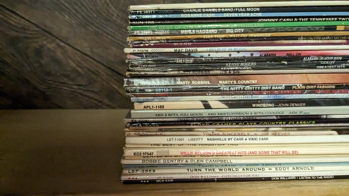 35ea, includes some of the best older country around. Includes Alabama, Waylon, Willie, & Johnny (Sun Records). As well as Merle Haggard, Don Williams, Glen Campbell, Kris Kristofferson, Roseanne Cash, Eddy Arnold, Ed Bruce, Mac Davis, Charlie Daniels Band, Kenny Rogers, Ray Charles Country and Western Vol II (ABC Records), Marty Robbins, Charlie Rich, Jim Reeves, Nitty Gritty Dirt Band, John Denver, Kingston Trio, Loretta Lynn, and more! All sleeves are in good shape outside of a slight tear on Ray, note in photos. basement