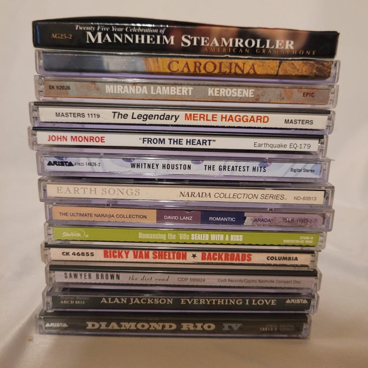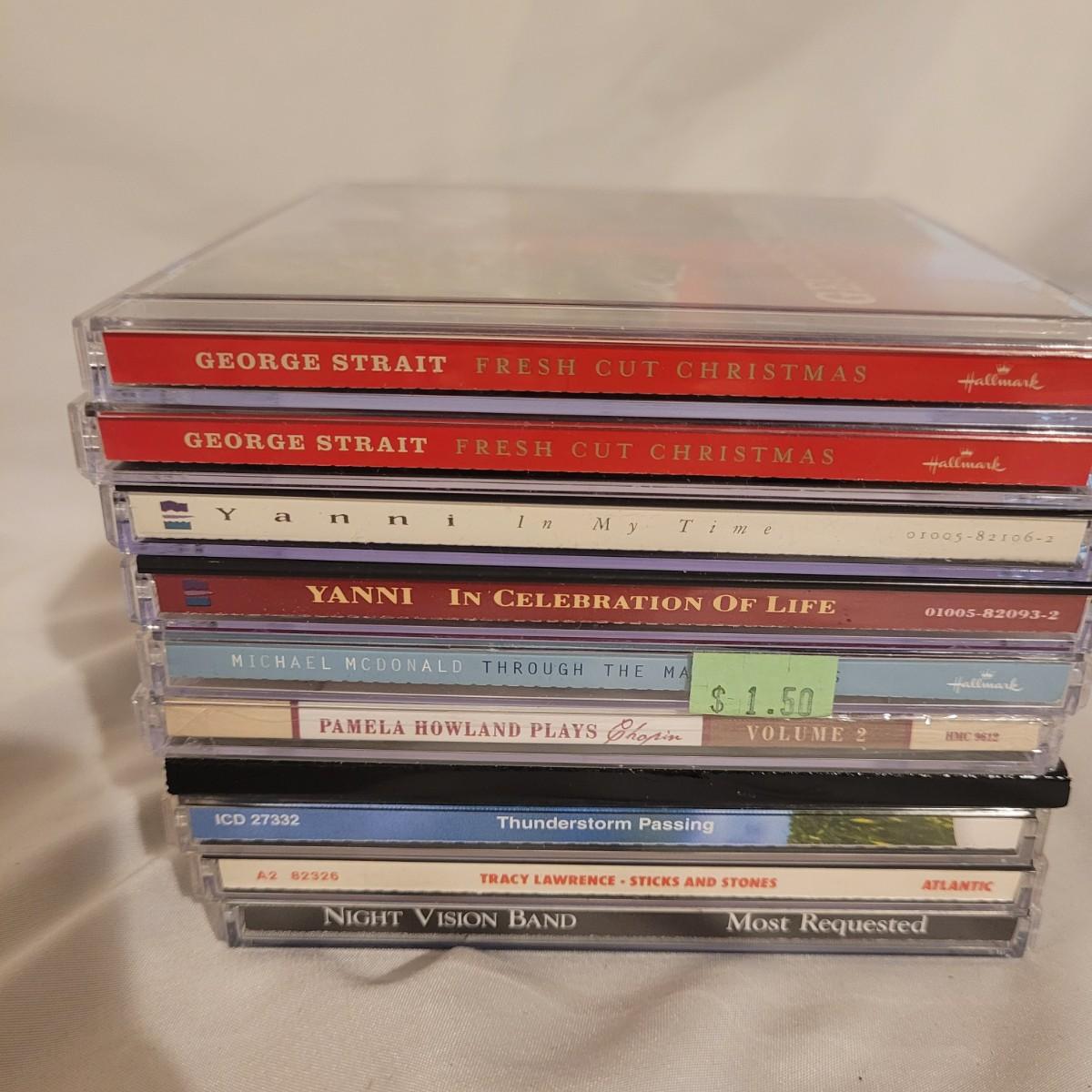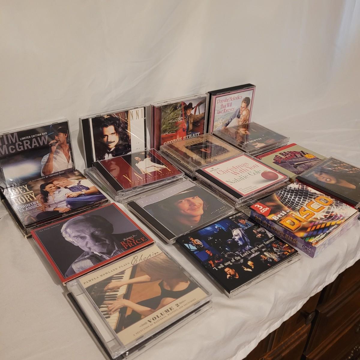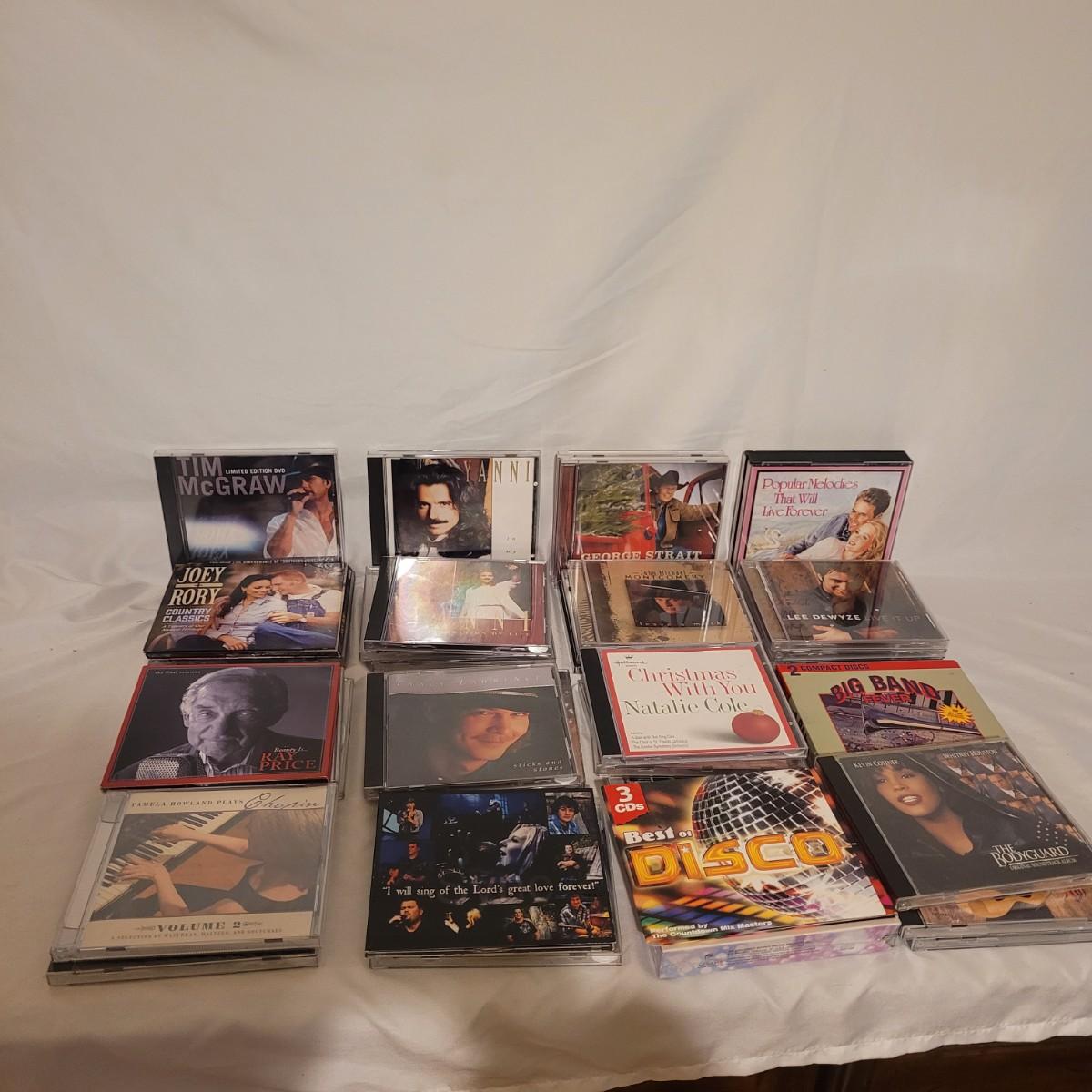 This large collection of music CD'S includes country favorites such as Tim McGraw, George Strait, and other genres including Yanni, big band, Christmas, Celtic and much more. Please see photos for details. Shipping available.
