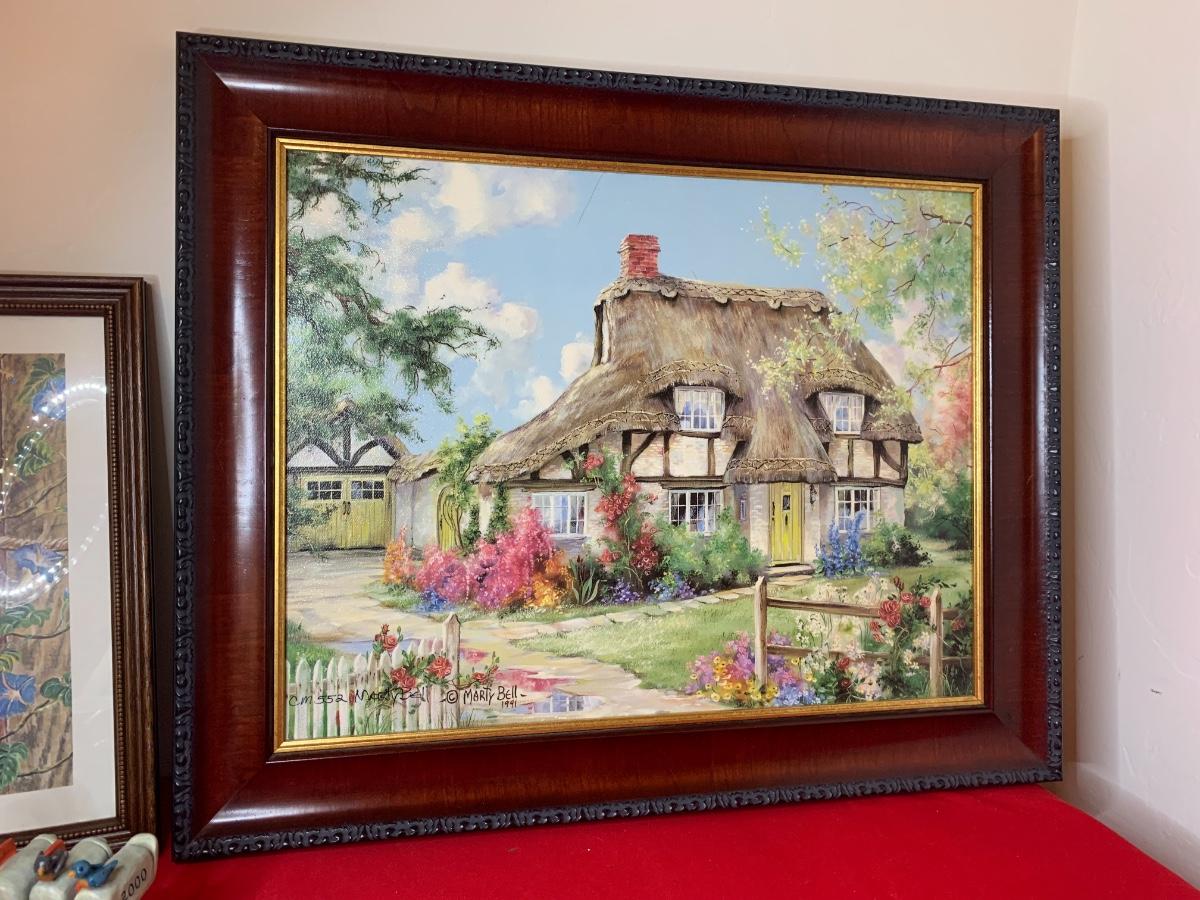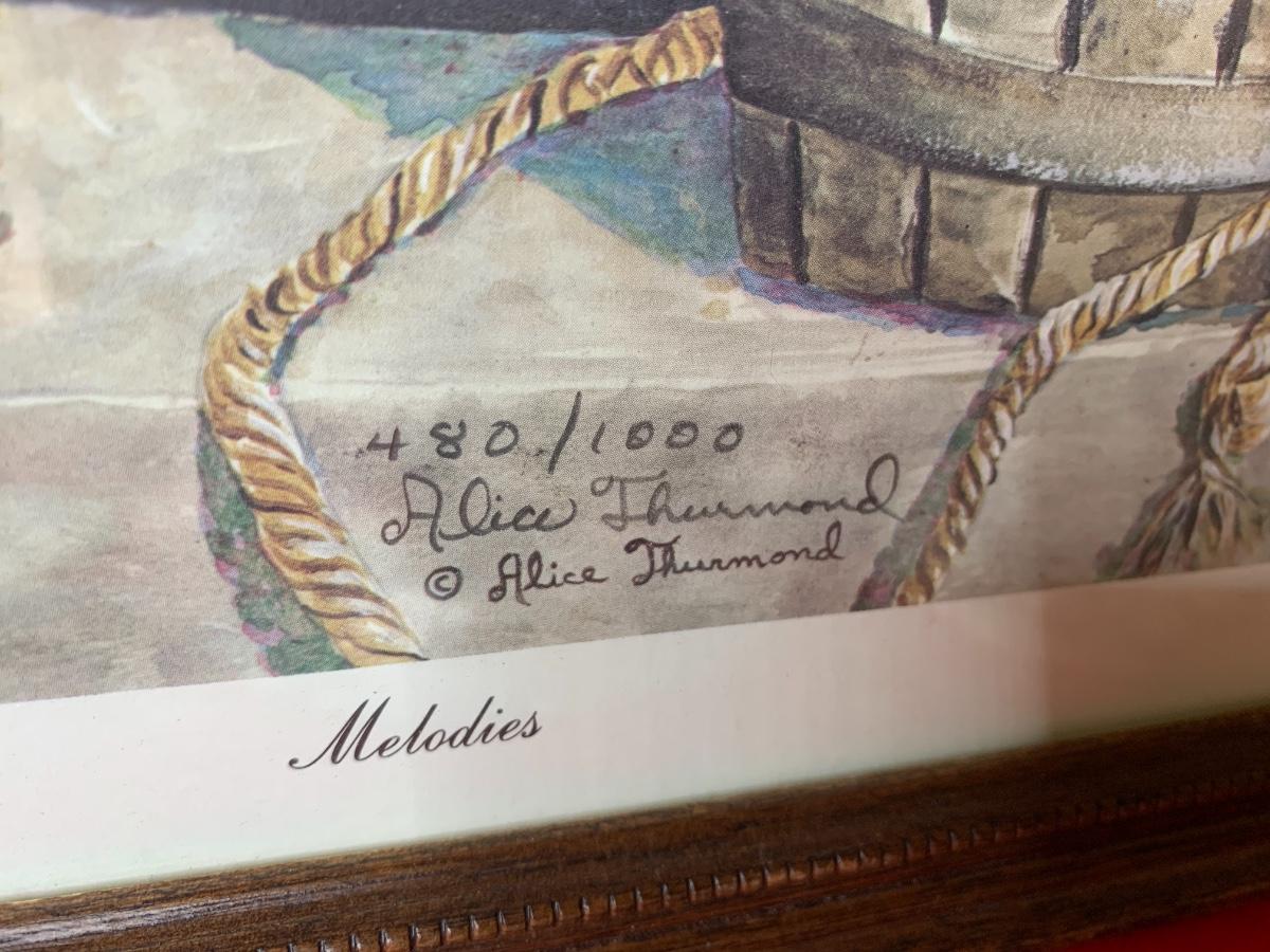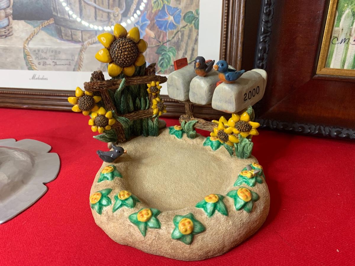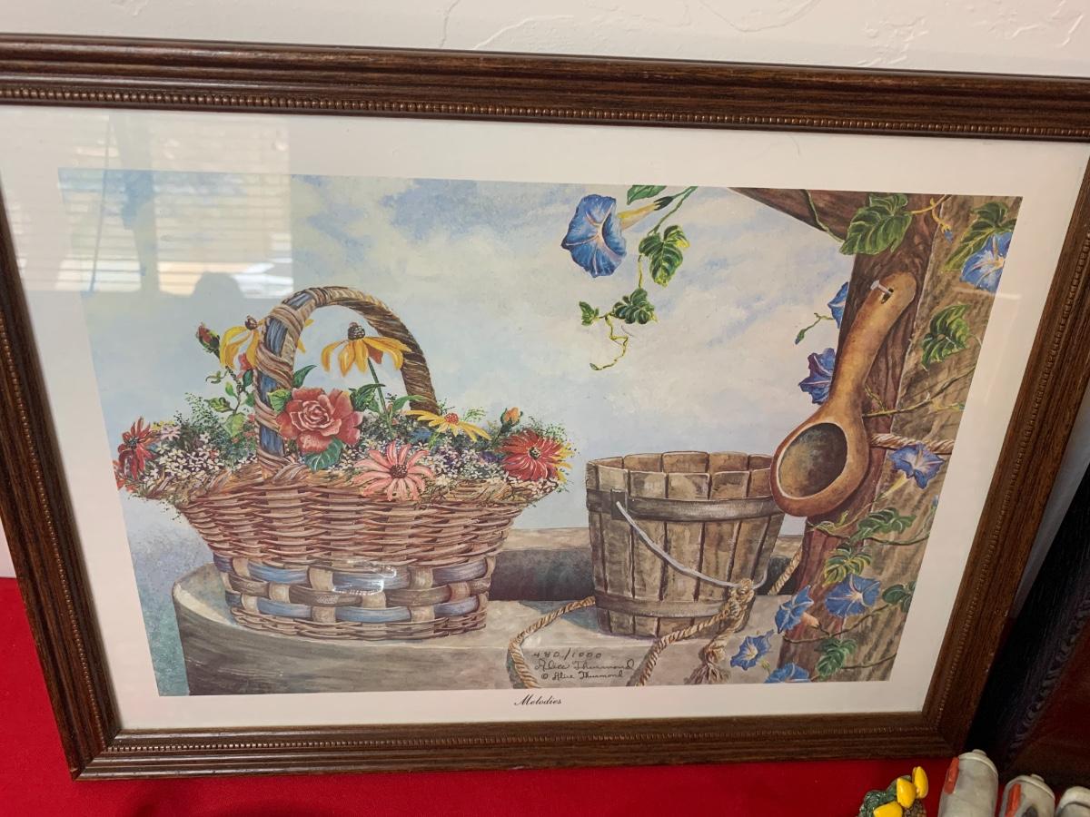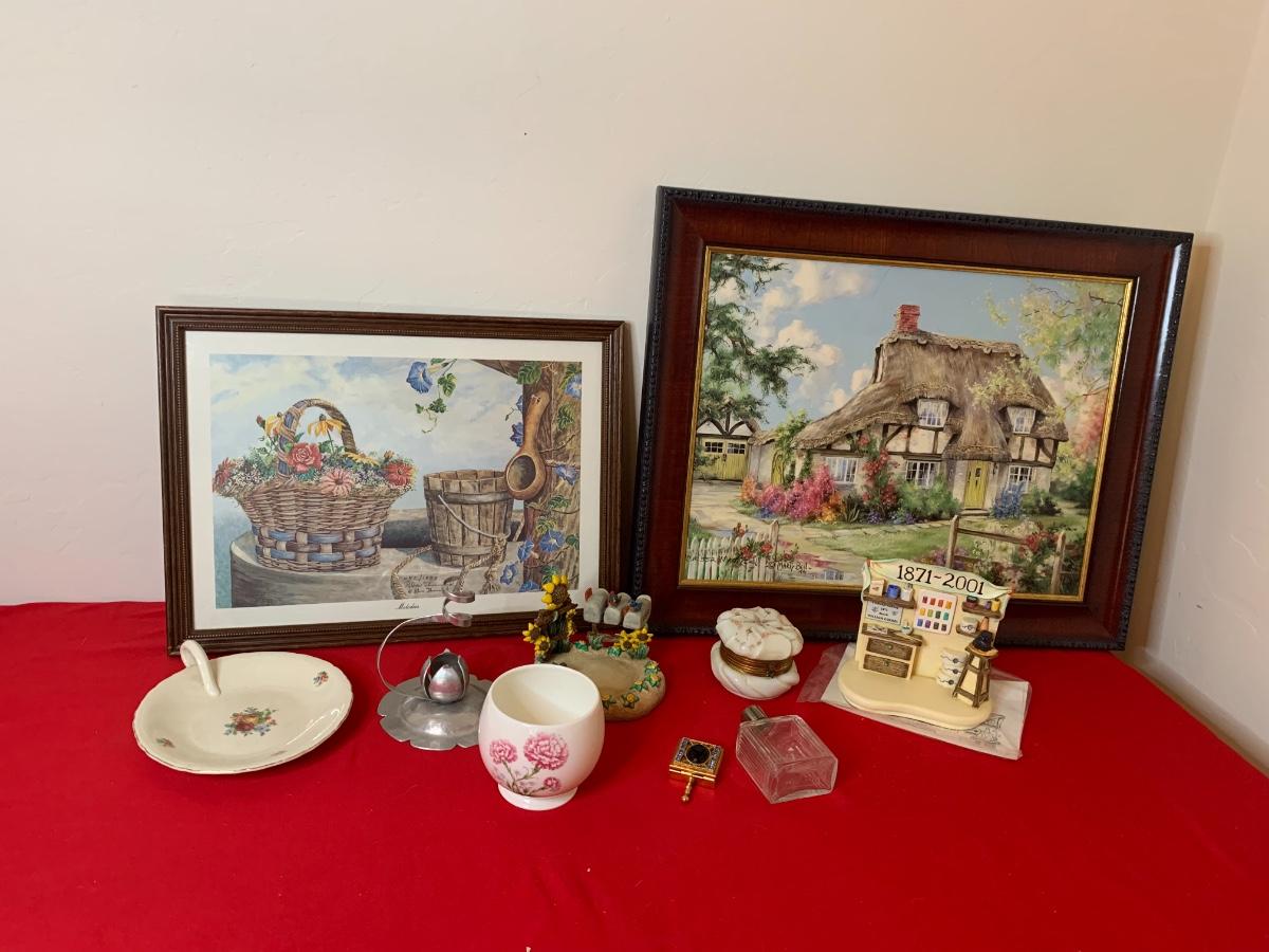 Lot includes art print by Alice Thurmund called Melodies 480/100. Also includes wood framed print by Marty Bell, a Noritake Mother’s Day flower bowl, a discreet ashtray with faux gems, Czech china, candle holder, Hummelscape, milk glass trinket box, and a Goebel artist Studio figurine. All in very good condition.