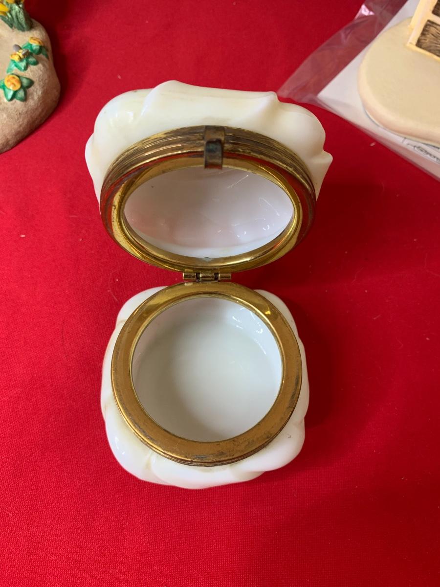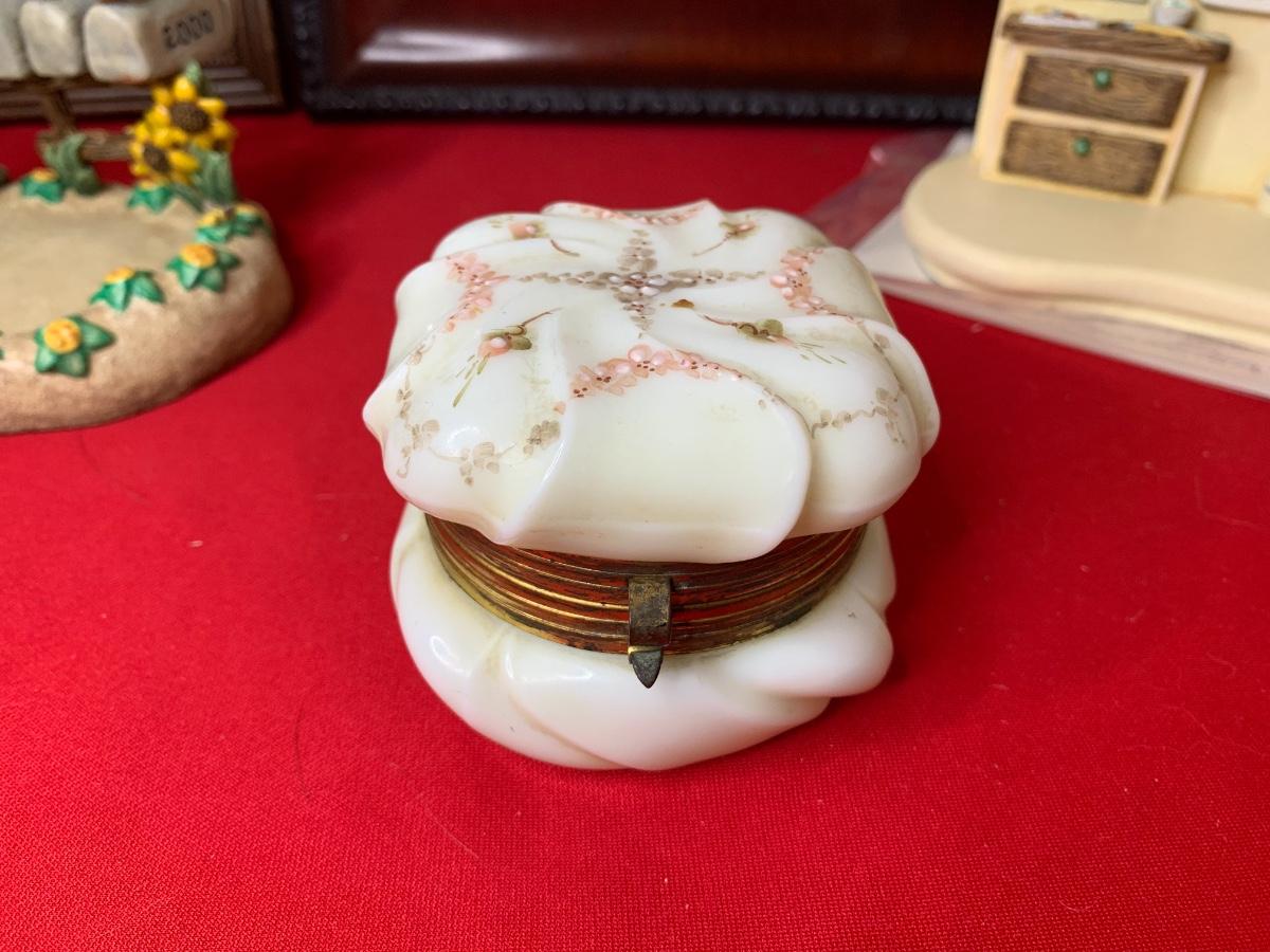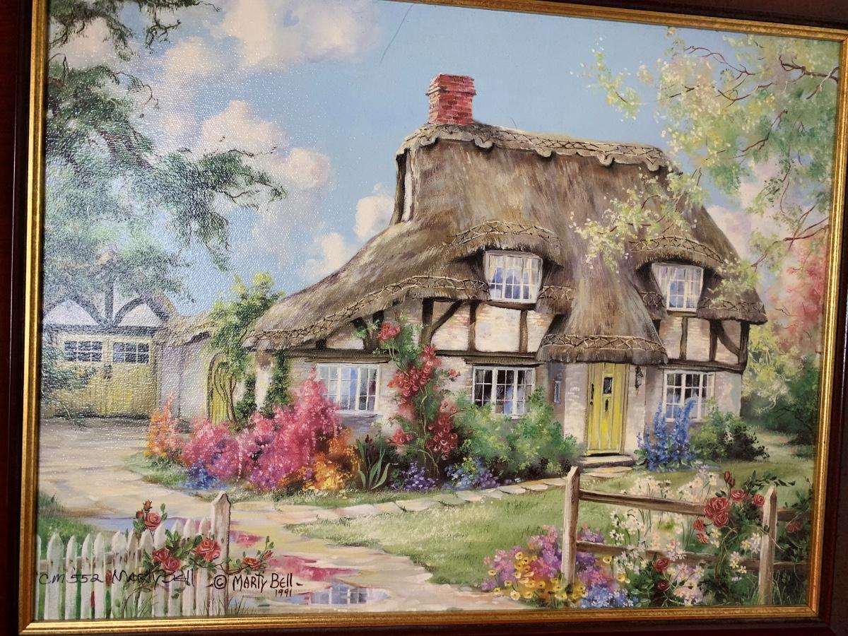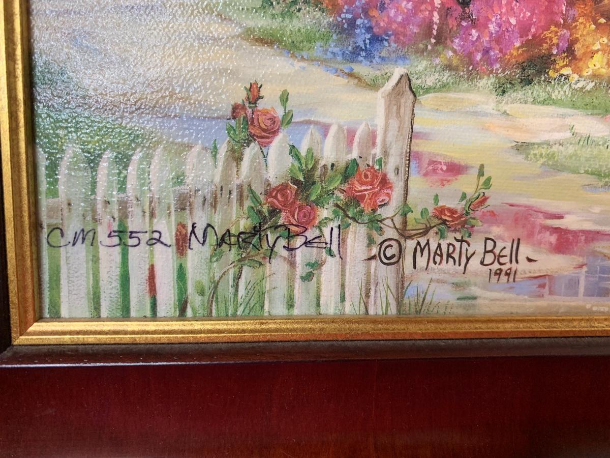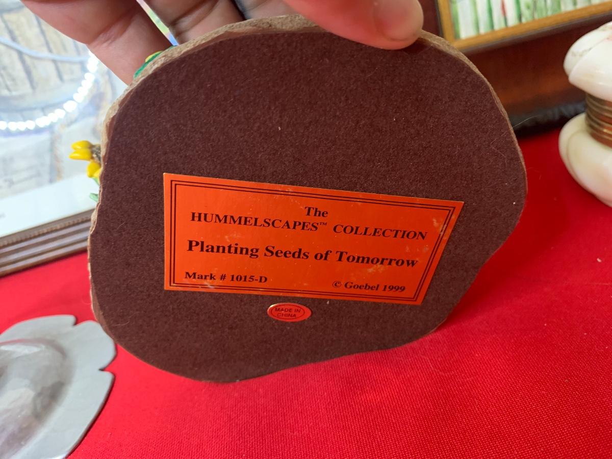 Lot includes art print by Alice Thurmund called Melodies 480/100. Also includes wood framed print by Marty Bell, a Noritake Mother’s Day flower bowl, a discreet ashtray with faux gems, Czech china, candle holder, Hummelscape, milk glass trinket box, and a Goebel artist Studio figurine. All in very good condition.
