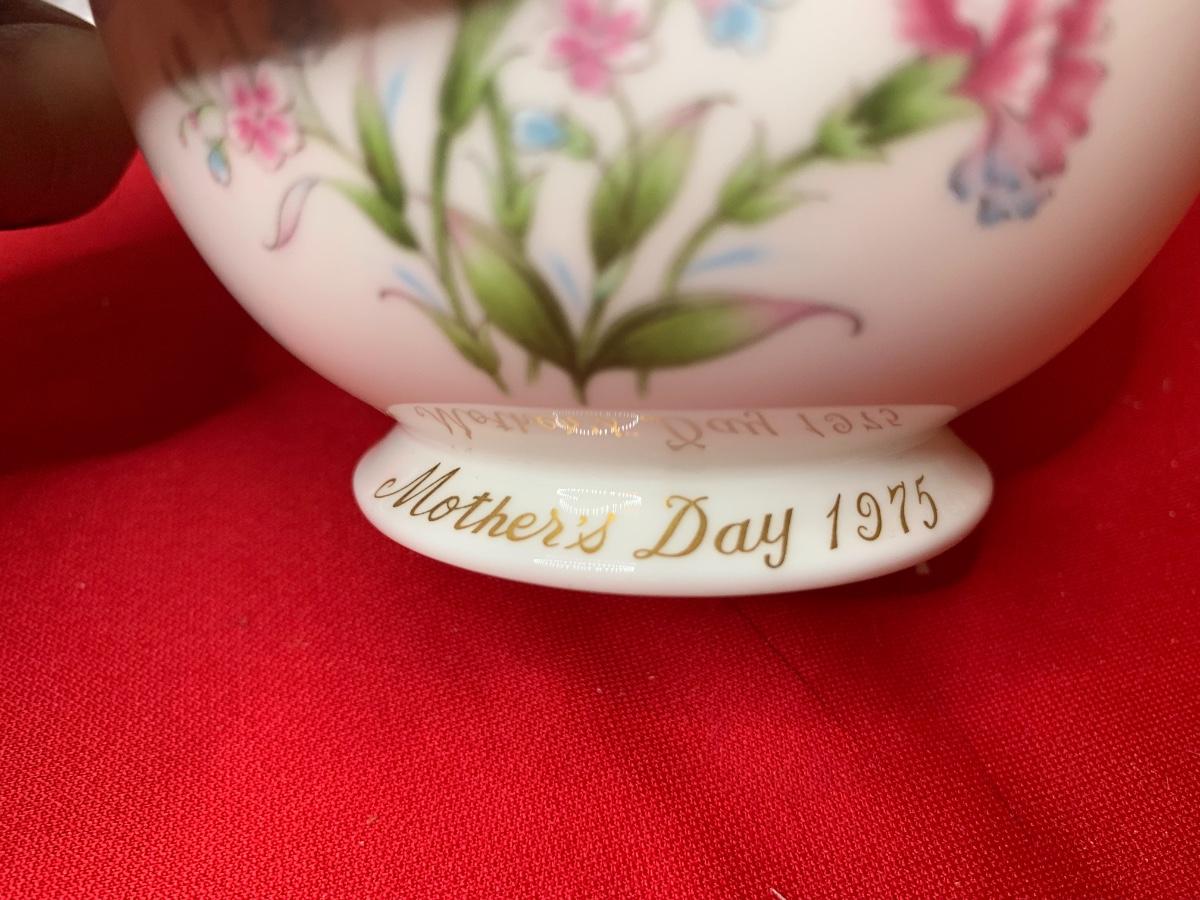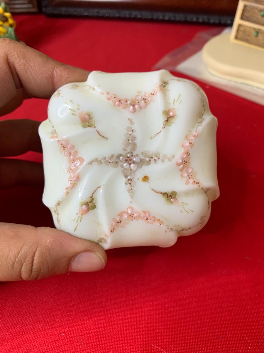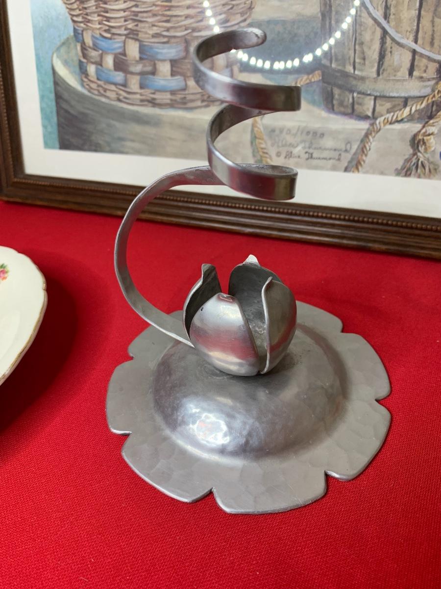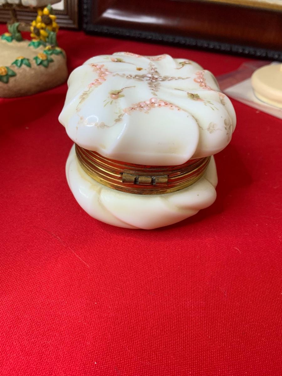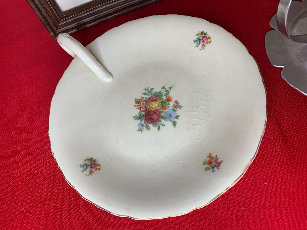 Lot includes art print by Alice Thurmund called Melodies 480/100. Also includes wood framed print by Marty Bell, a Noritake Mother’s Day flower bowl, a discreet ashtray with faux gems, Czech china, candle holder, Hummelscape, milk glass trinket box, and a Goebel artist Studio figurine. All in very good condition.