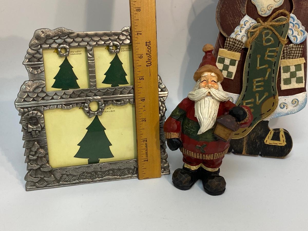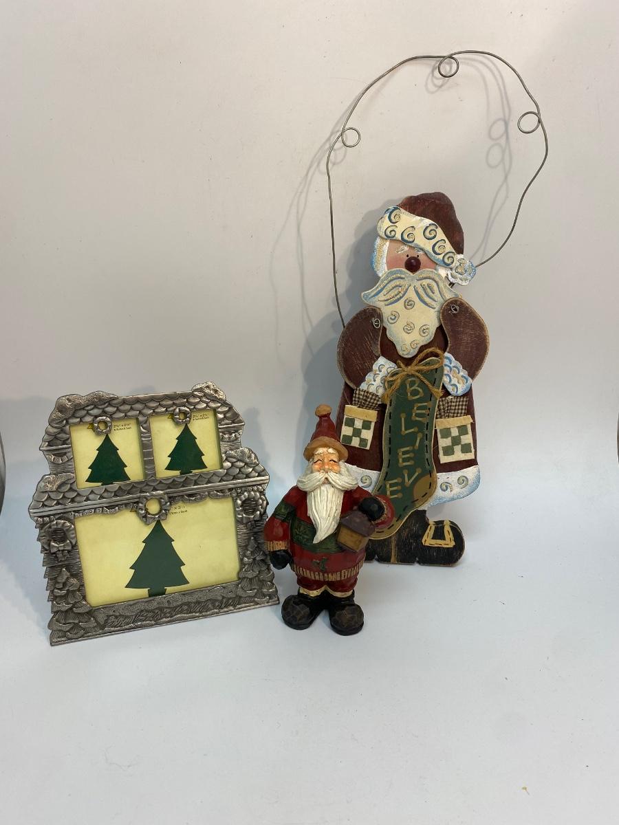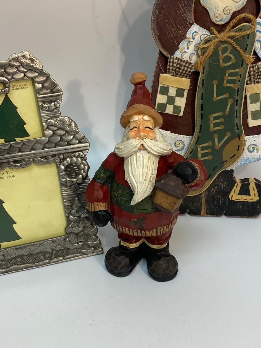 Country Rustic Christmas Seasonal Holiday Home Decor Santa Claus Picture Frame. All pieces are in good condition. The short Santa figurine looks like Jim Shore but no branding on it.