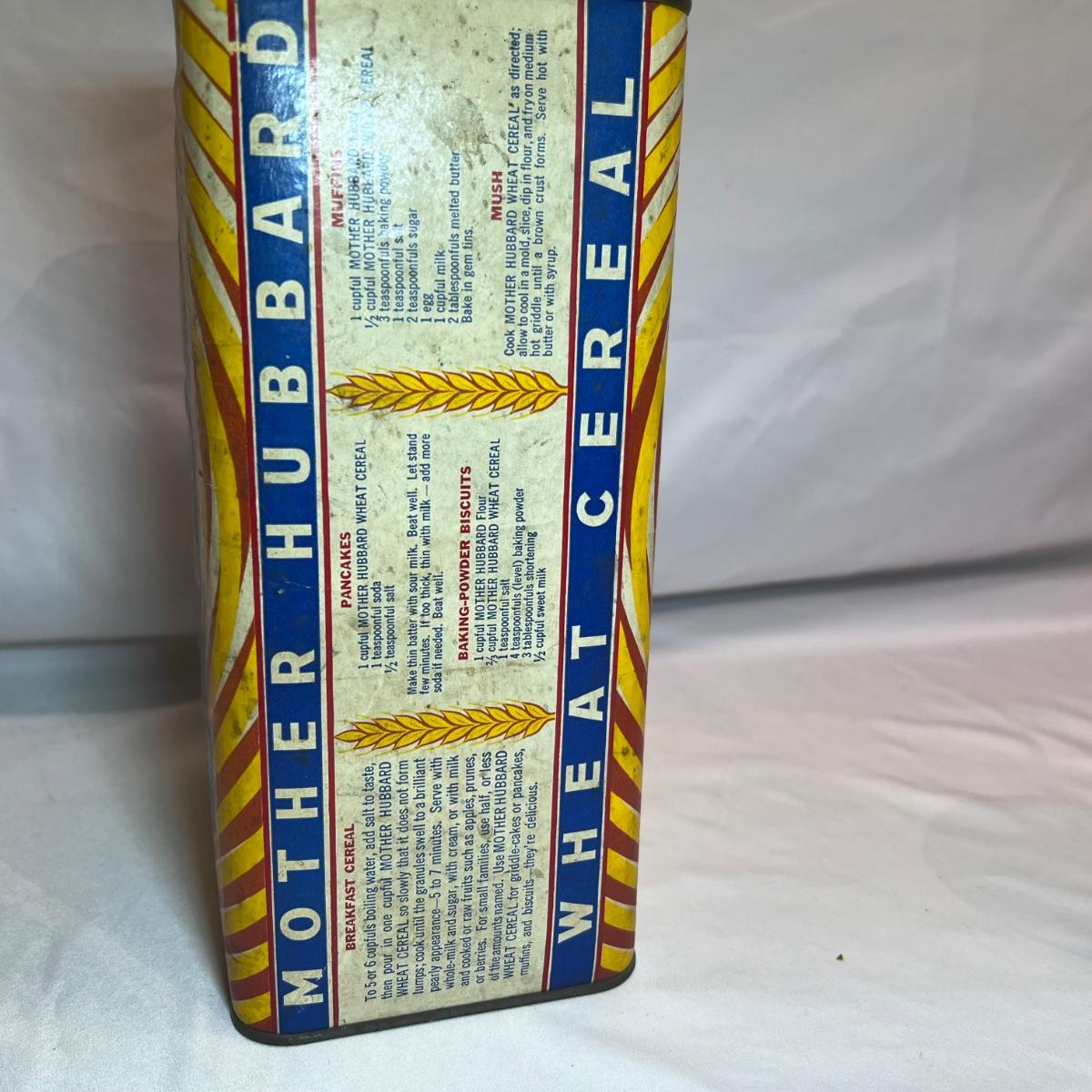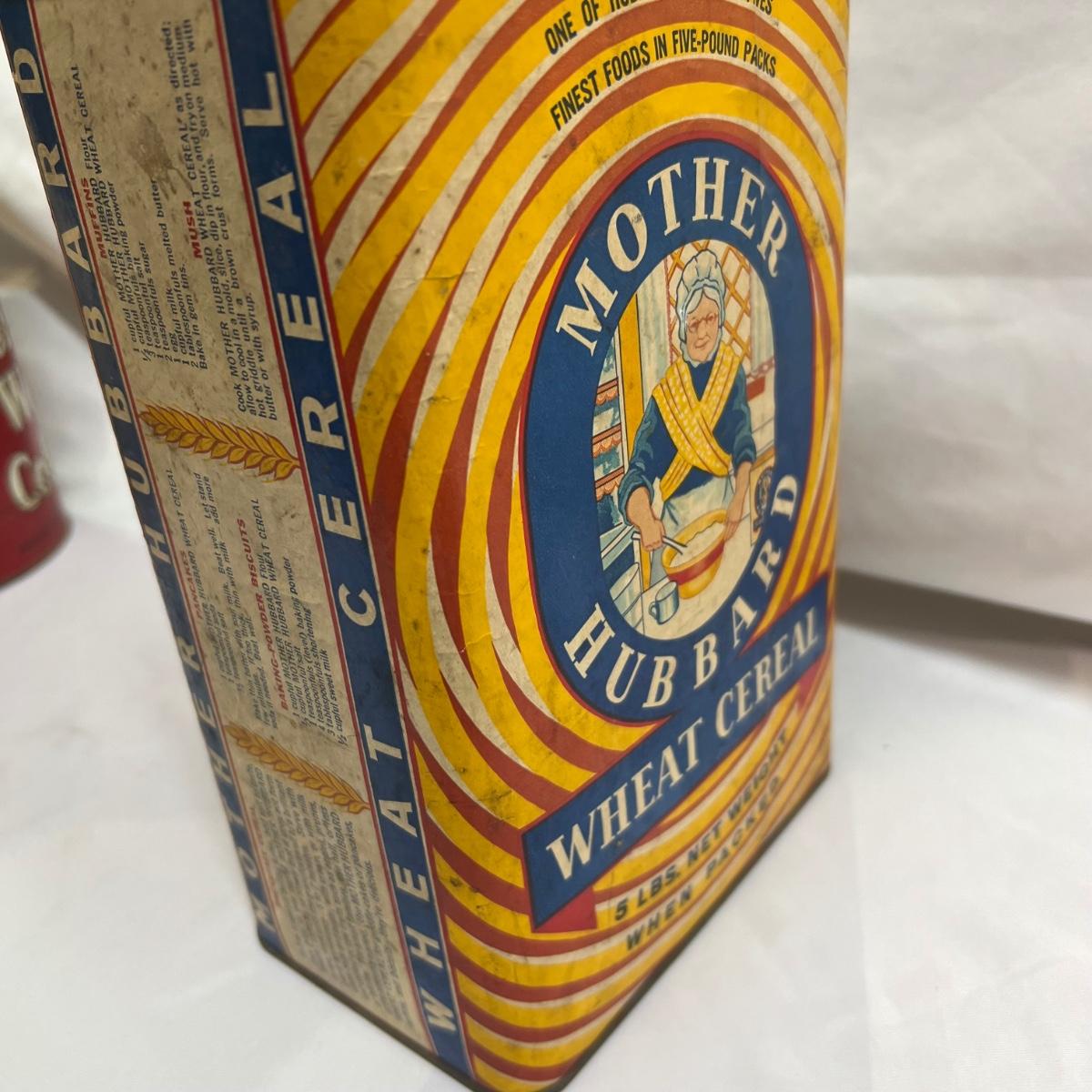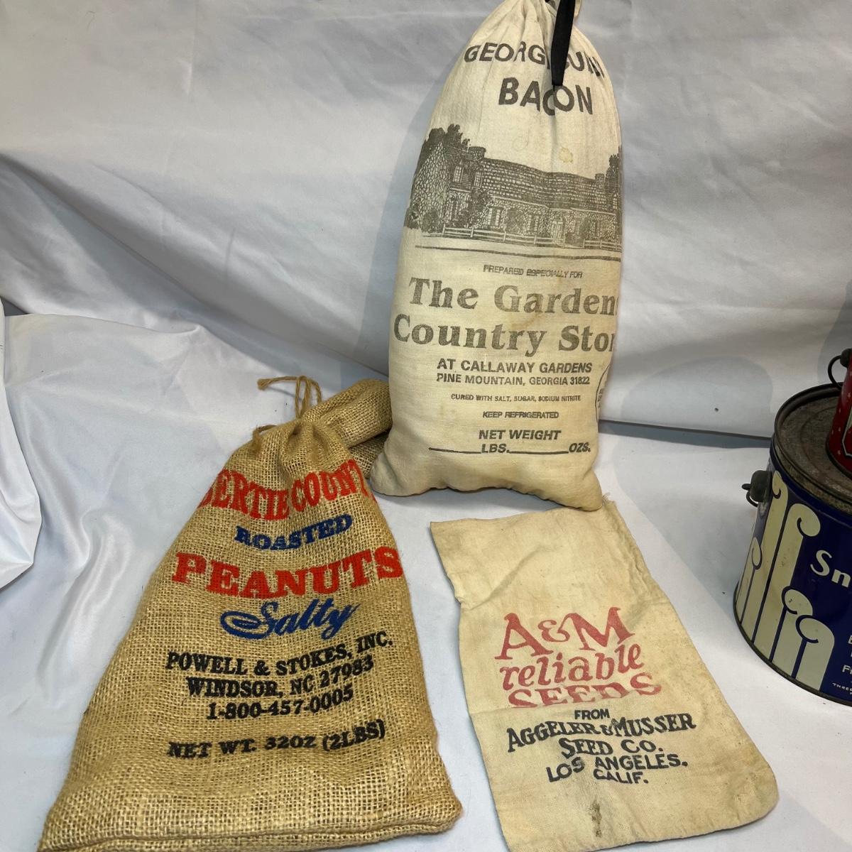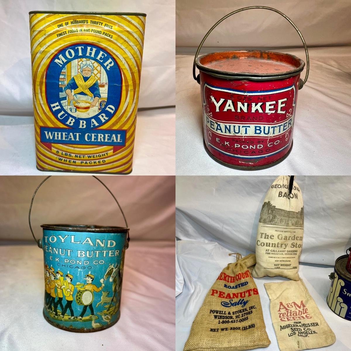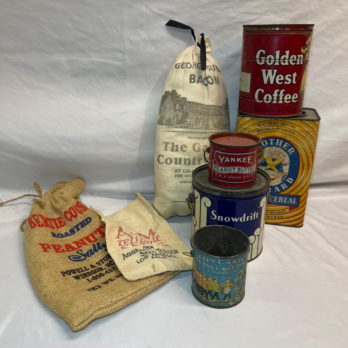 Five collectible tins and three sacks. The bacon sack has some sort of foam like filling, it measures approximately 7.5” x 15”H. The only tin that has contents is the Mother Hubbard Cereal large tin, we cannot authenticate its contents; it measures 6” x 4.5” x 9.5”.