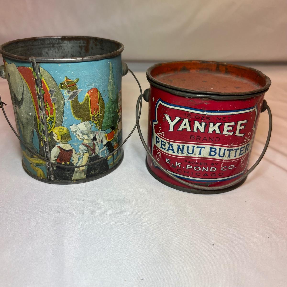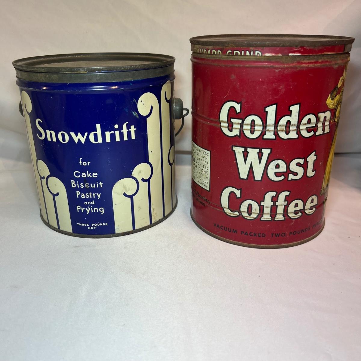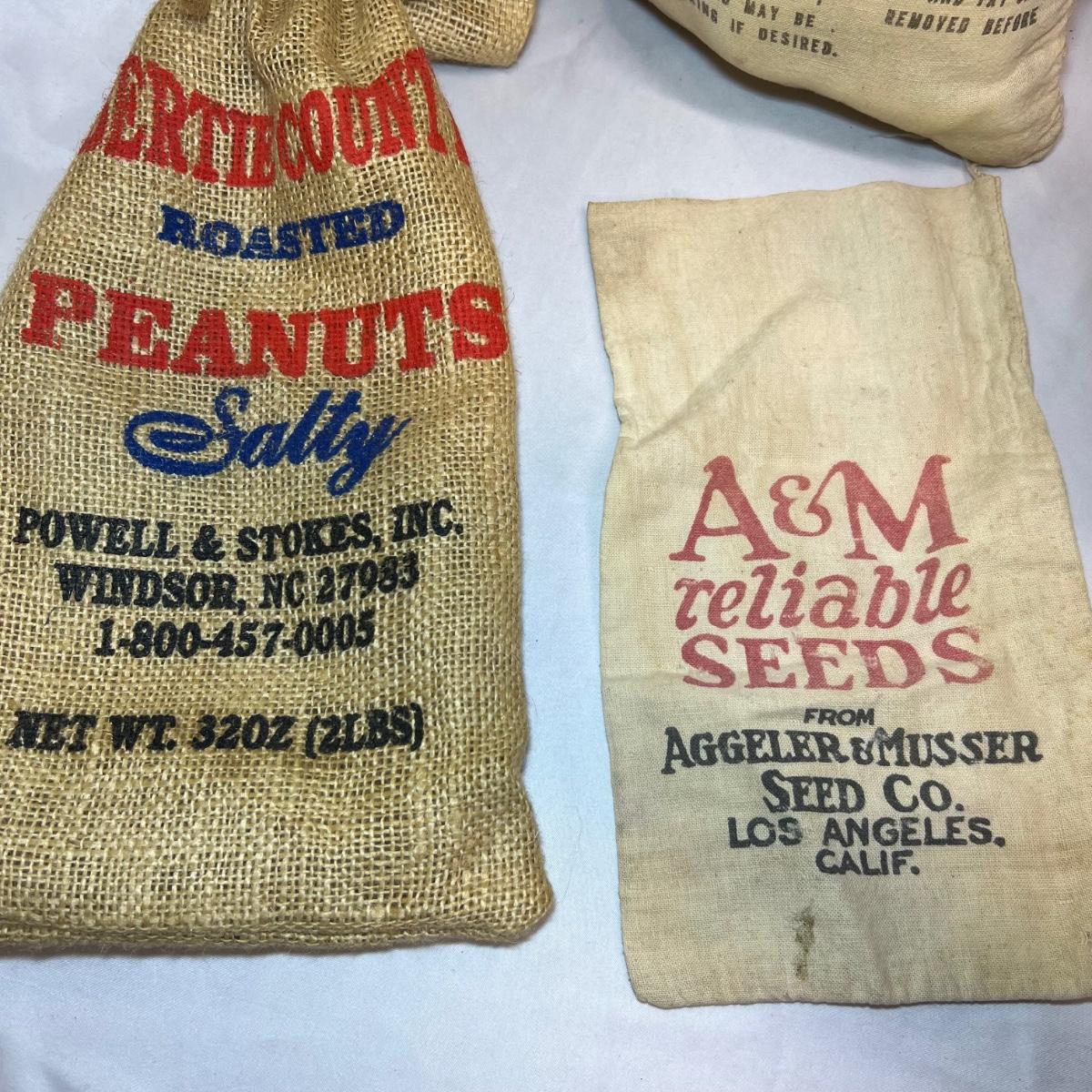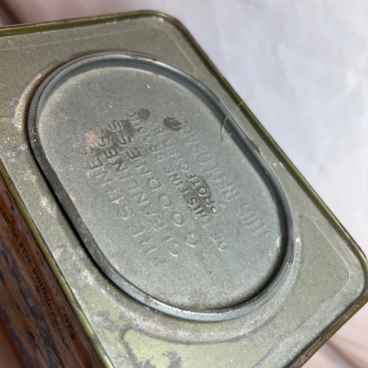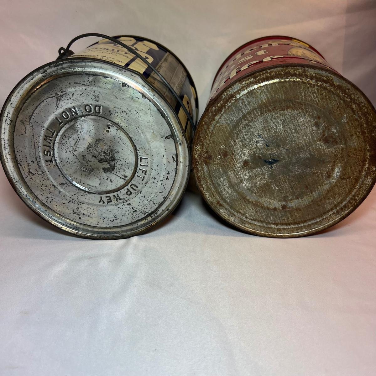 Five collectible tins and three sacks. The bacon sack has some sort of foam like filling, it measures approximately 7.5” x 15”H. The only tin that has contents is the Mother Hubbard Cereal large tin, we cannot authenticate its contents; it measures 6” x 4.5” x 9.5”.