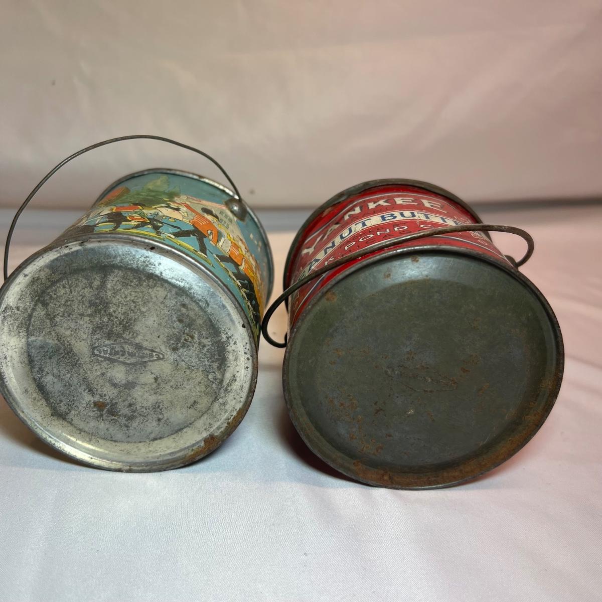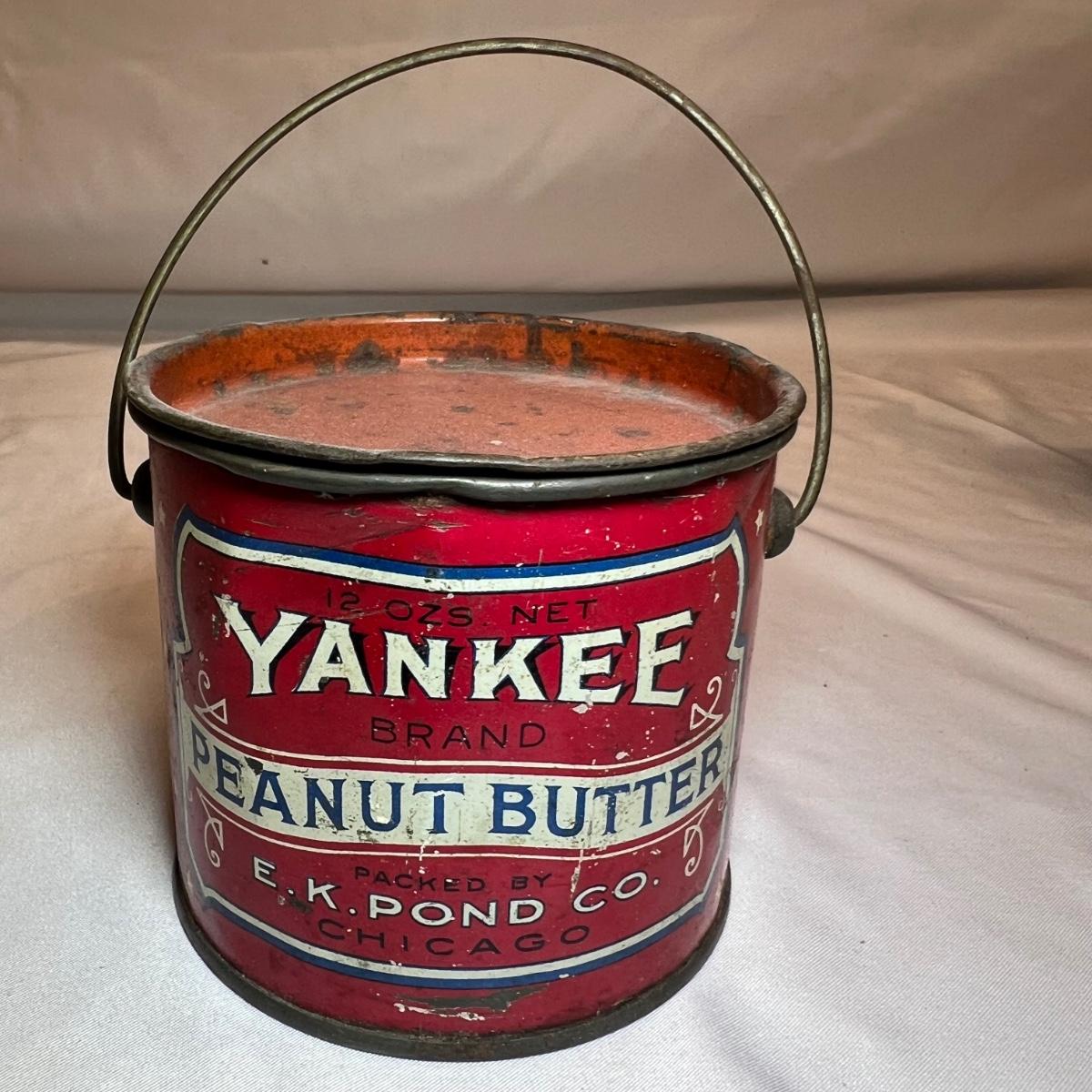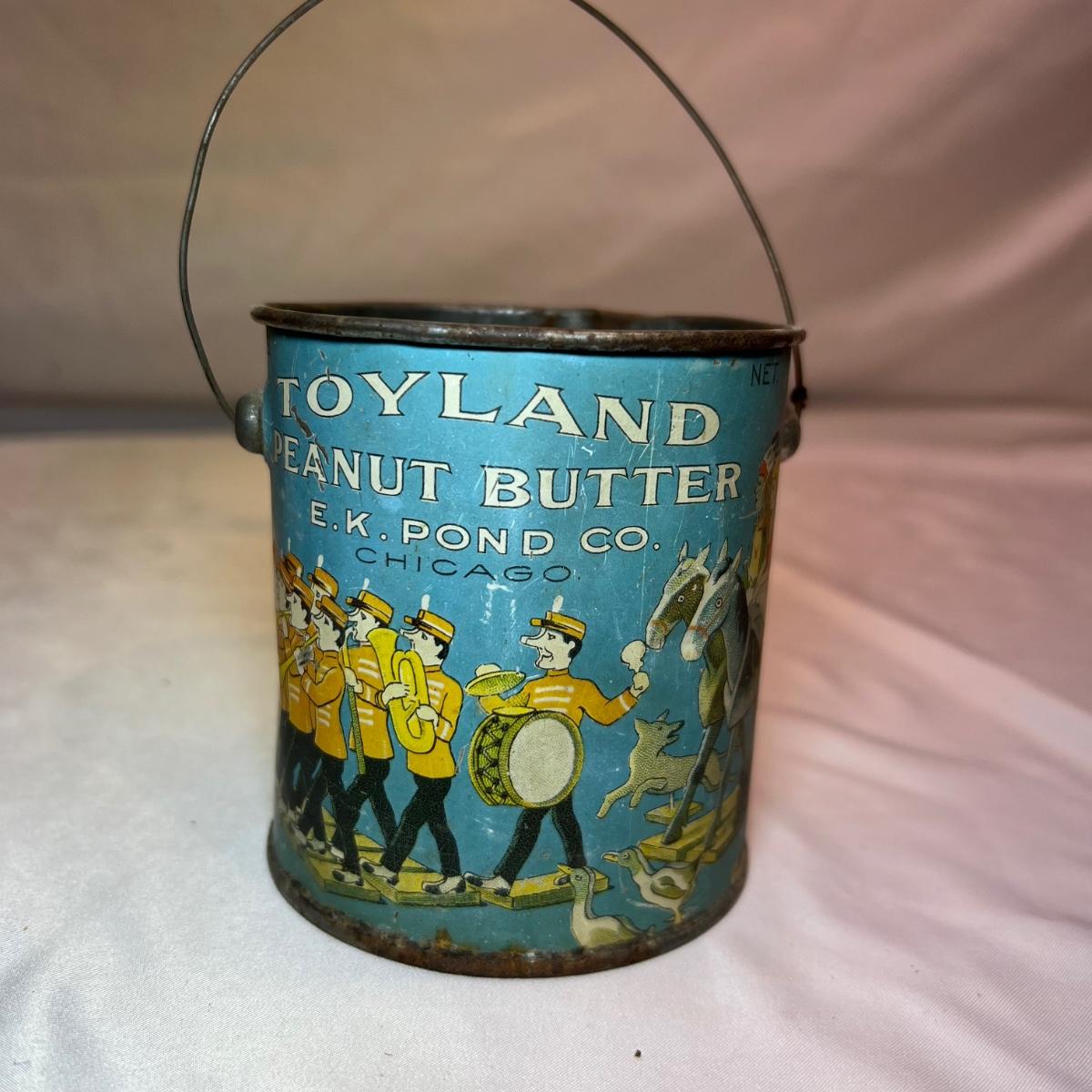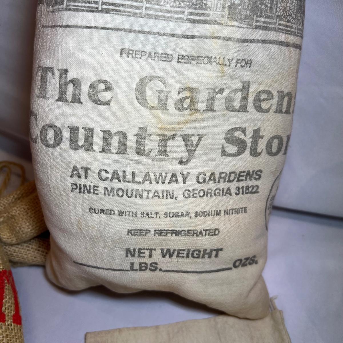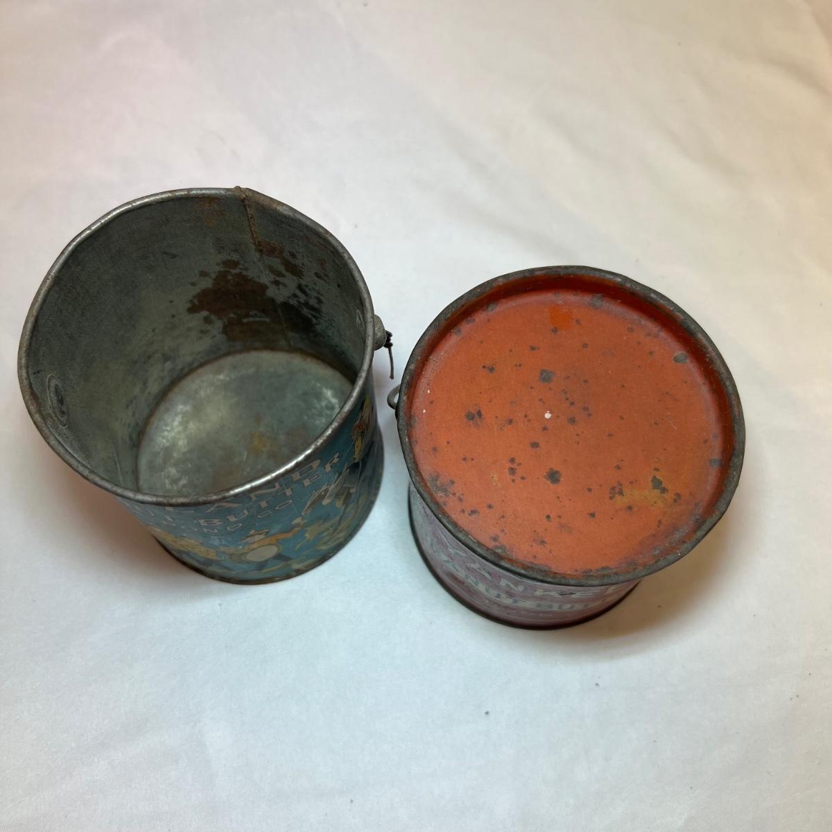 Five collectible tins and three sacks. The bacon sack has some sort of foam like filling, it measures approximately 7.5” x 15”H. The only tin that has contents is the Mother Hubbard Cereal large tin, we cannot authenticate its contents; it measures 6” x 4.5” x 9.5”.