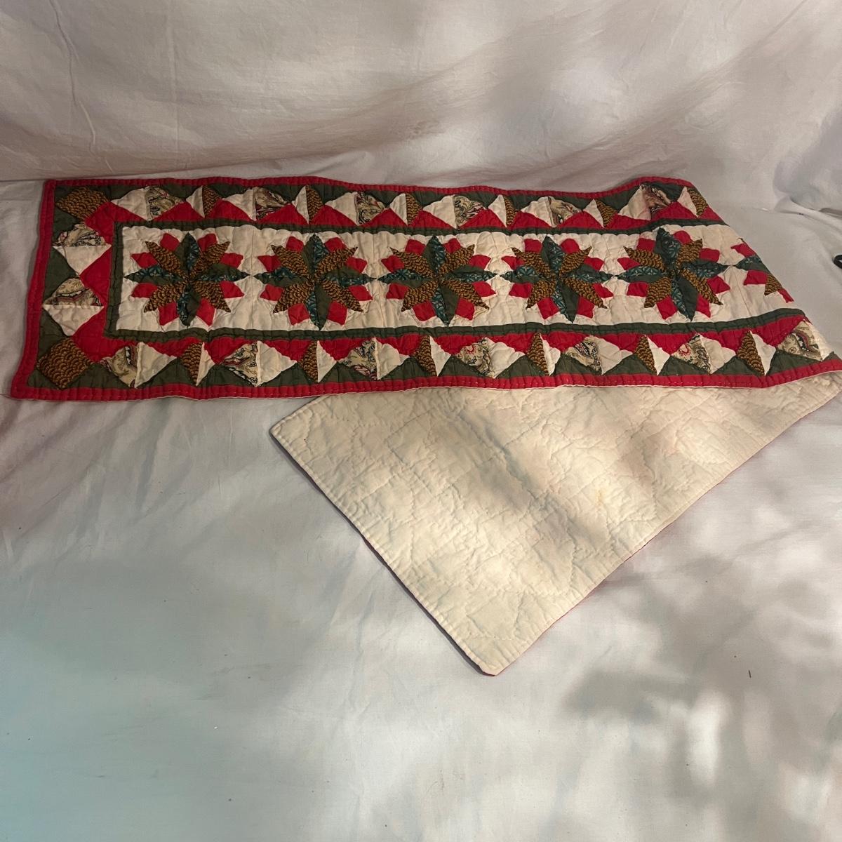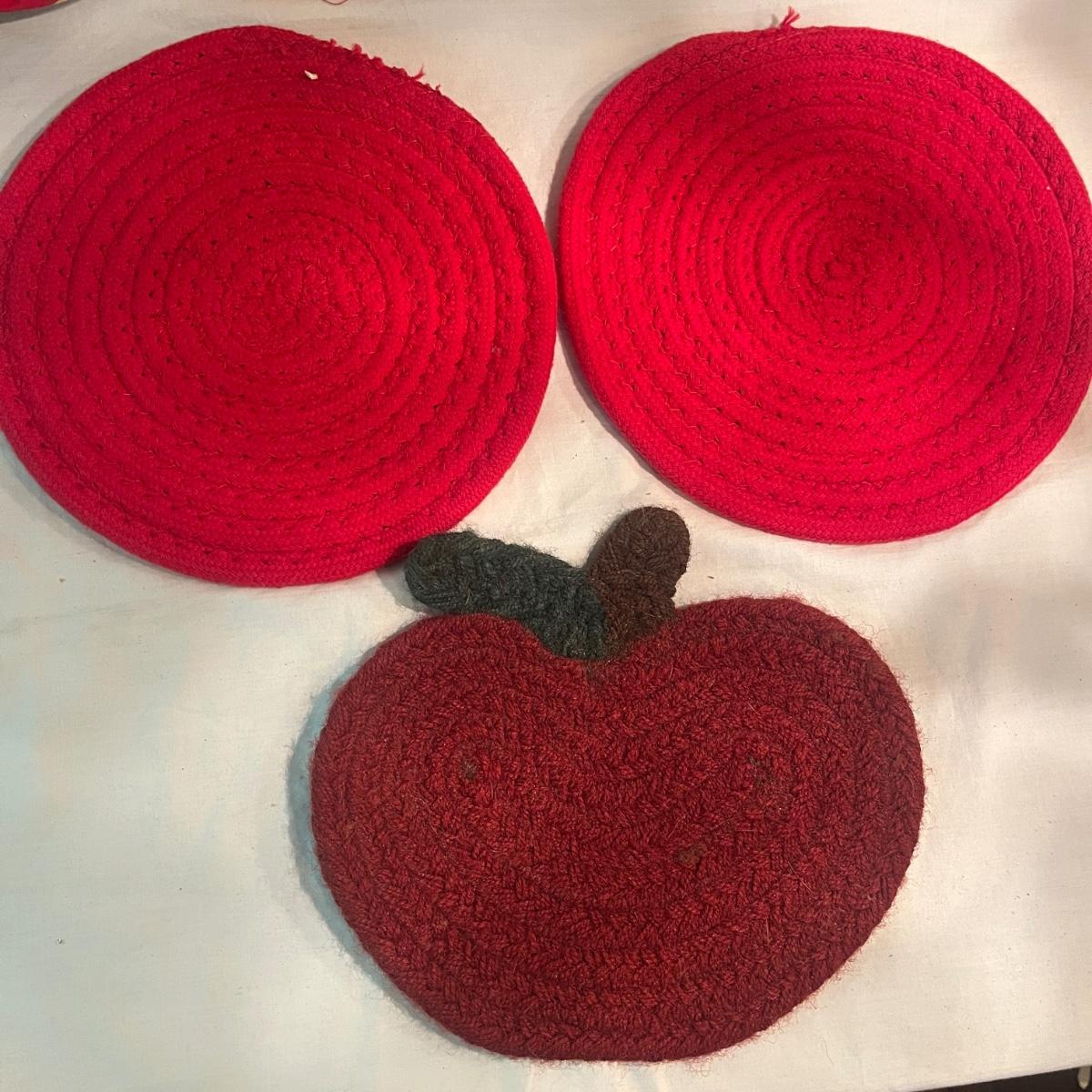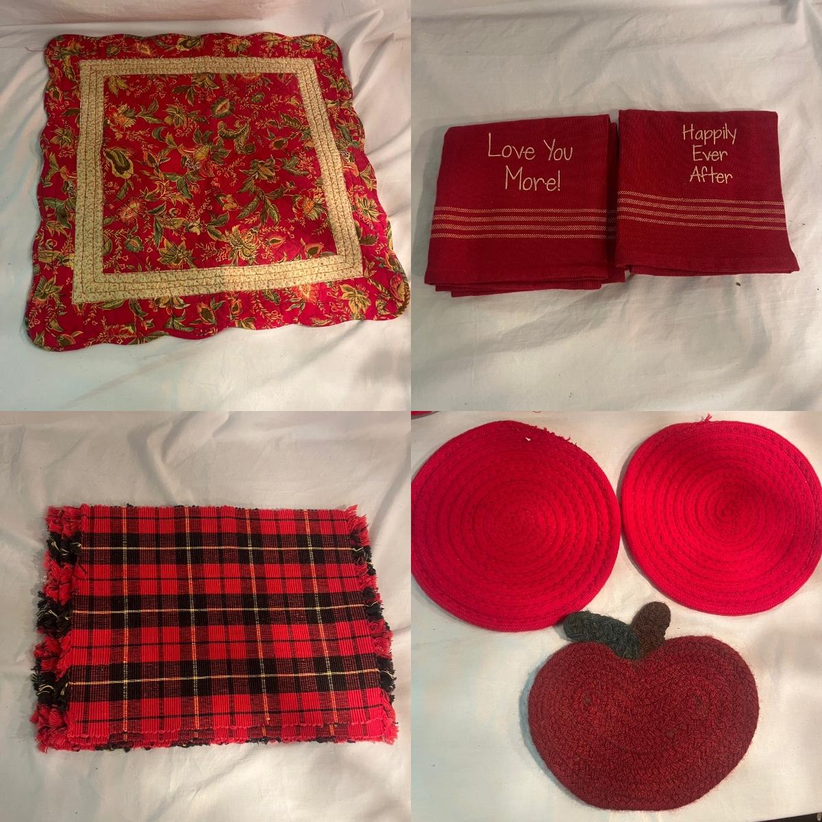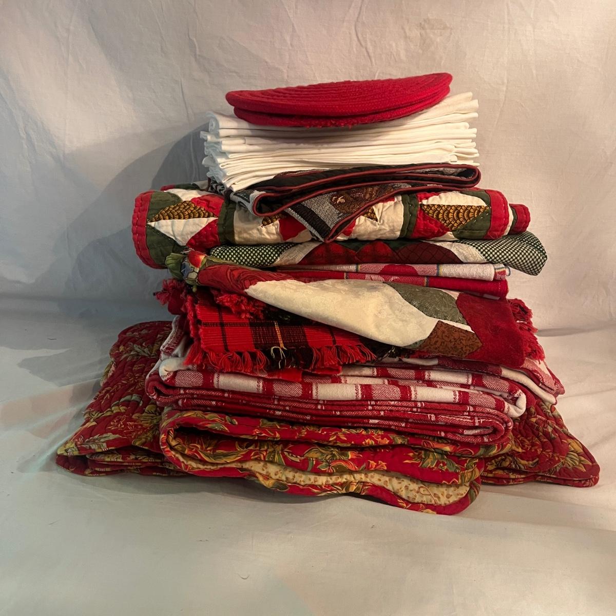 Lot includes a selection of napkins, trivets, table runners, placemats and a tablecloth that measures 84” x 54”.