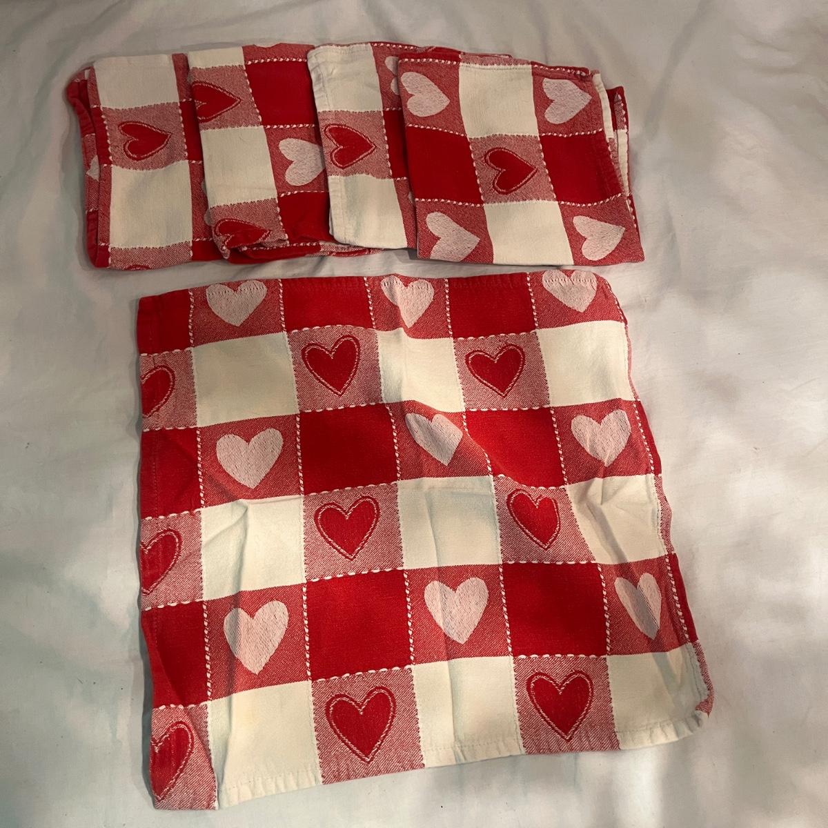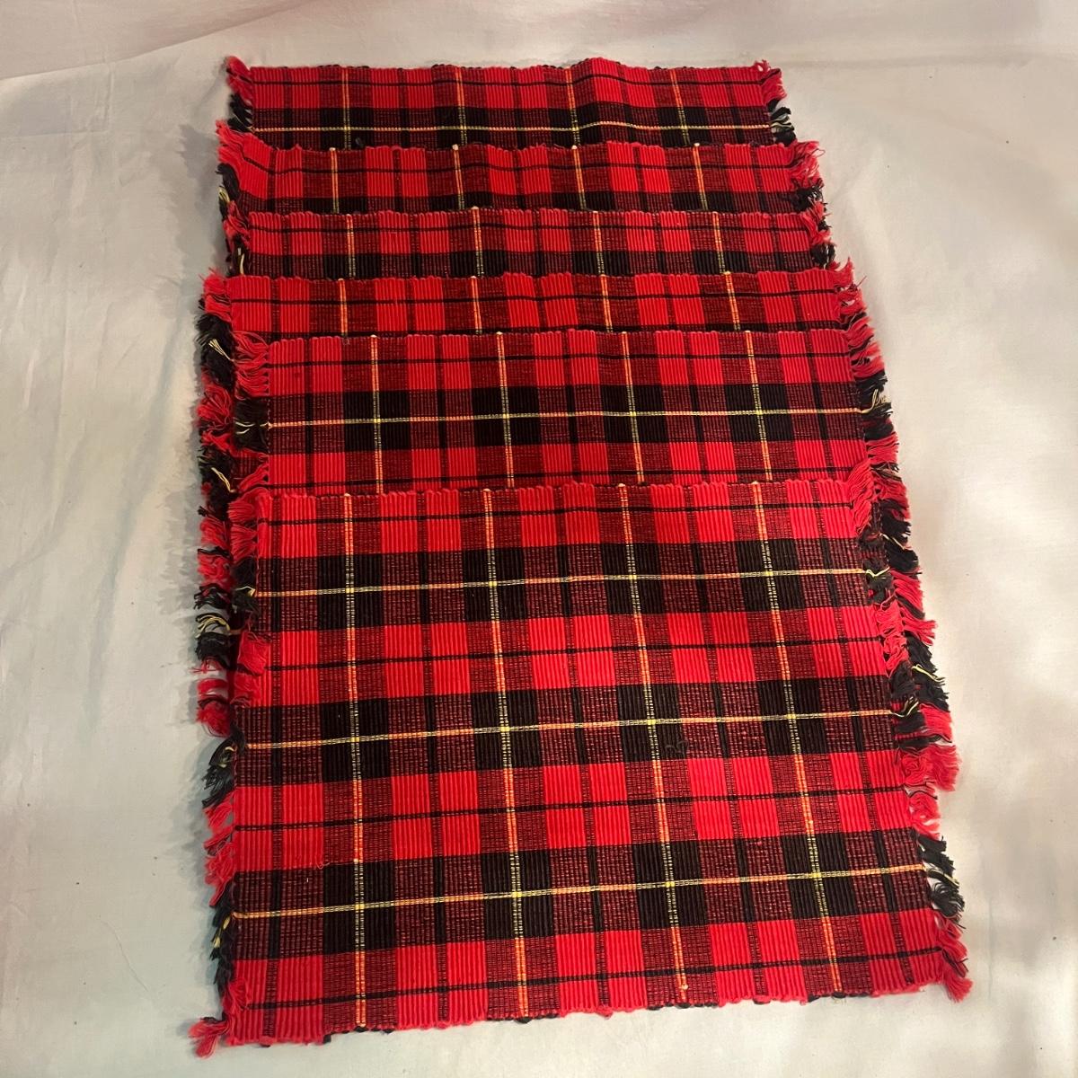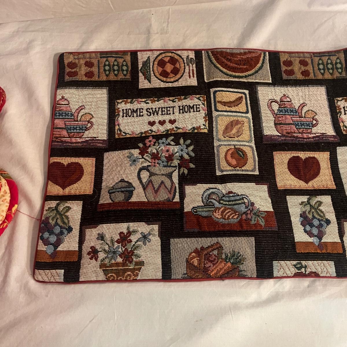 Lot includes a selection of napkins, trivets, table runners, placemats and a tablecloth that measures 84” x 54”.