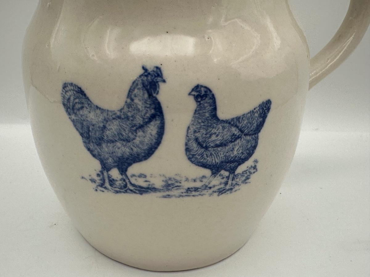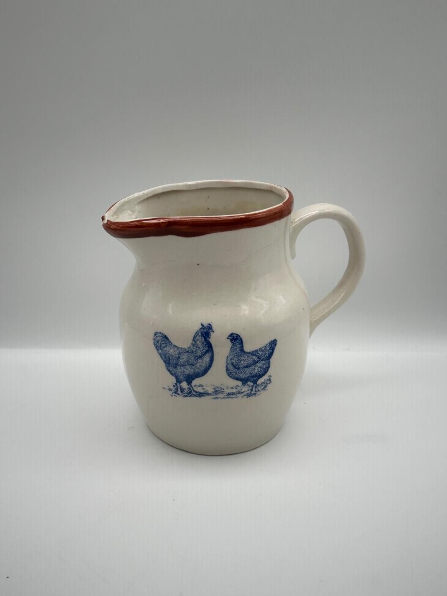 Farmhouse-style ceramic pitcher featuring a pair of blue chickens on the front.