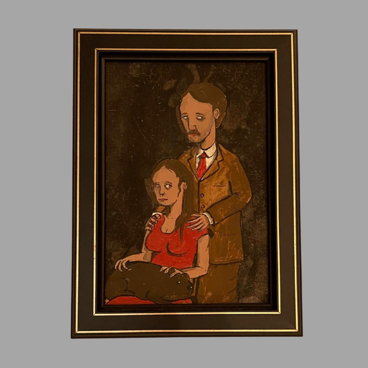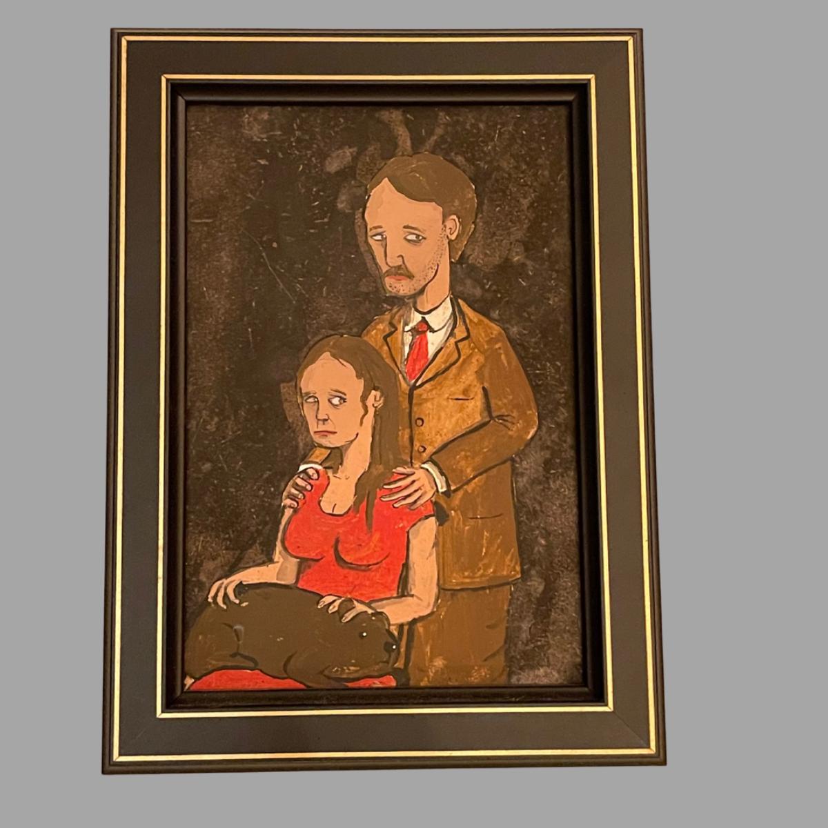 A local artist was asked to do a portrait of a man and his wife. This picture was done as a takeoff of the original but with a nutria on the wife’s lap. Comical rendition. Measures 6 x 8