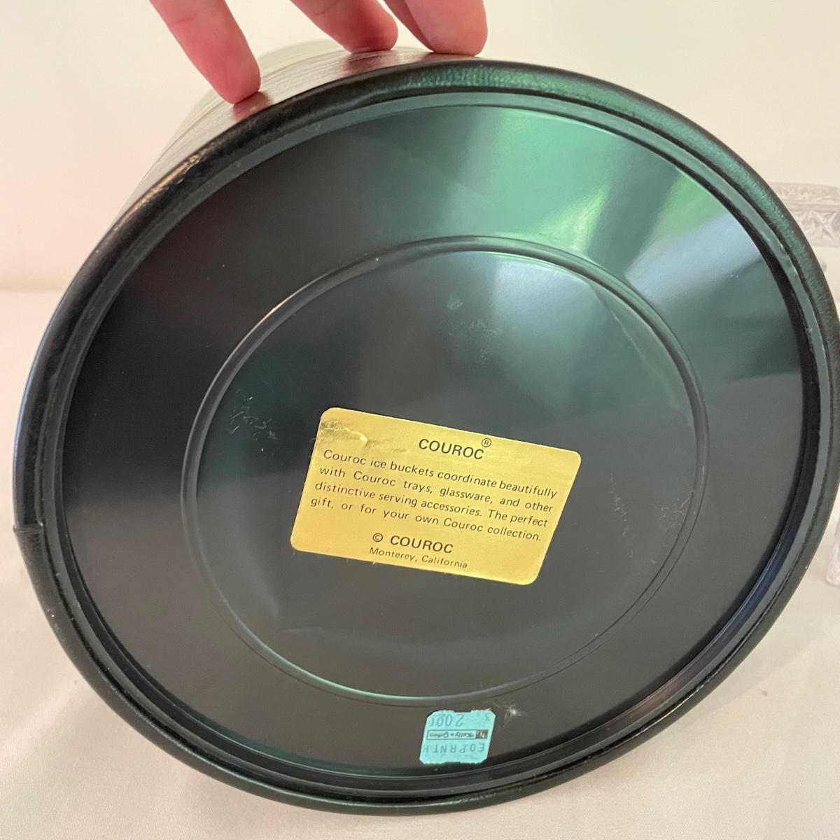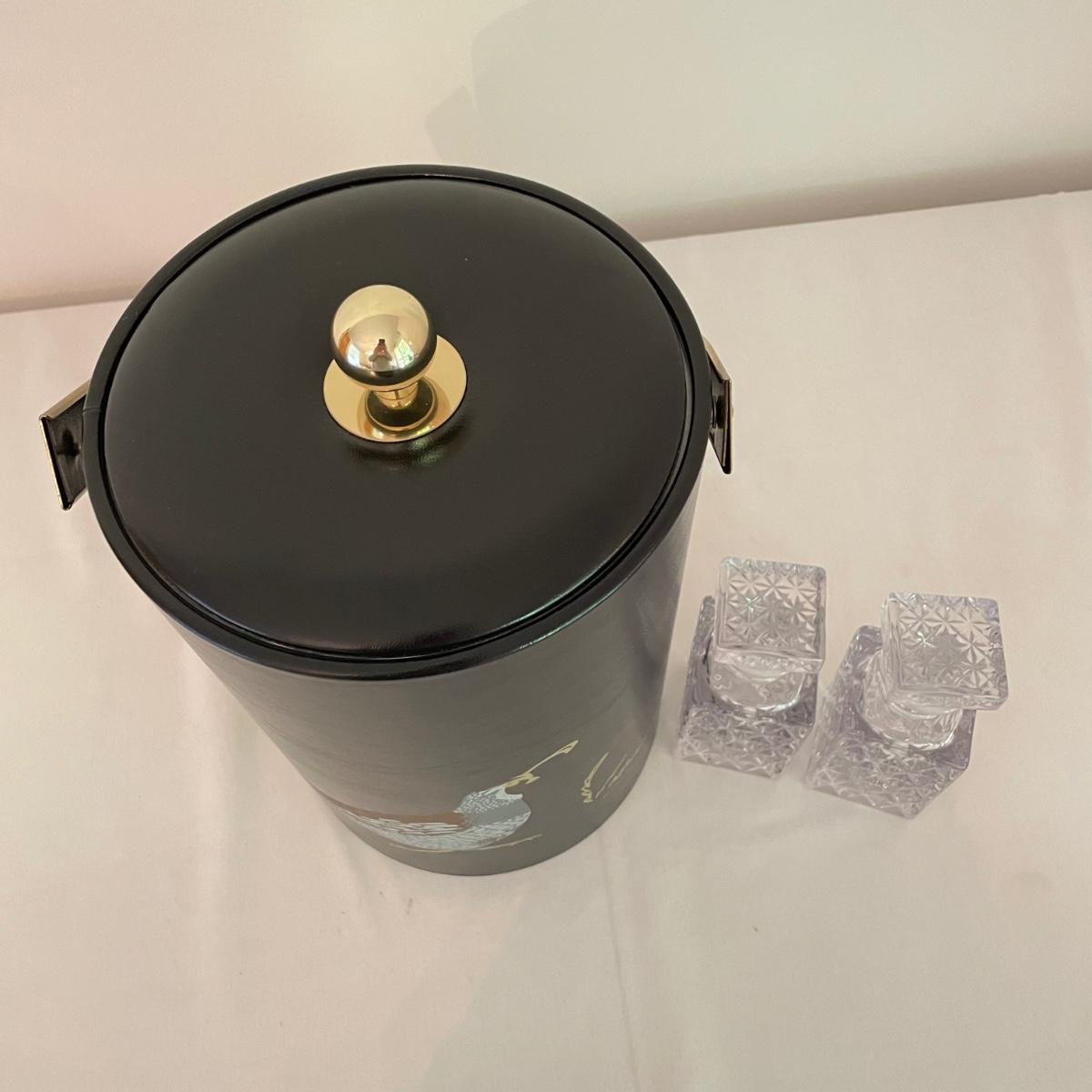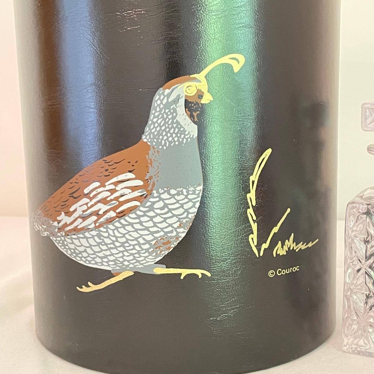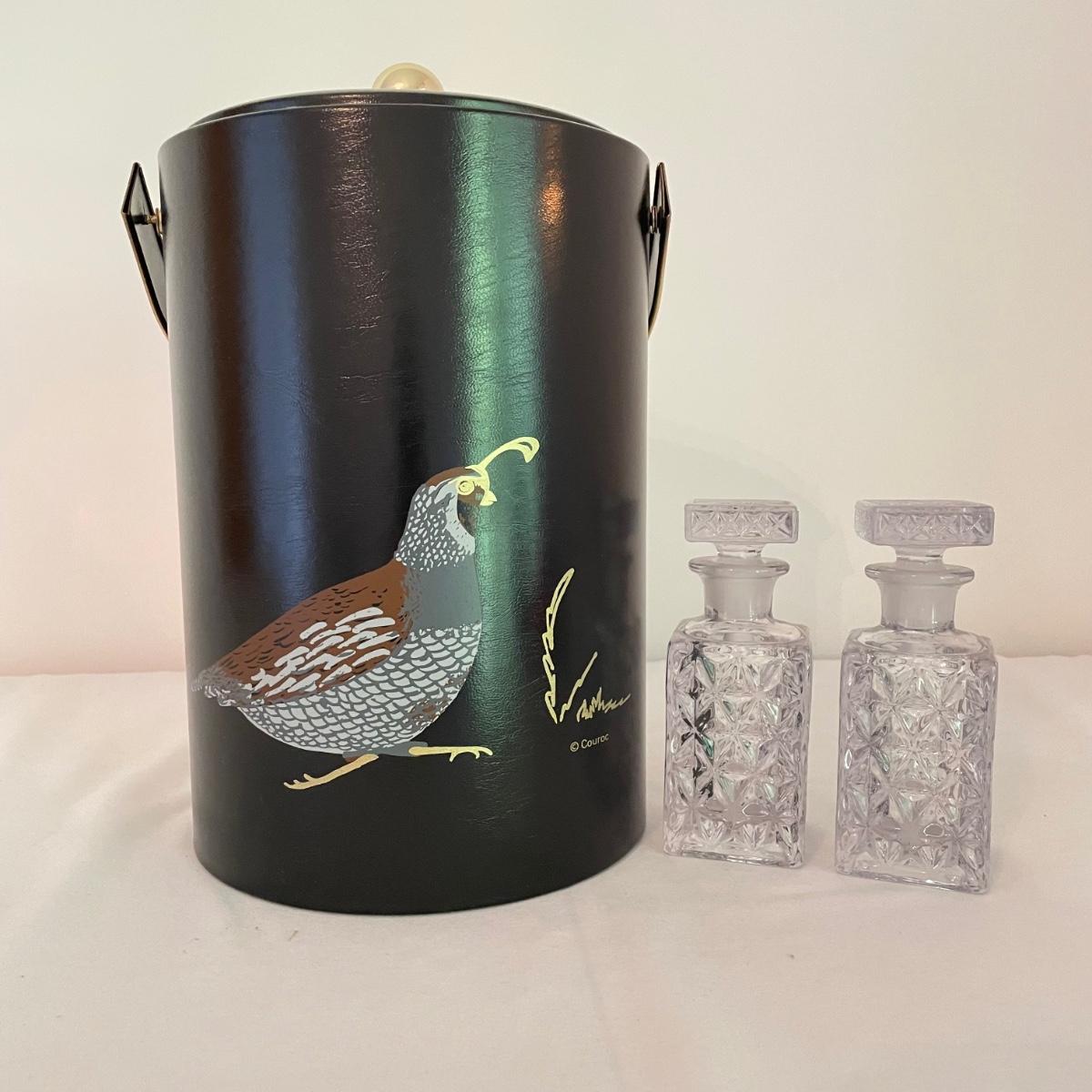 Couroc ice bucket has a leather like cover with lid and a quail featured on one side. Decanter without handle or lid measures 7.75”D x 11”H. Lot also includes two 5.5”H glass decanters with frosted stoppers. See images. Shipping available.