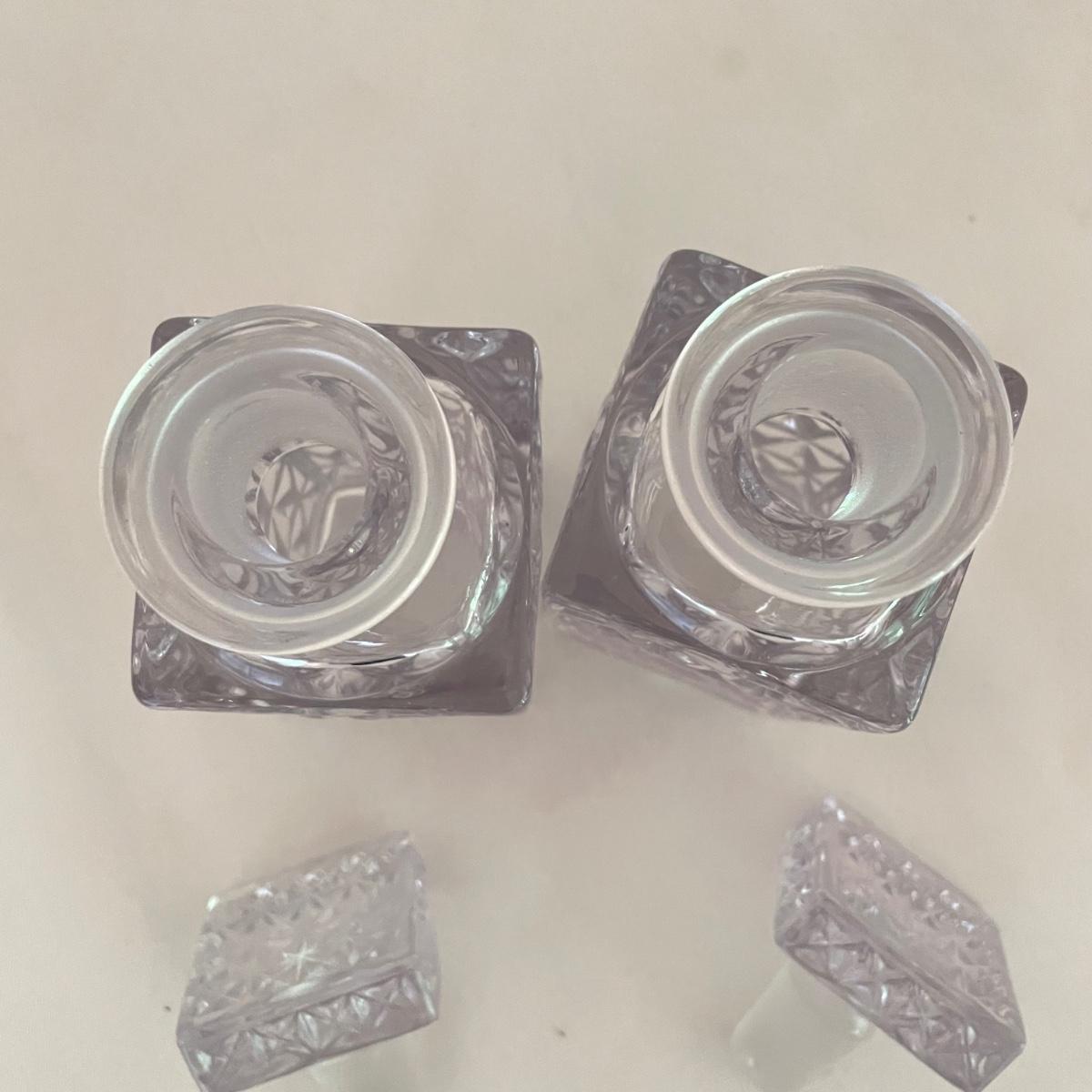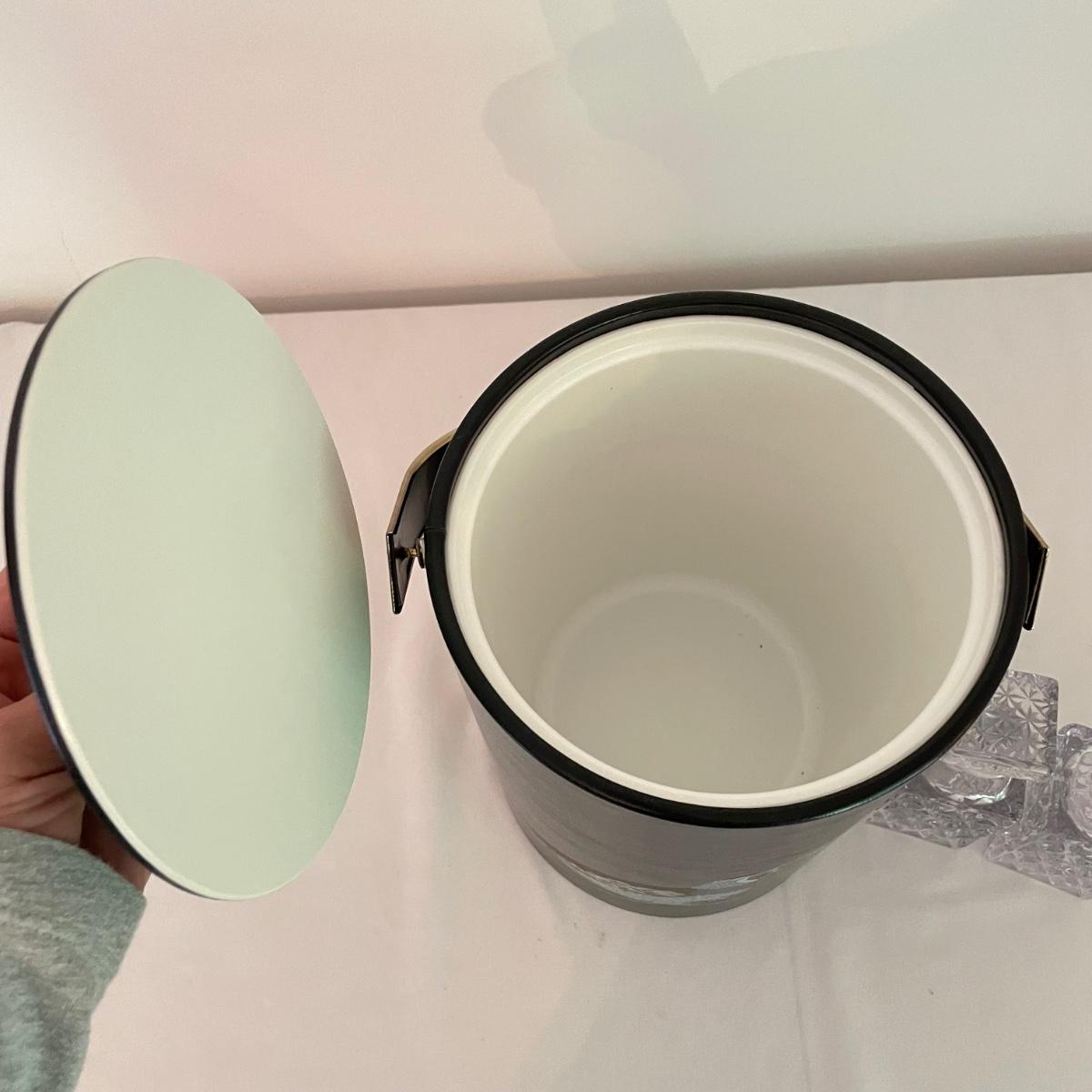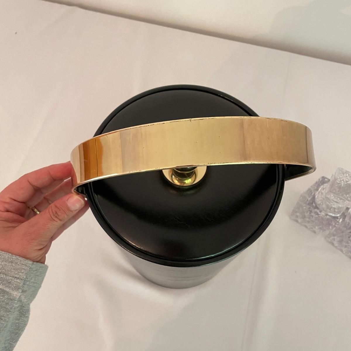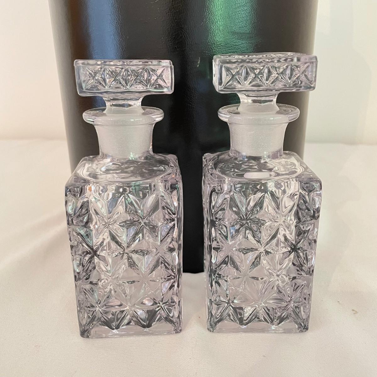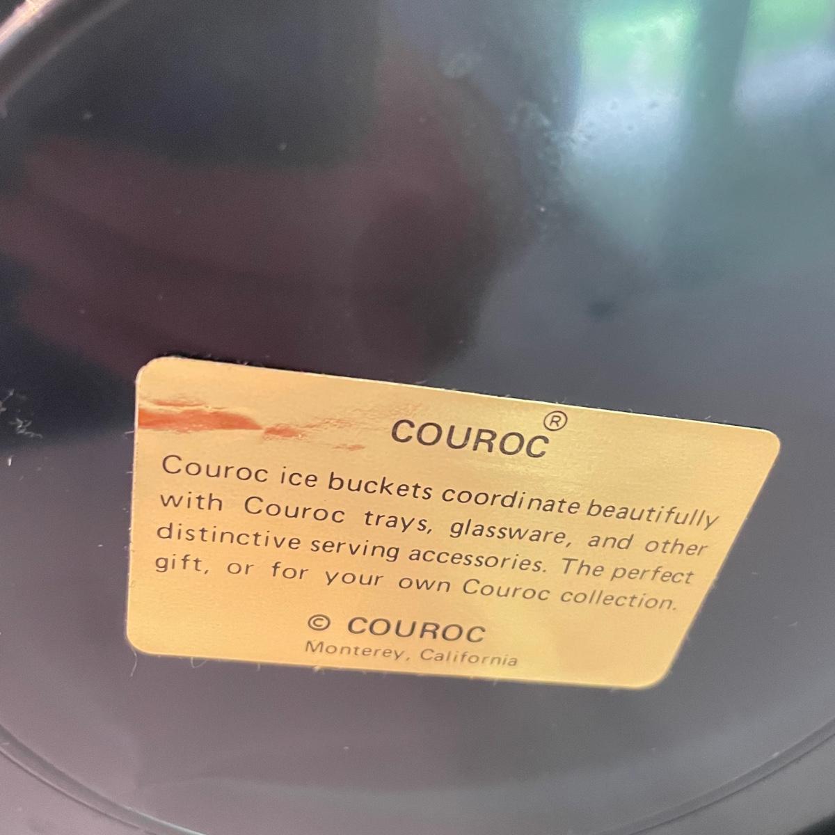 Couroc ice bucket has a leather like cover with lid and a quail featured on one side. Decanter without handle or lid measures 7.75”D x 11”H. Lot also includes two 5.5”H glass decanters with frosted stoppers. See images. Shipping available.