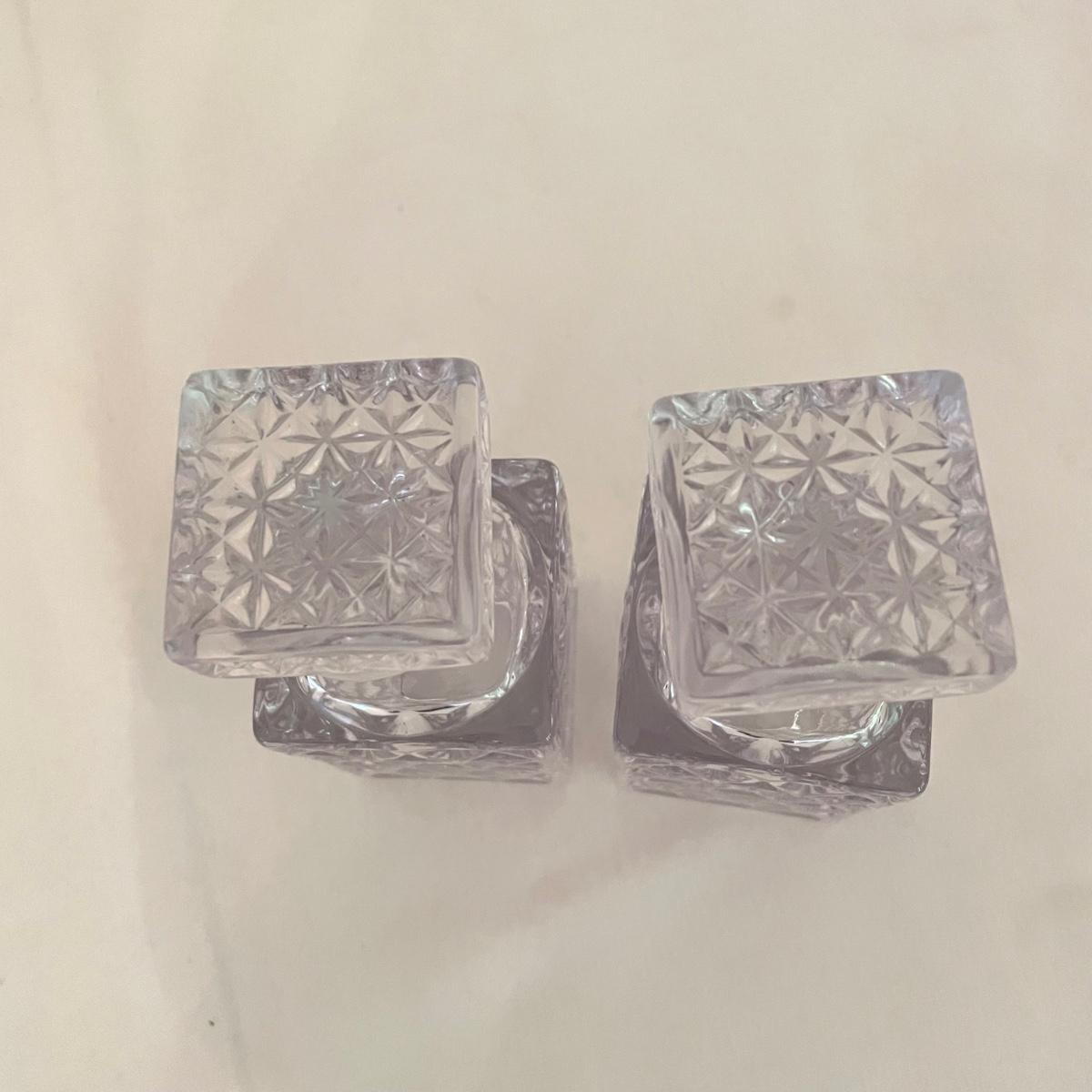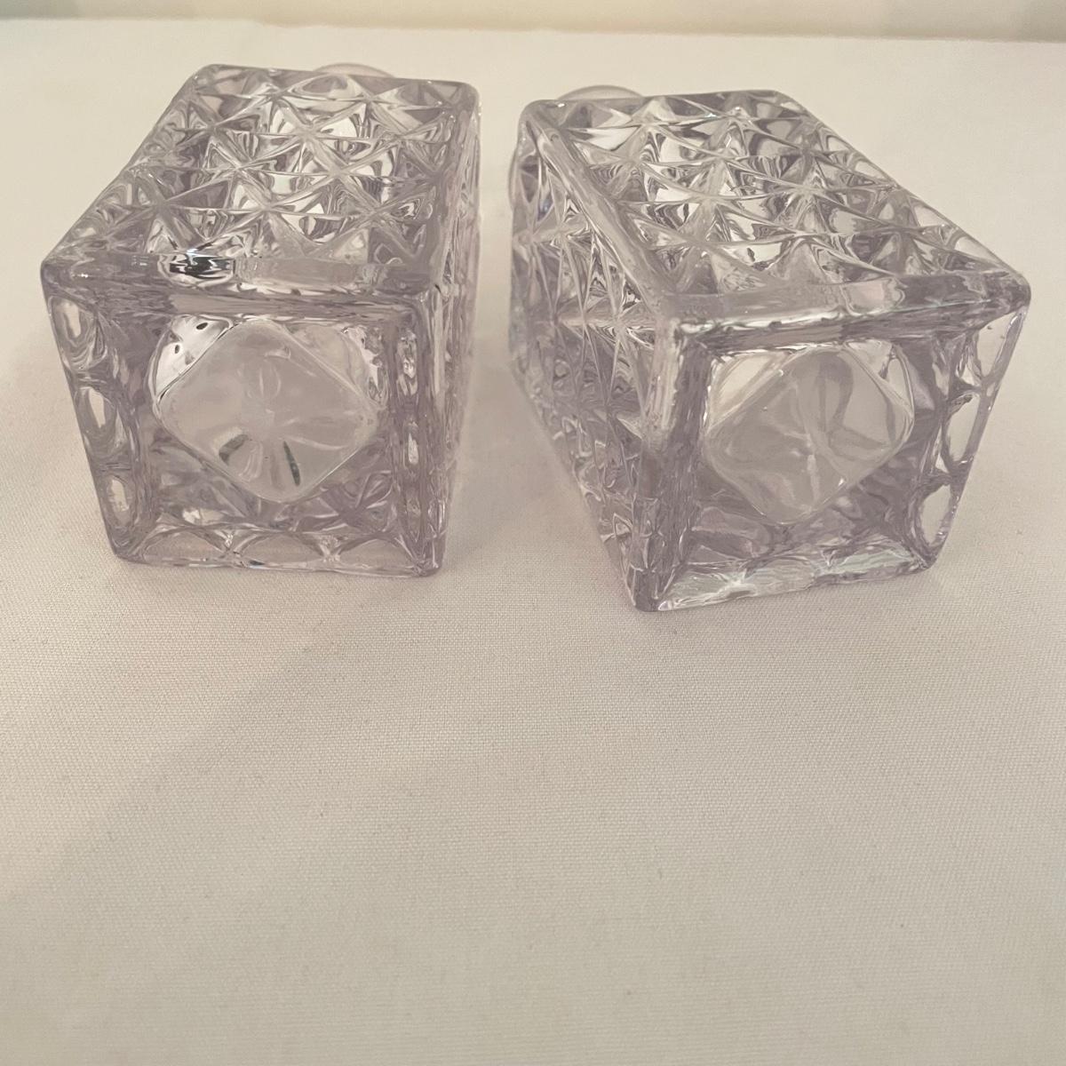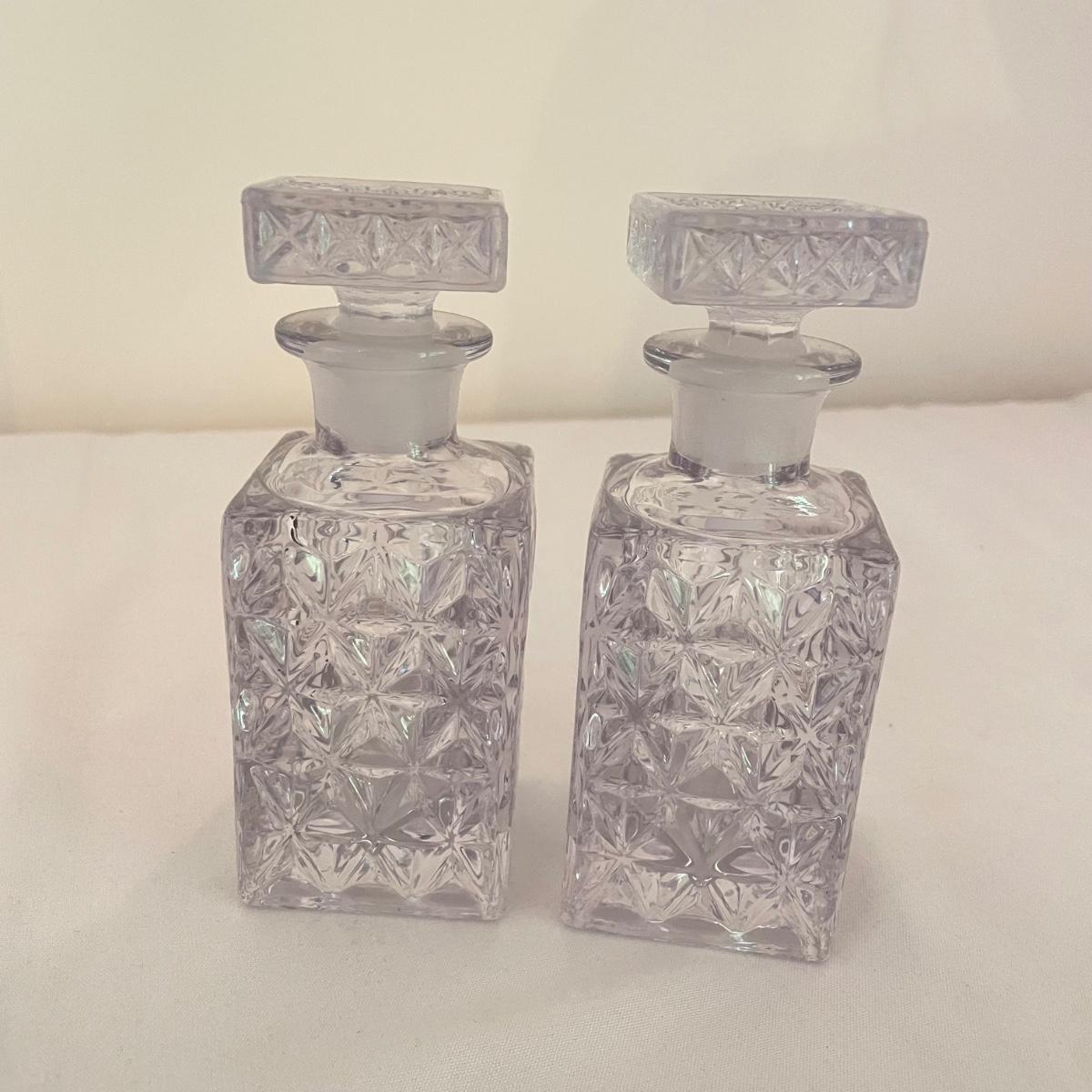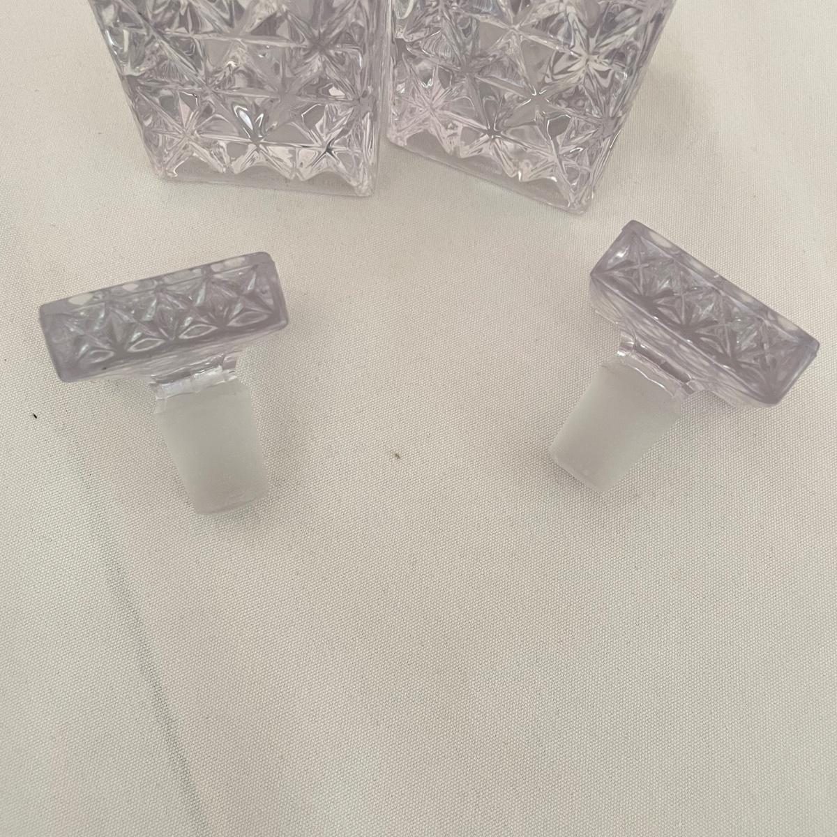 Couroc ice bucket has a leather like cover with lid and a quail featured on one side. Decanter without handle or lid measures 7.75”D x 11”H. Lot also includes two 5.5”H glass decanters with frosted stoppers. See images. Shipping available.