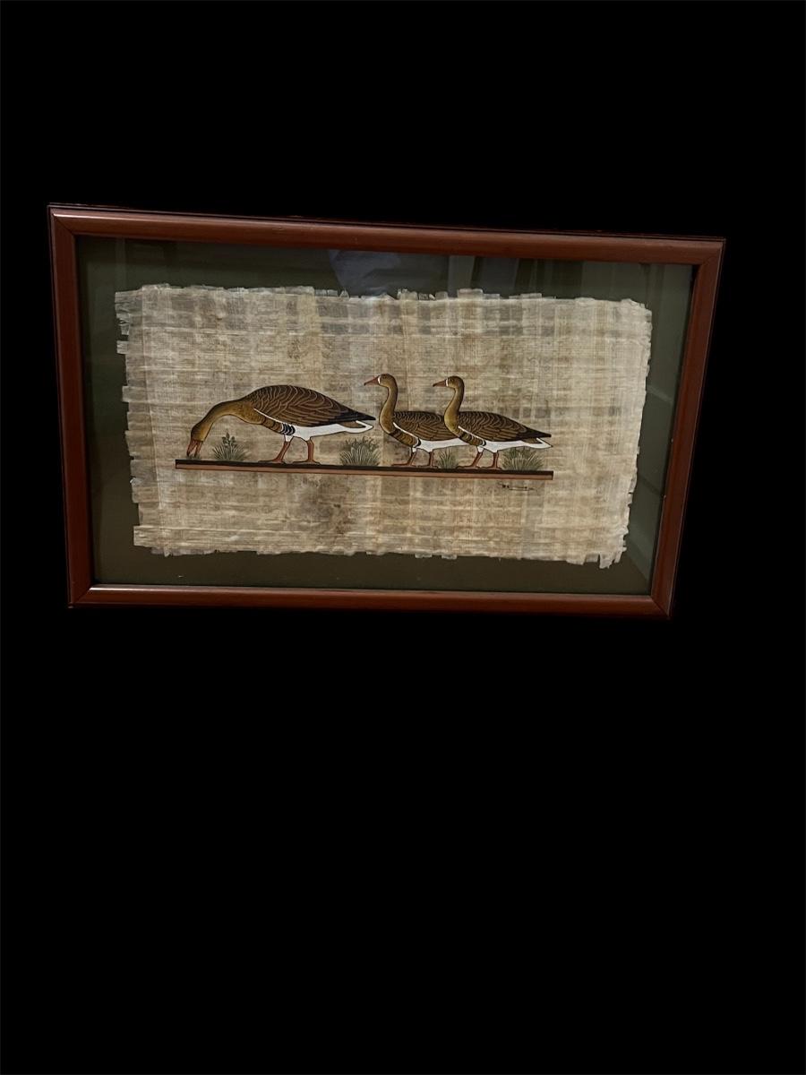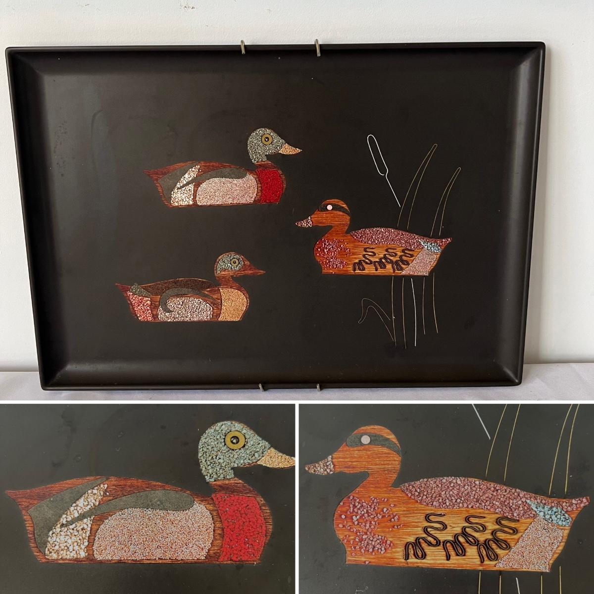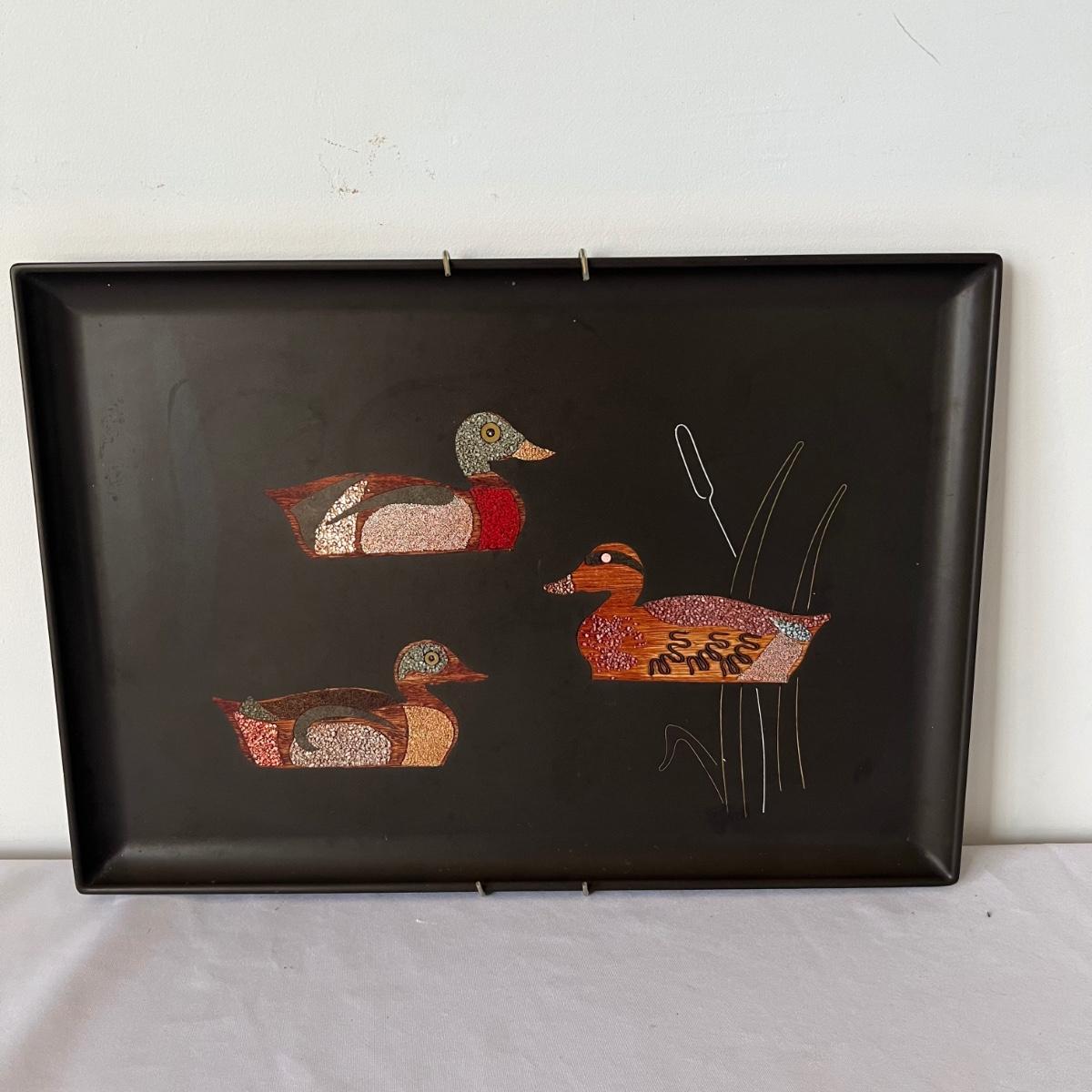 This black tray appears to be by Couroc of Monterey and features three inlaid ducks. The tray is a lightweight resin material and comes with the hanging hardware shown in photo. The geese art appears to be on papyrus paper. It is signed and mounted under glass in a wooden frame. Note the mildew stains on the back of piece.