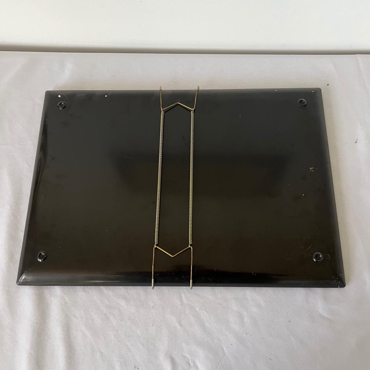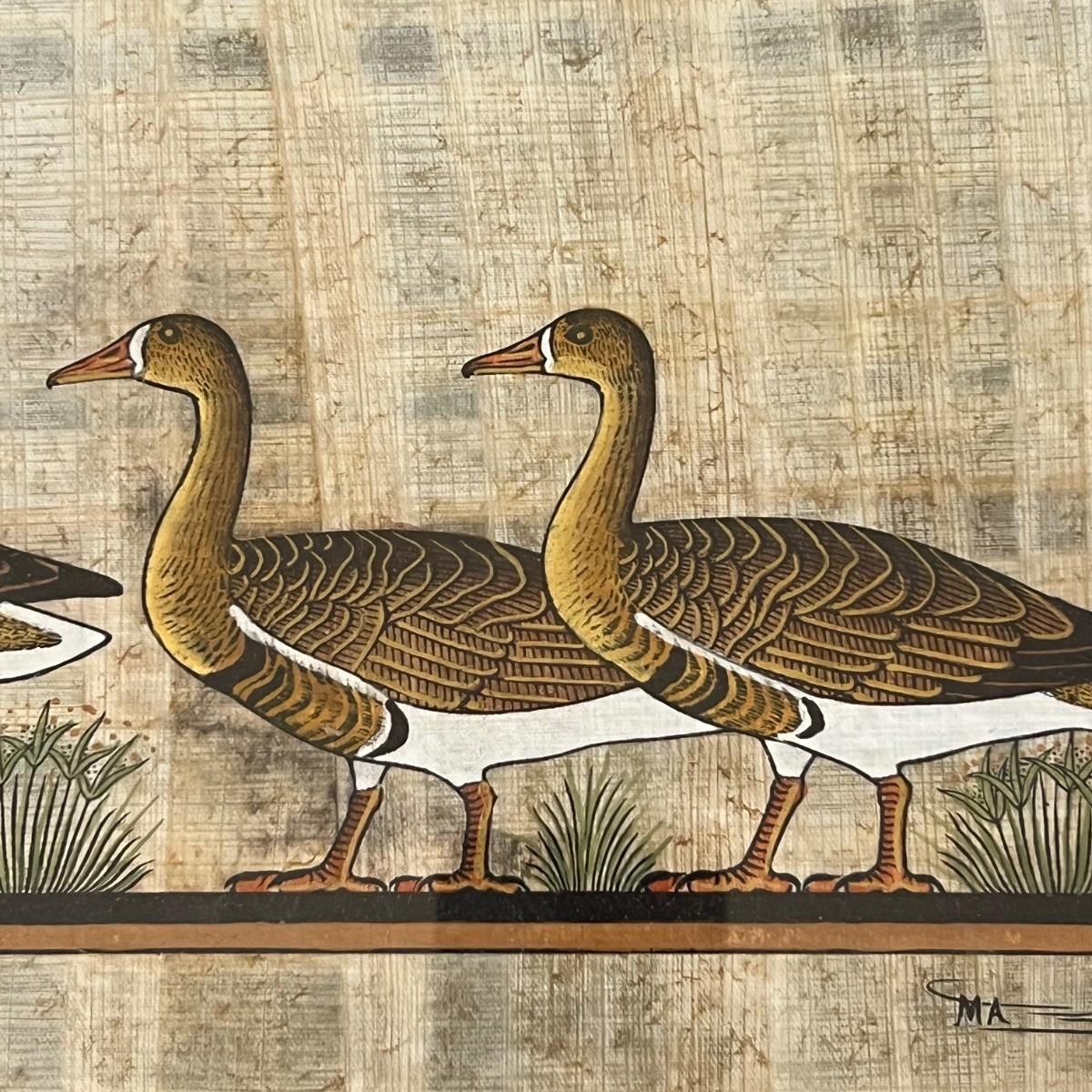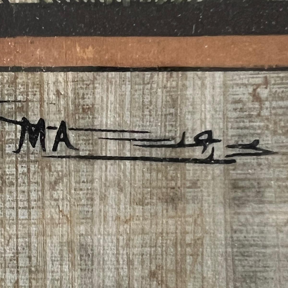 This black tray appears to be by Couroc of Monterey and features three inlaid ducks. The tray is a lightweight resin material and comes with the hanging hardware shown in photo. The geese art appears to be on papyrus paper. It is signed and mounted under glass in a wooden frame. Note the mildew stains on the back of piece.