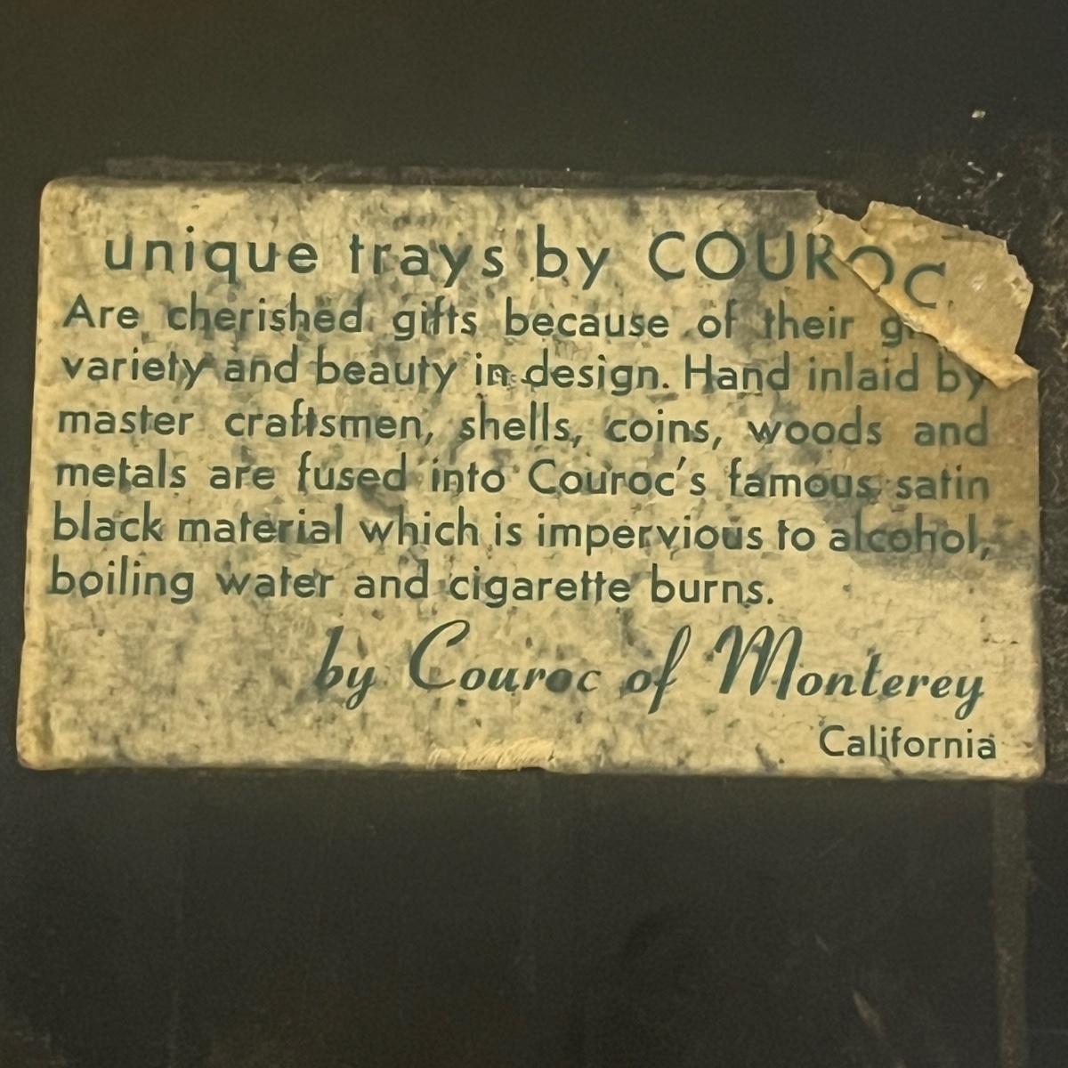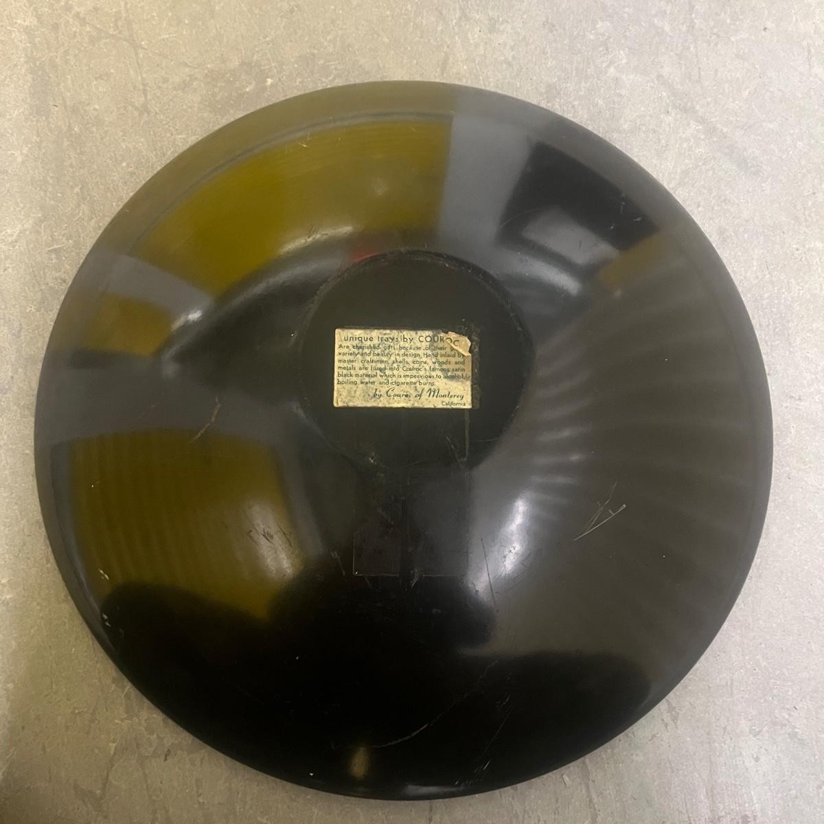 Lot includes a Couroc of Monterey handcrafted bowl that has inlaid design. Maker claims is impervious to alcohol,boiling water and cigarette burns. Bowl measures 15.5”D x 2.75”H. Bowl has scratch near top, see pictures.