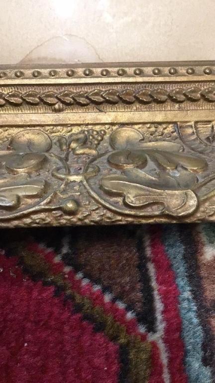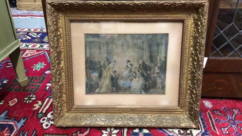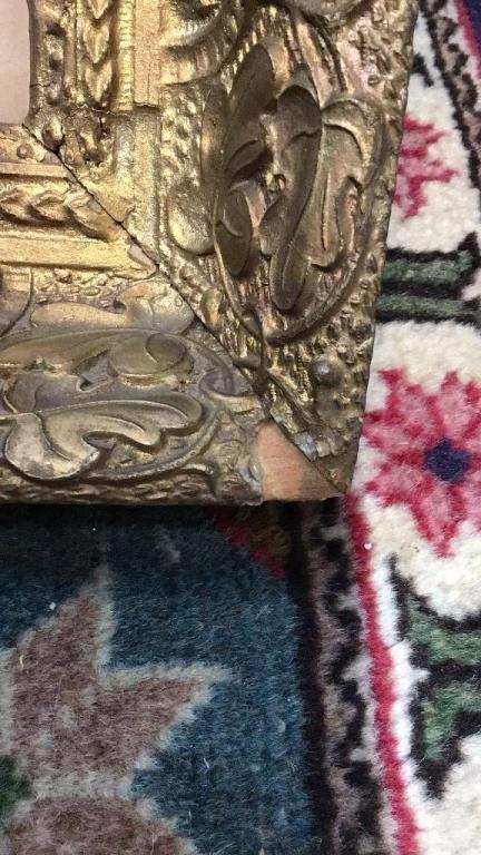Foxing and mat burn to print, water marks on rough cut matte, gold tone gesso frame with scrolling grapevine surround, loss to frame