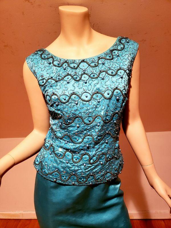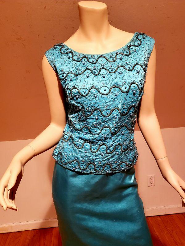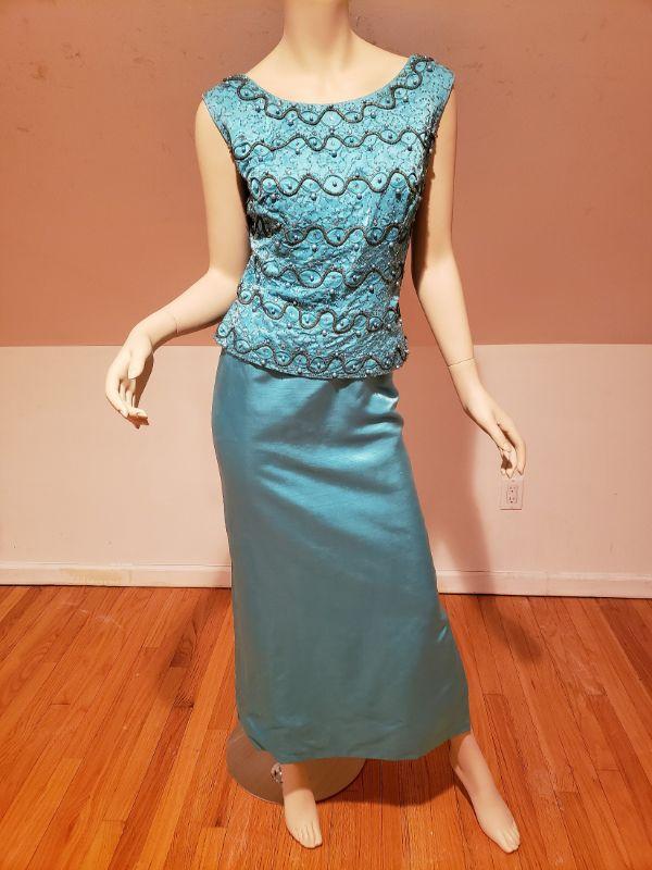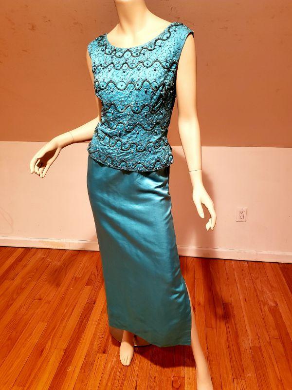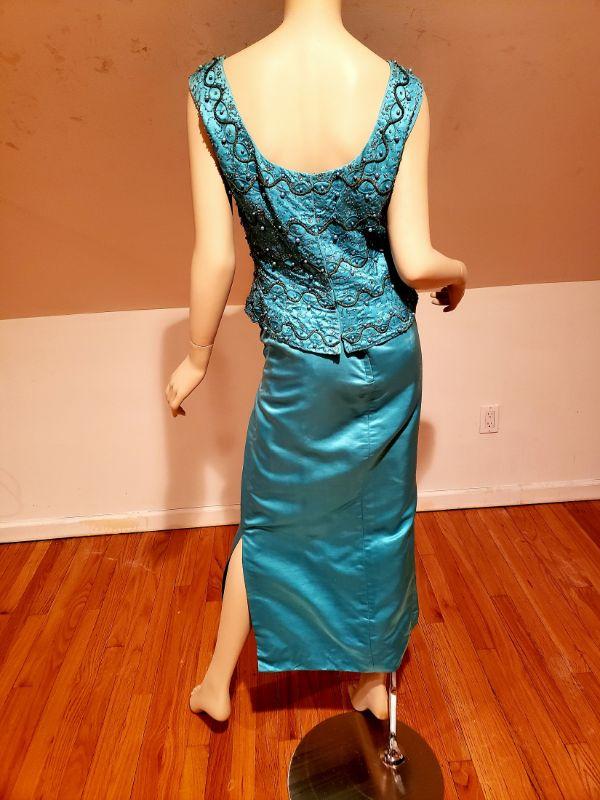 An amazing Cocktail gown that is in two parts, The maxi dress with an organza bodice and the top Embellished shantung that goes atop of it. with a back metal zipper.
