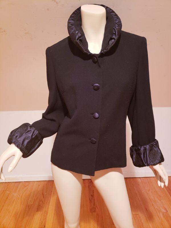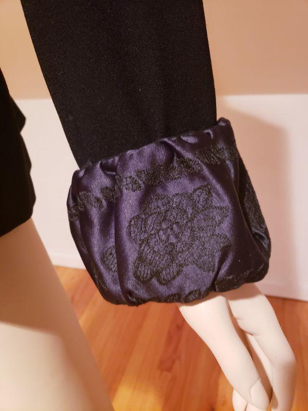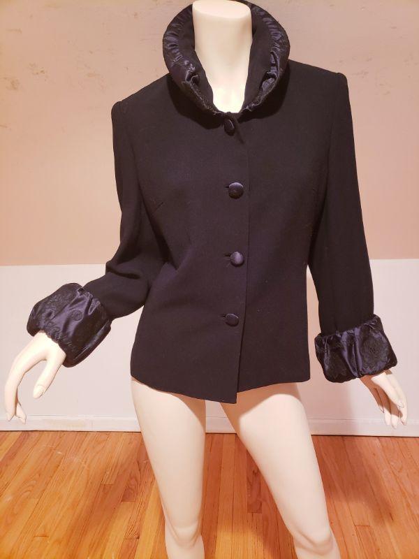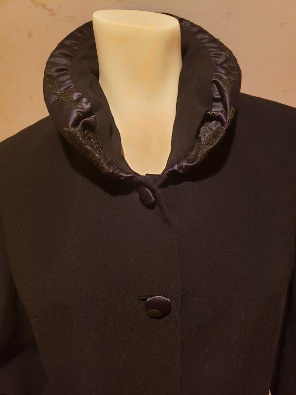 This one is a stunner, Very dark Navy/blue almost black Couture Opera jacket with floral Brocade Bertha Collar and Sleeves Brocade buttons.. Gorgeous trapeze look.