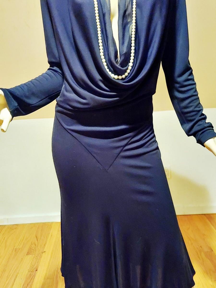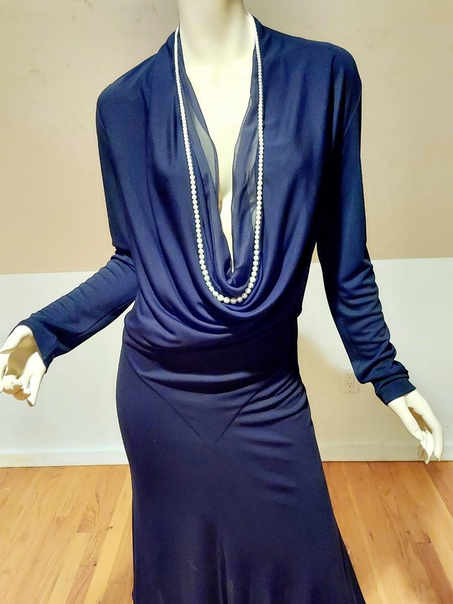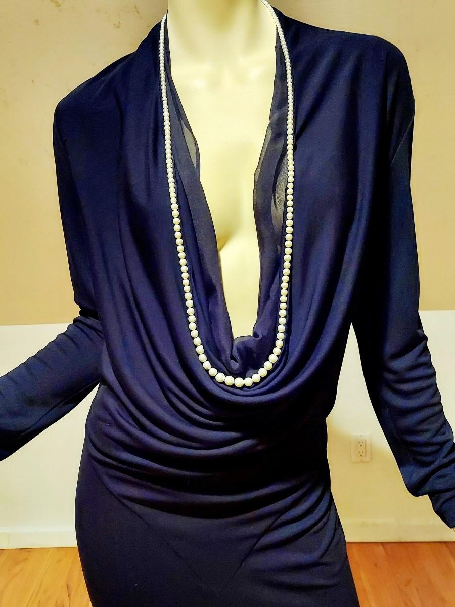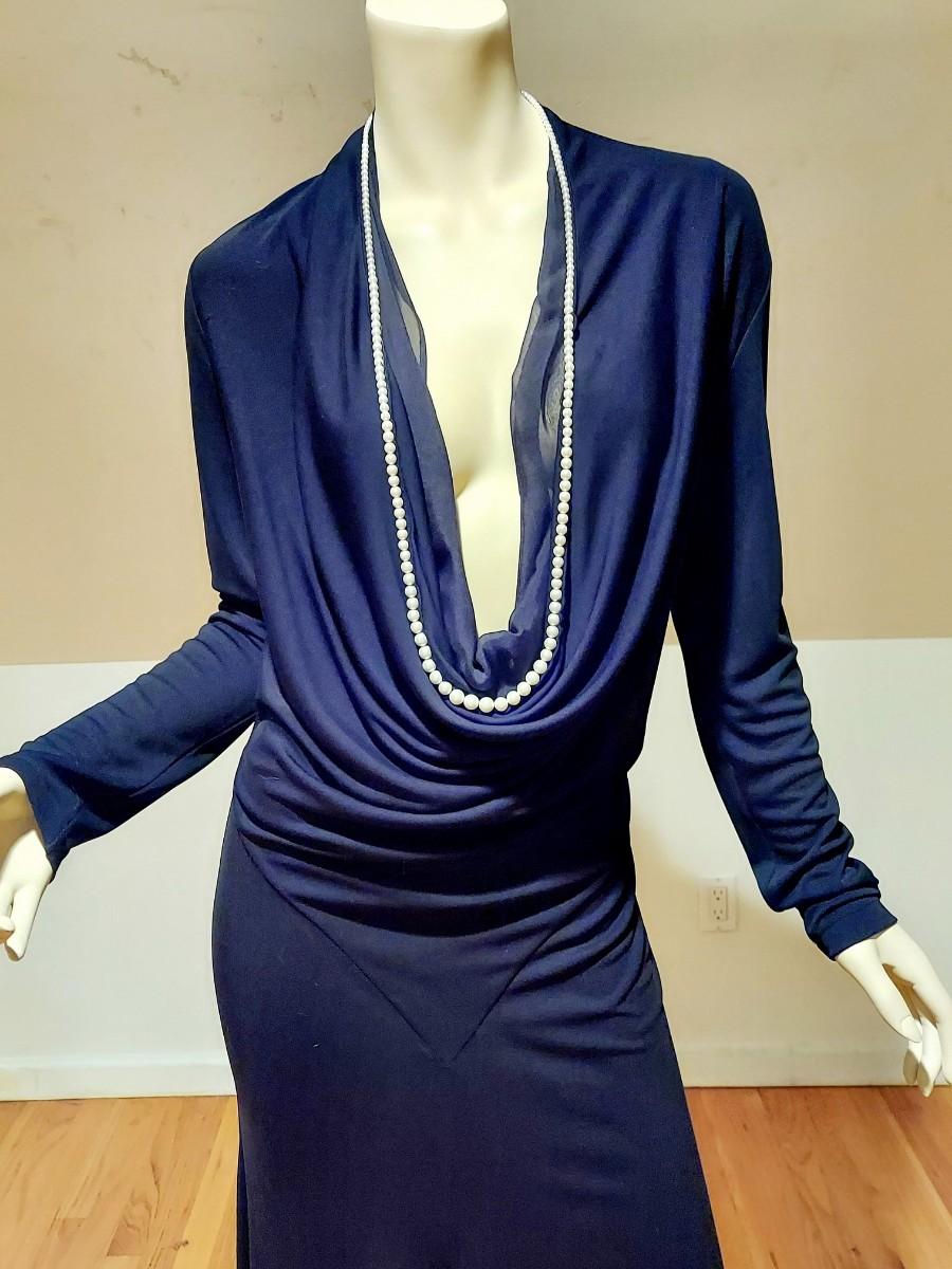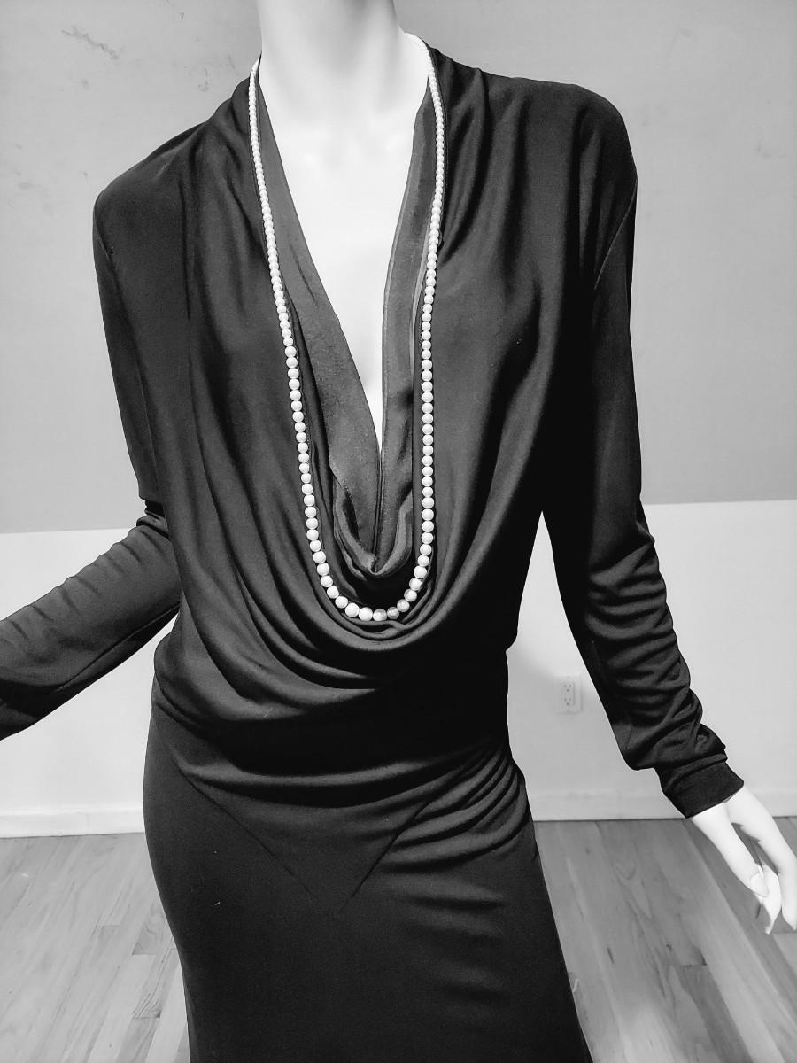 Stunning draped Runway Jean Paul Gaultier silk dress w/rayon inserts and long strand of pearls ttached to the deep plunge Shawl collar.