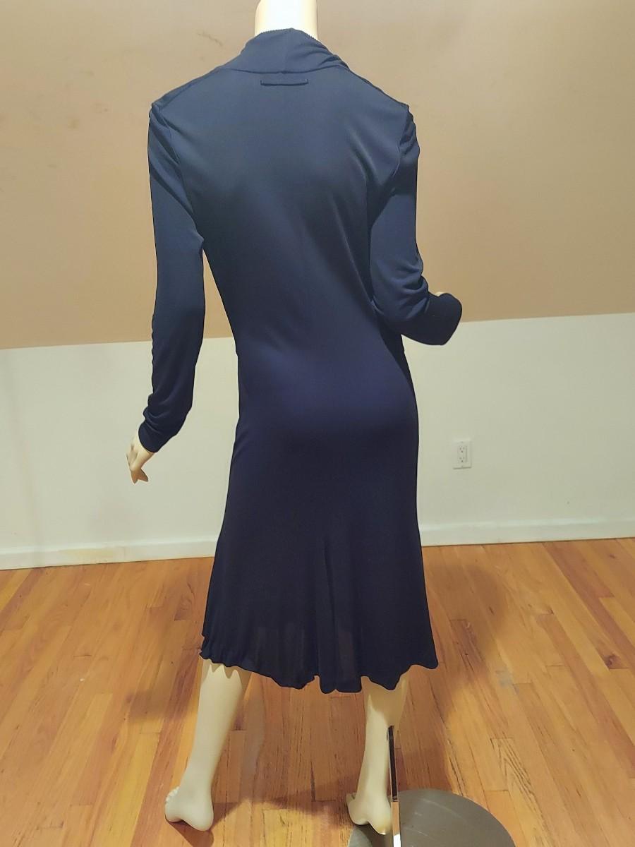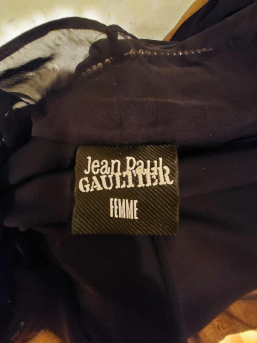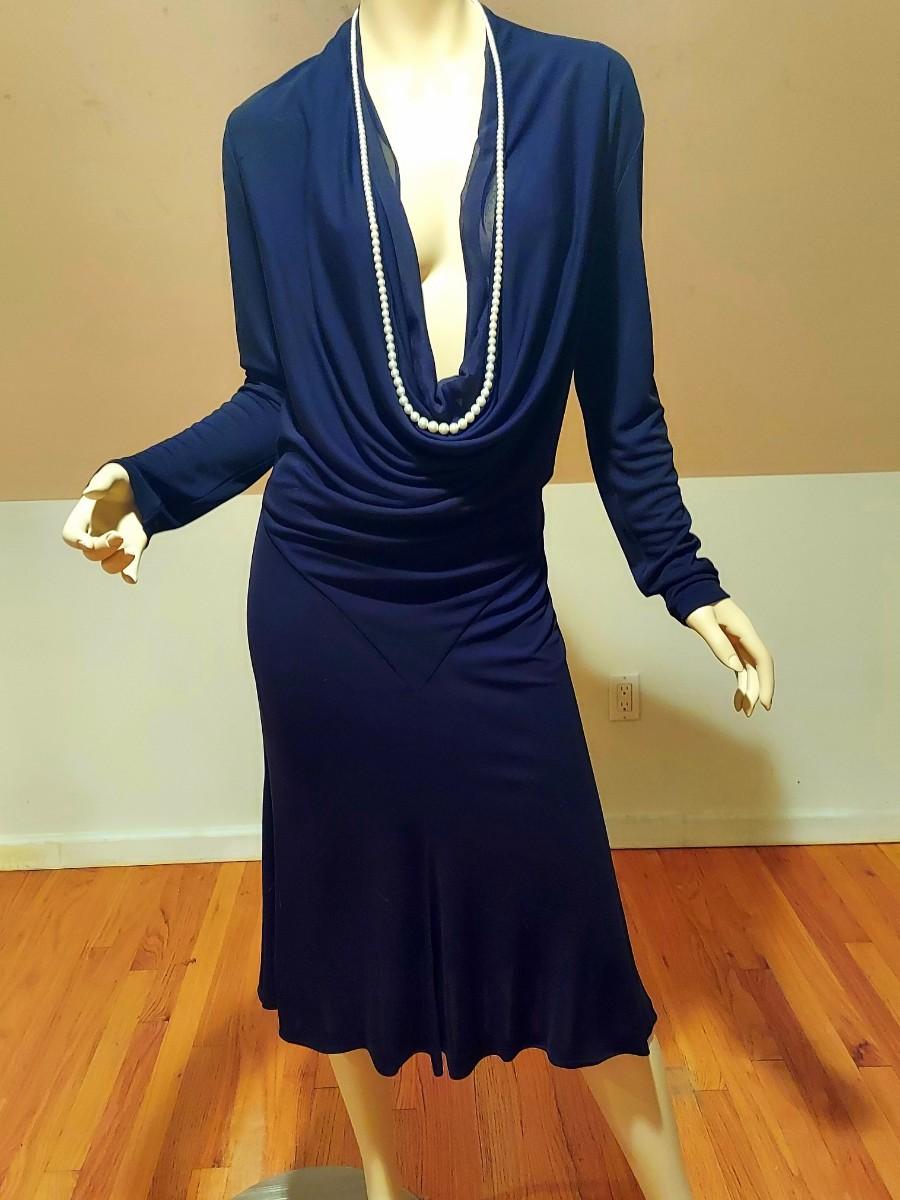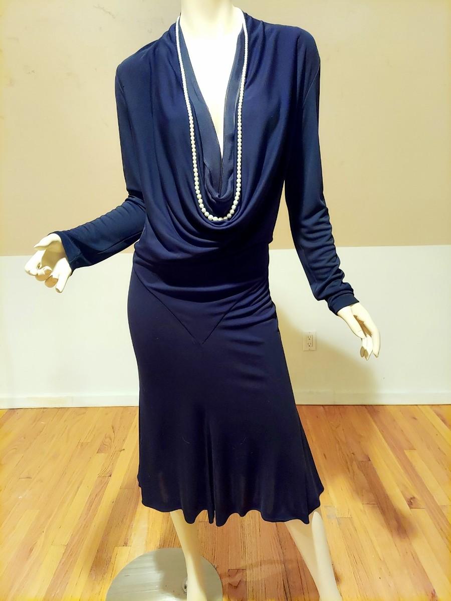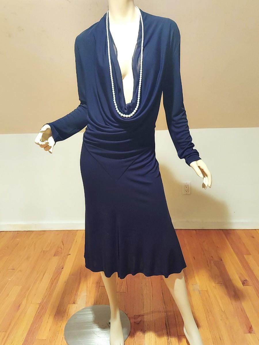 Stunning draped Runway Jean Paul Gaultier silk dress w/rayon inserts and long strand of pearls ttached to the deep plunge Shawl collar.