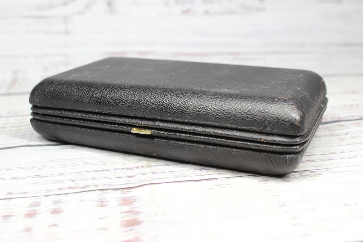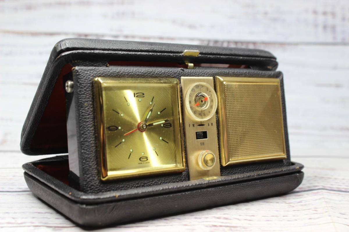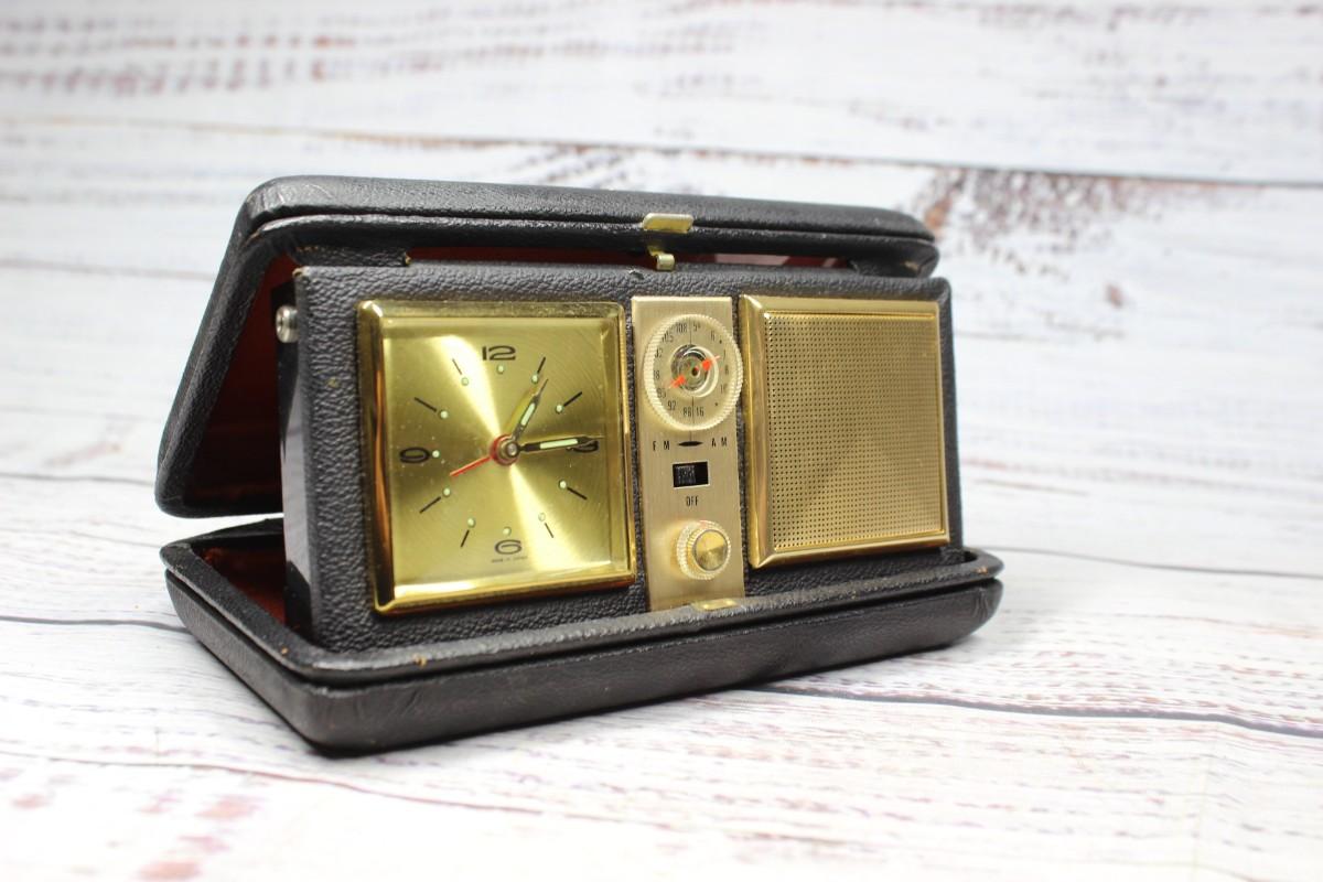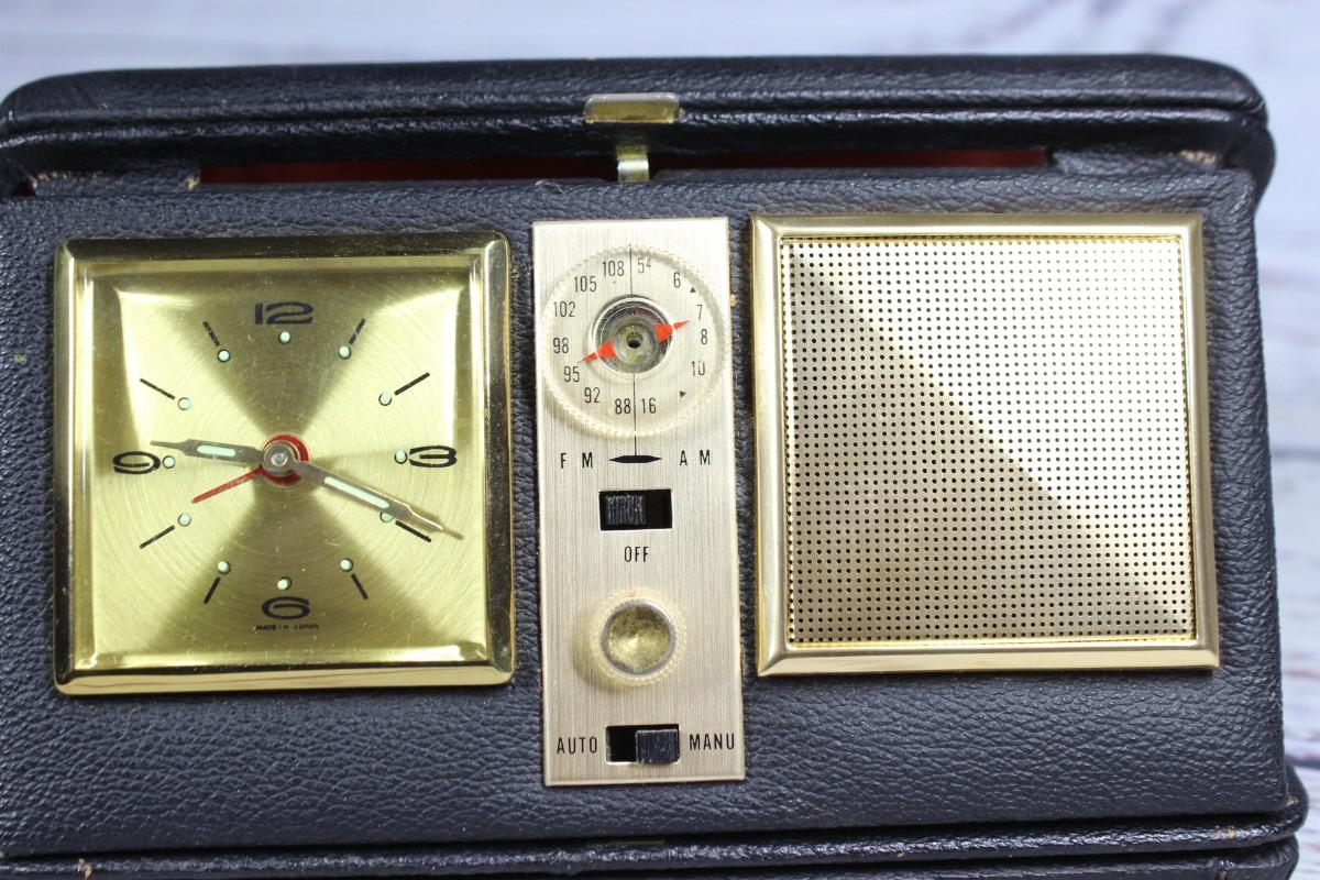Neat retro 1960s travel alarm clock AM FM radio. Black leather case with gold finishes. Working, radio is staticky and hard to get a station in. Made in Japan.