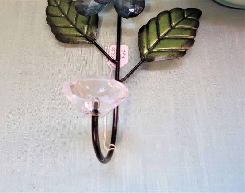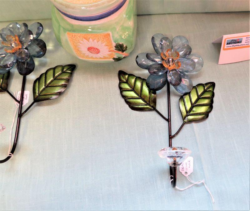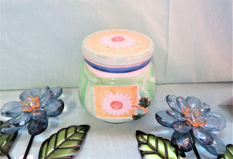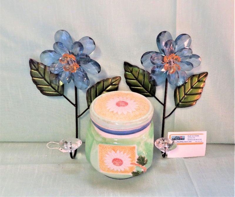 Covered Ceramic Canister & Glass Flower Wall Hooks LOT