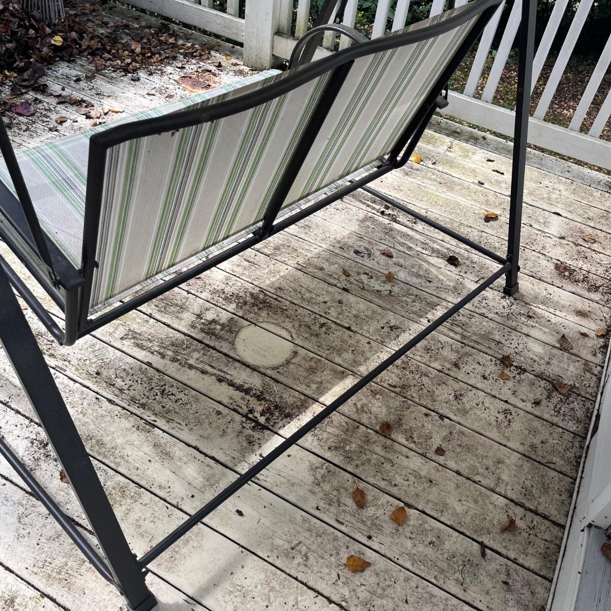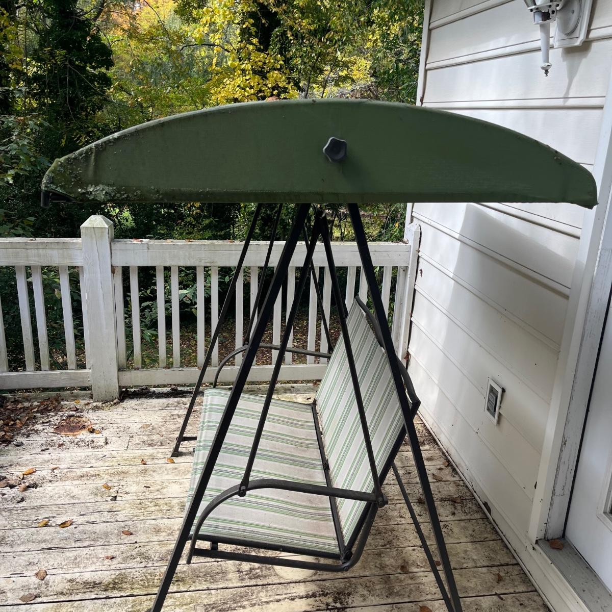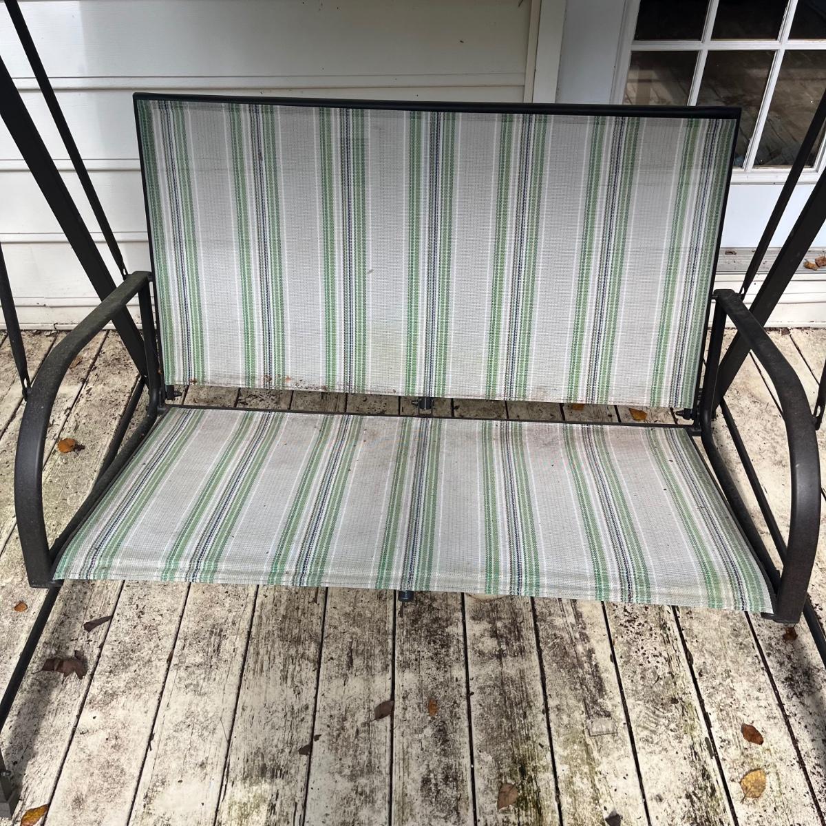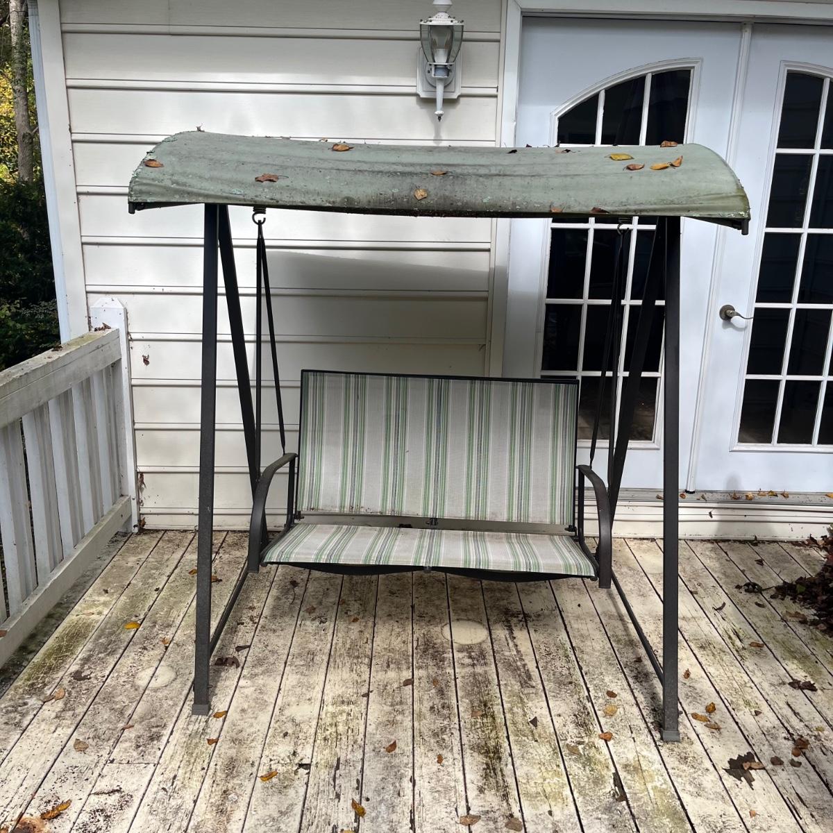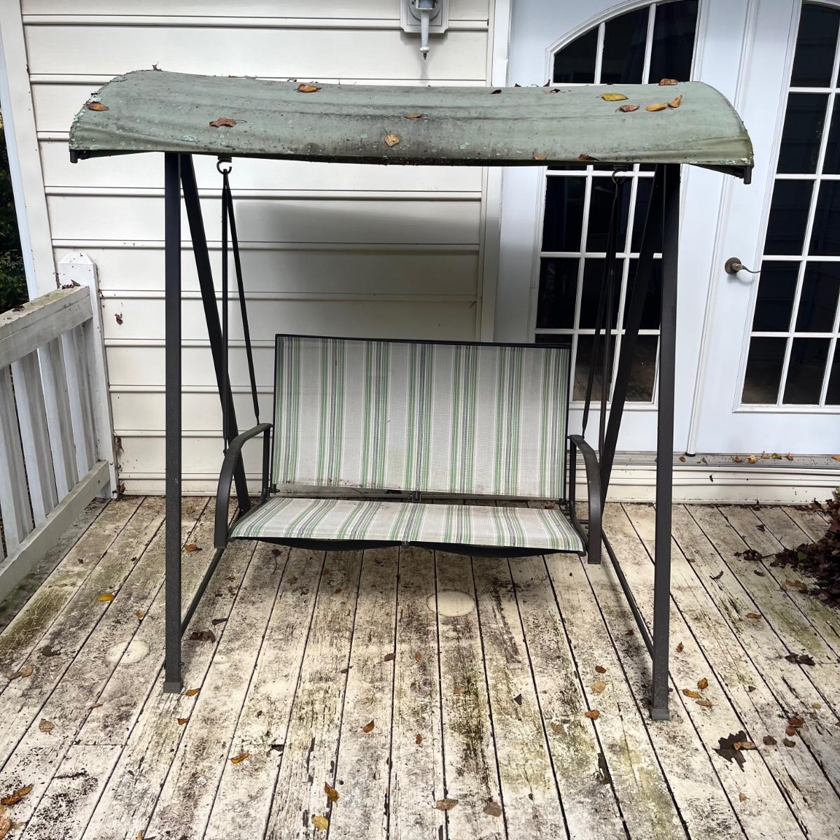 Lot includes a metal outdoor swing with outdoor material top and seat. Piece measures 48” x 60” x 67”. Item will need to taken apart for transport. Fabric is dirty and has things growing on it.