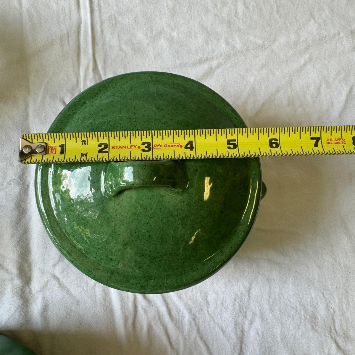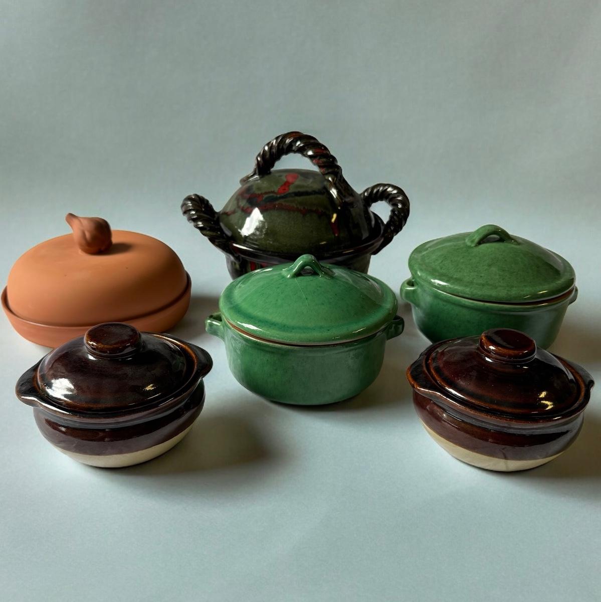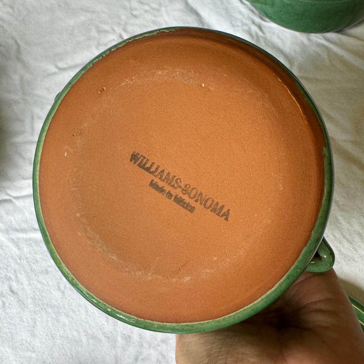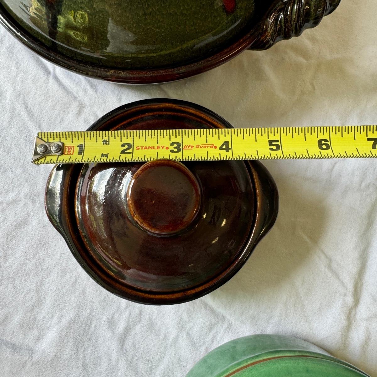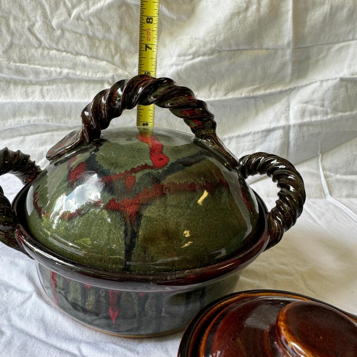 Large Covered Pot by Hull, two green William Sonoma dishes (some crackling on glaze), two smaller brown dishes and one garlic roaster in like new condition. See photos for measurements. Shipping available. Shipping can be costly. We suggest contacting our preferred local shipping provider, Postage Express, with dimensions and getting an estimate before bidding: (828) 255-9250 or shipping@postageexpressnc.com.