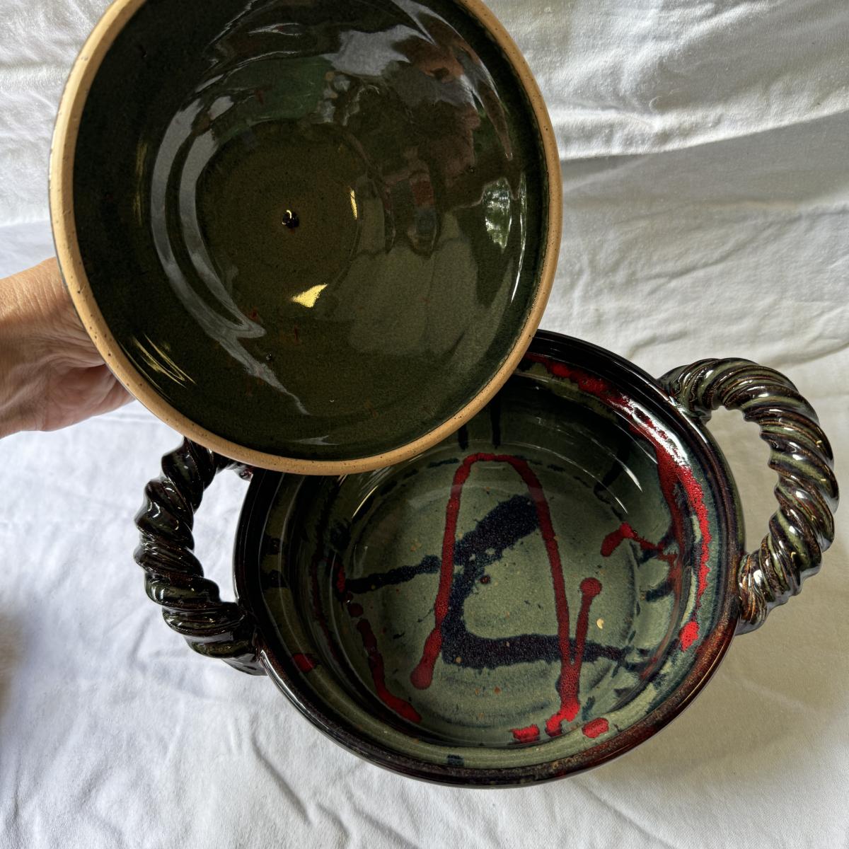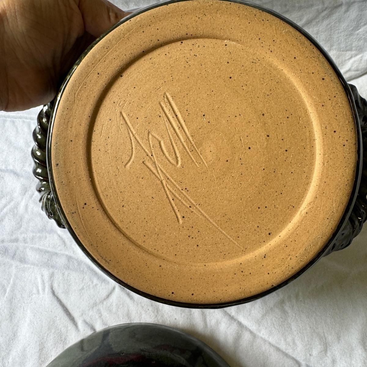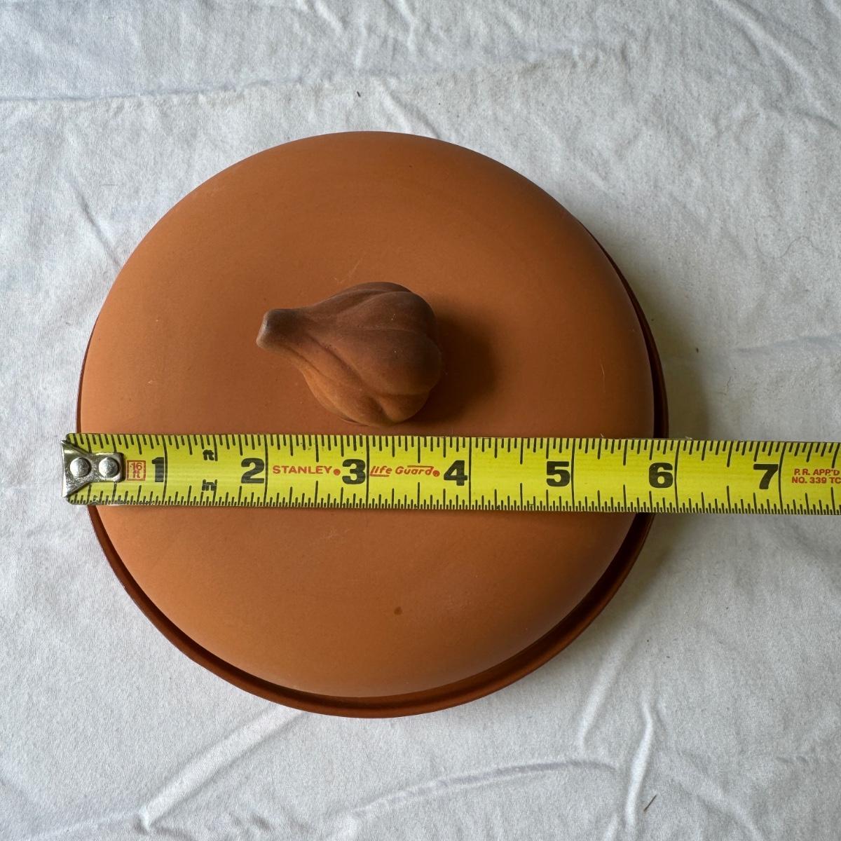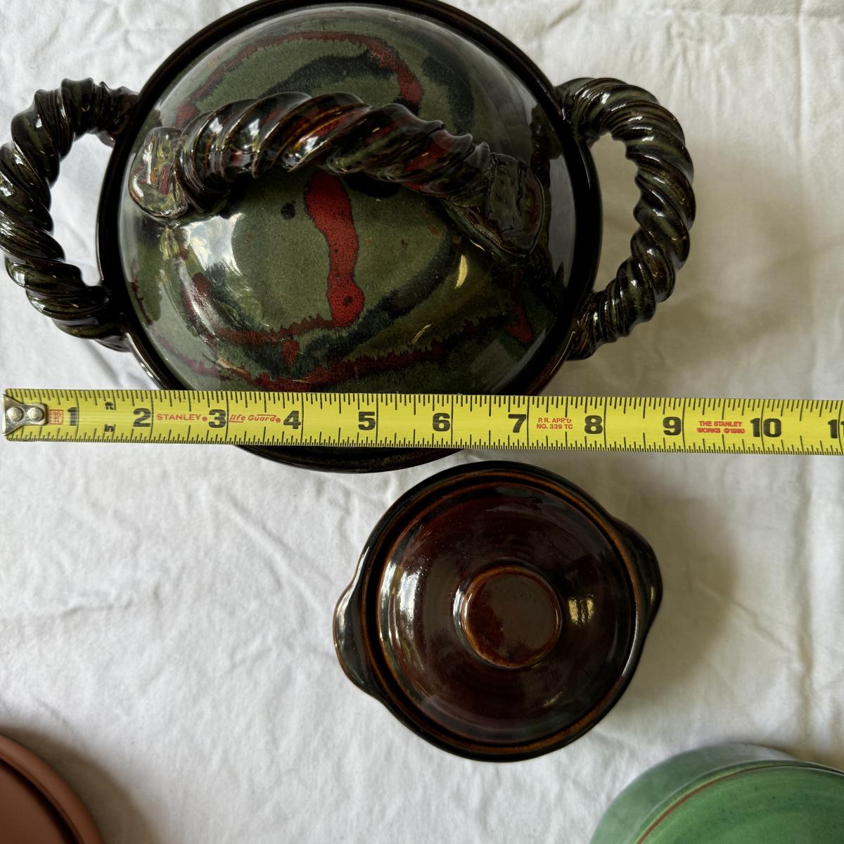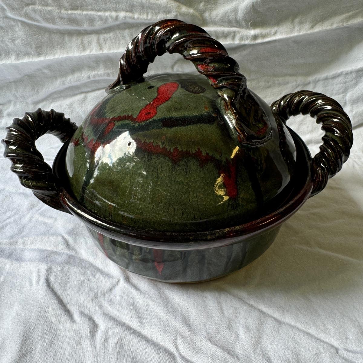 Large Covered Pot by Hull, two green William Sonoma dishes (some crackling on glaze), two smaller brown dishes and one garlic roaster in like new condition. See photos for measurements. Shipping available. Shipping can be costly. We suggest contacting our preferred local shipping provider, Postage Express, with dimensions and getting an estimate before bidding: (828) 255-9250 or shipping@postageexpressnc.com.