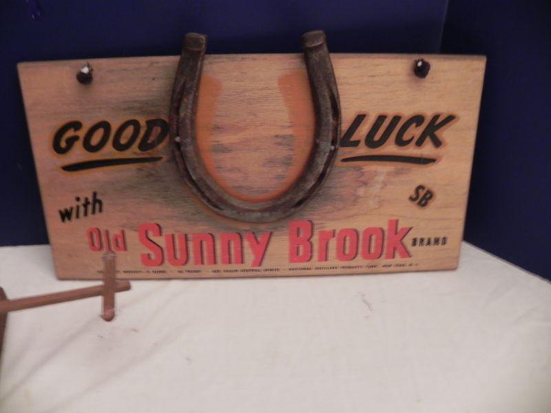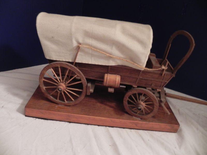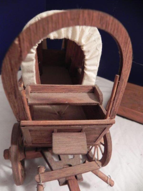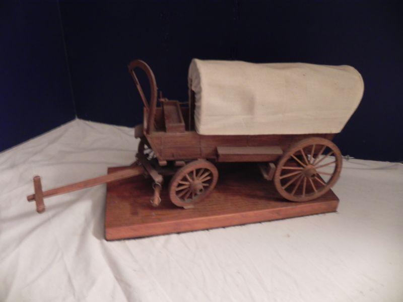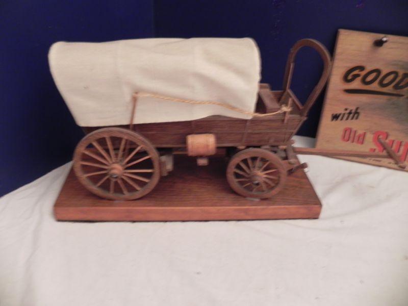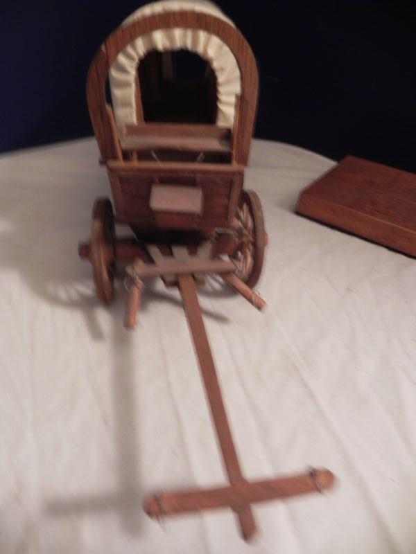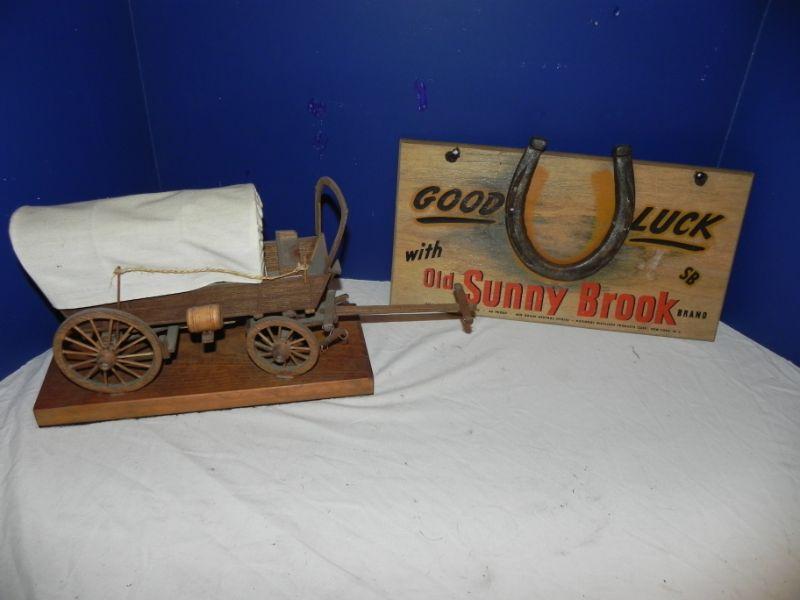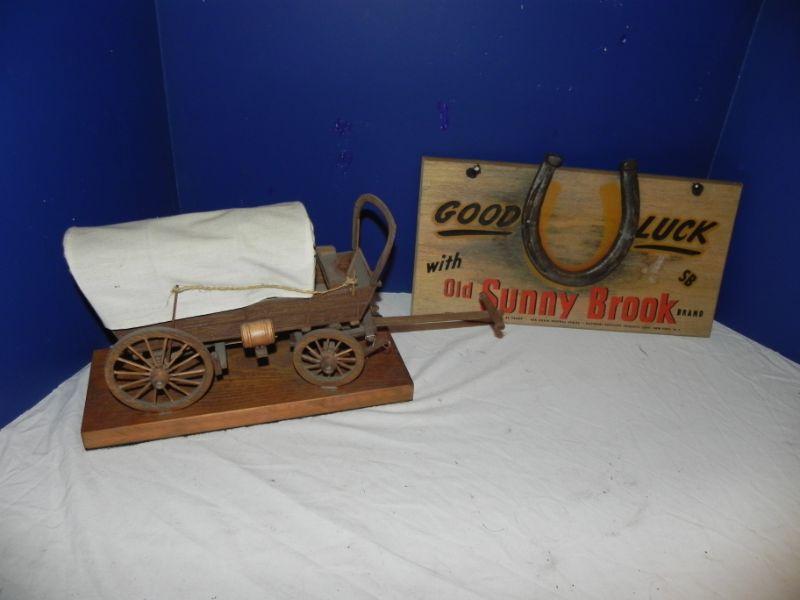 *MADE OF WOOD WAGON COMPLETE WITH HITCHES AND CANVAS COVER, AND HANGING WOOD HORSESHOE SIGN FOR GOOD LUCK