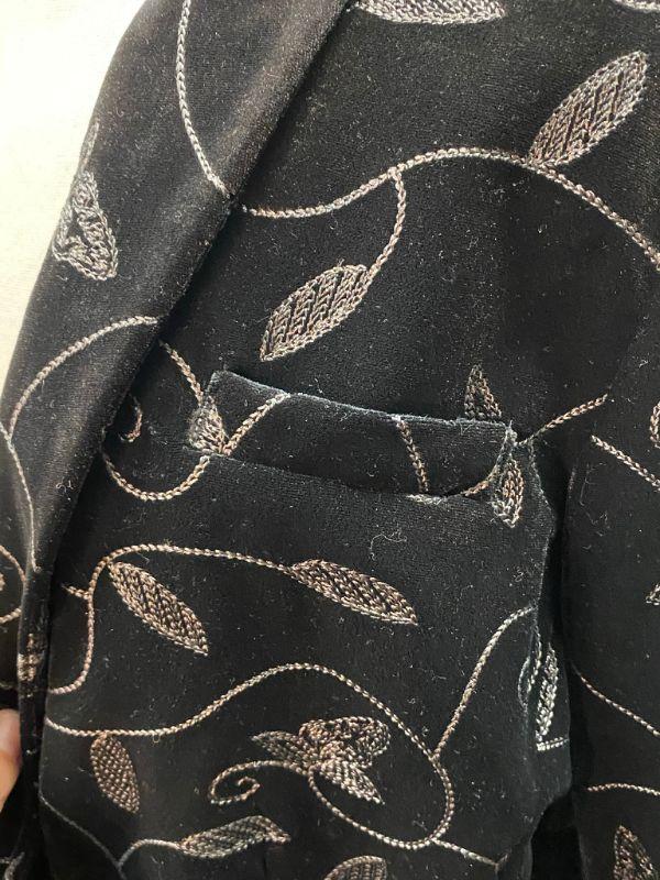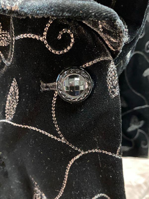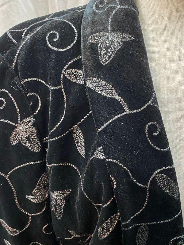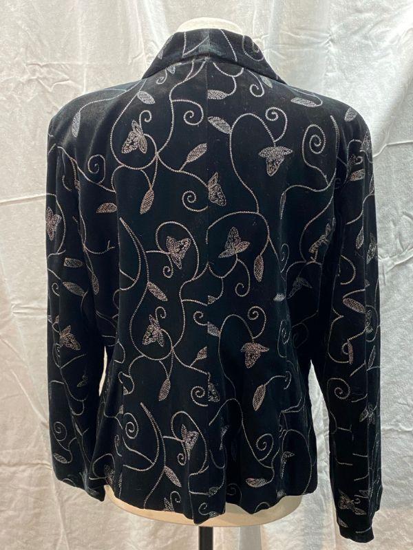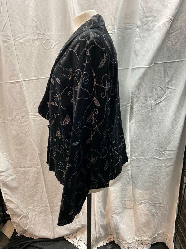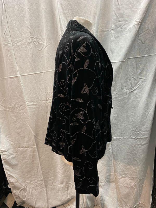 Covington woman's black velvet jacket. Silver leaf and vine embroidered pattern. Short blazer style. Single button closure, front pockets. Size 18. Good condition, no holes, spots, or snags. May be dusty from storge.