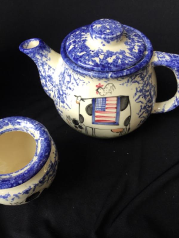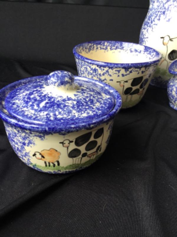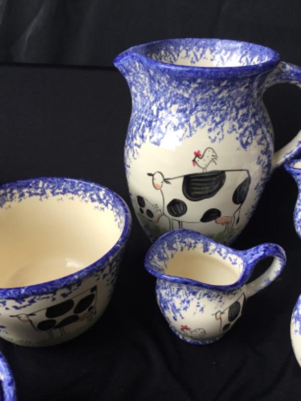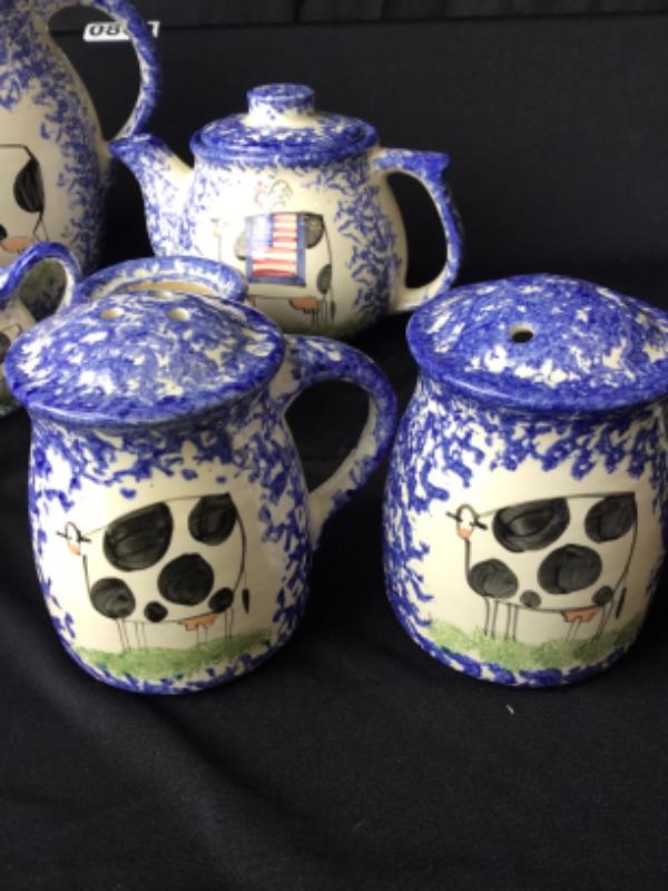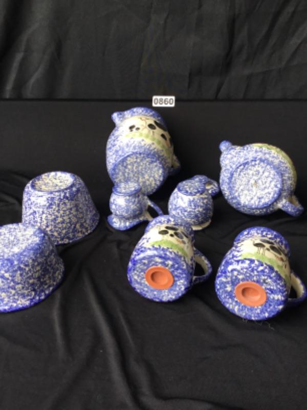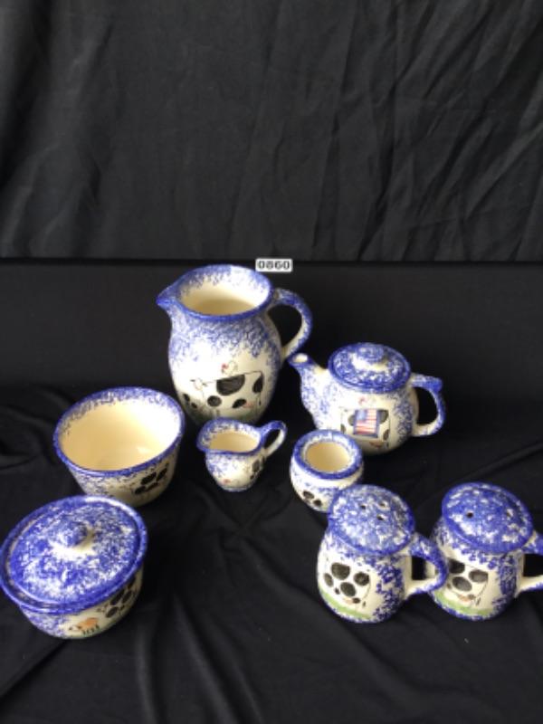 Cow pitcher, tea pot, cream and sugar, salt and pepper, bowl, and covered dish lot 860