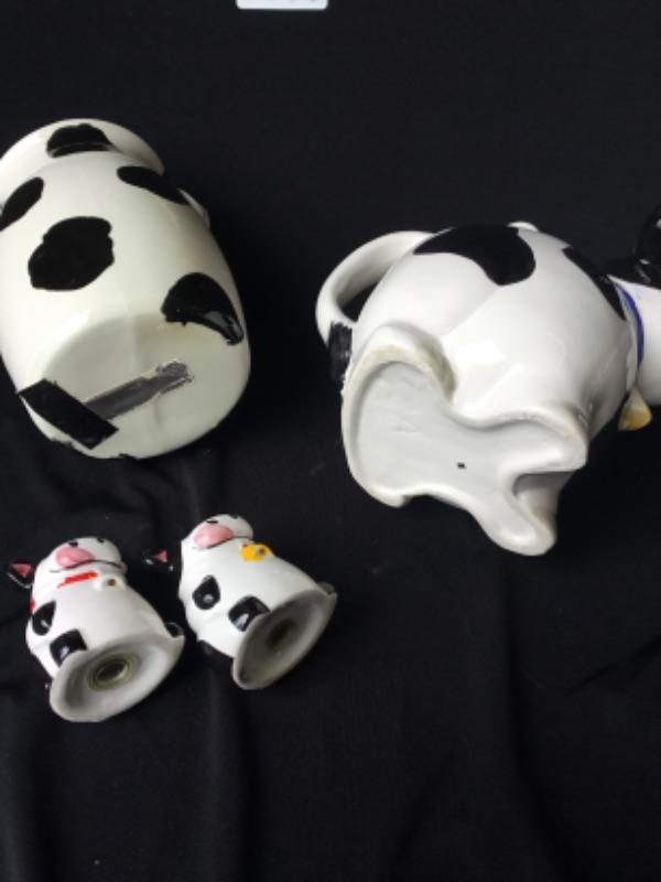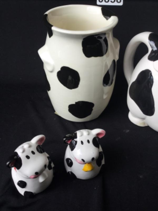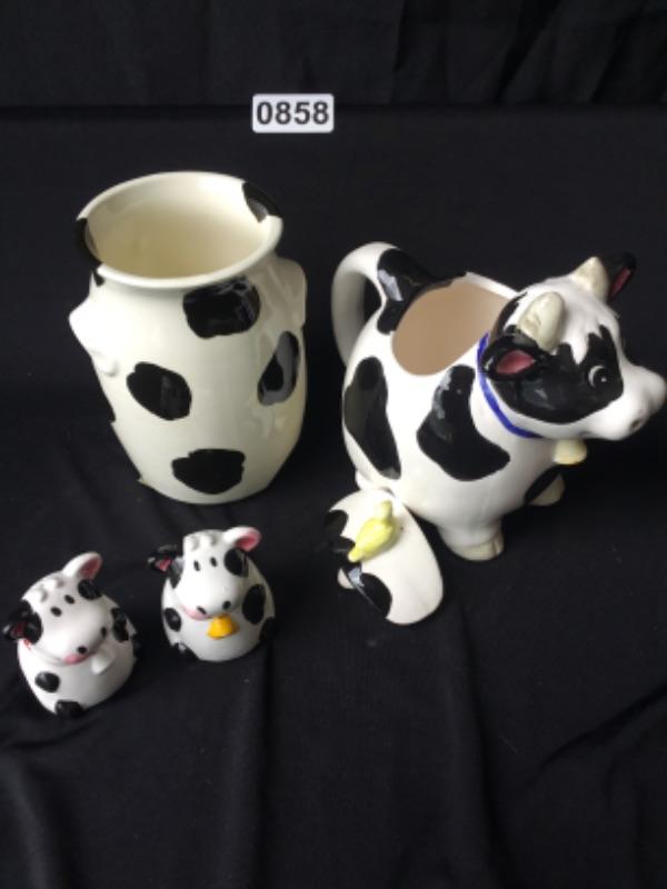Cow pitcher with lid/salt and pepper shaker/cow print canister Lot 858