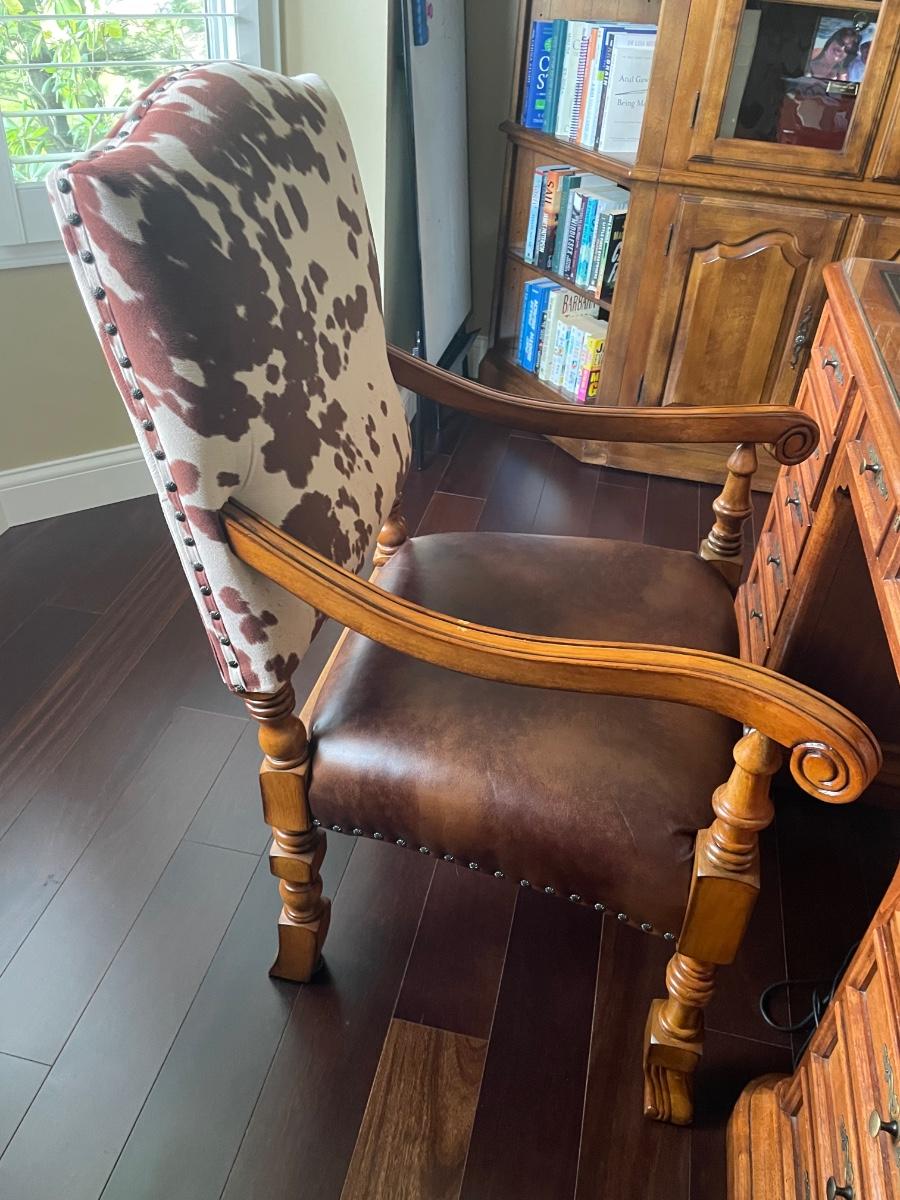 Wood arms have some scratches from being inserted under desk, otherwise good condition. No stains or tears.
