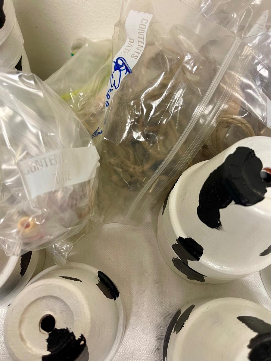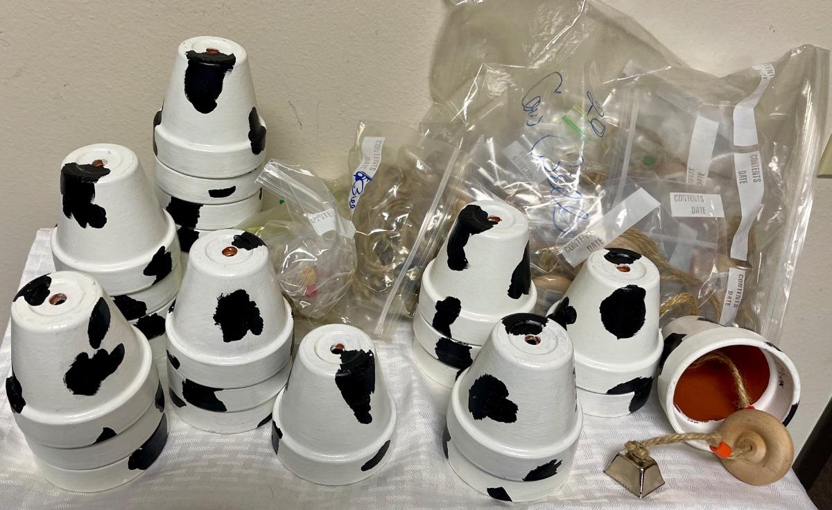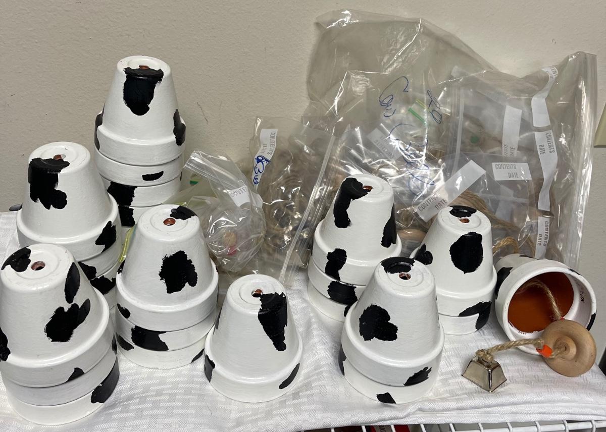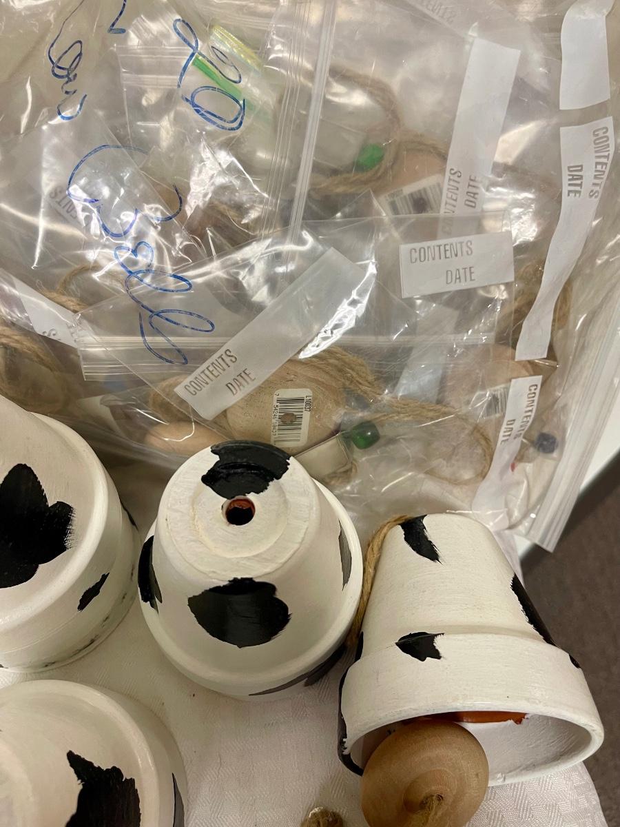 In good condition. There are 23 pots painted white with black spots. There are also wooden parts , string, and small metal cowbells to copy example to make cow bell. I think there is enough for at least 20 projects.