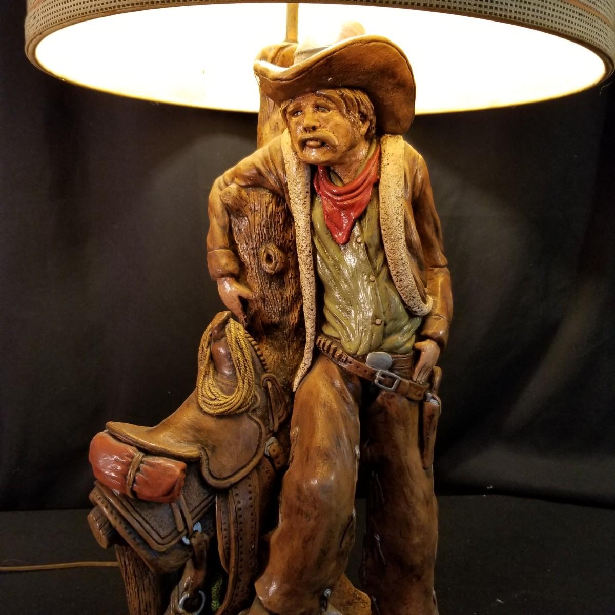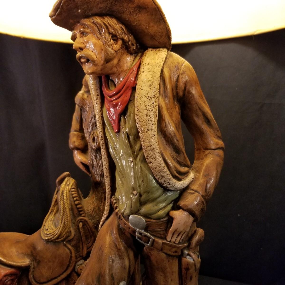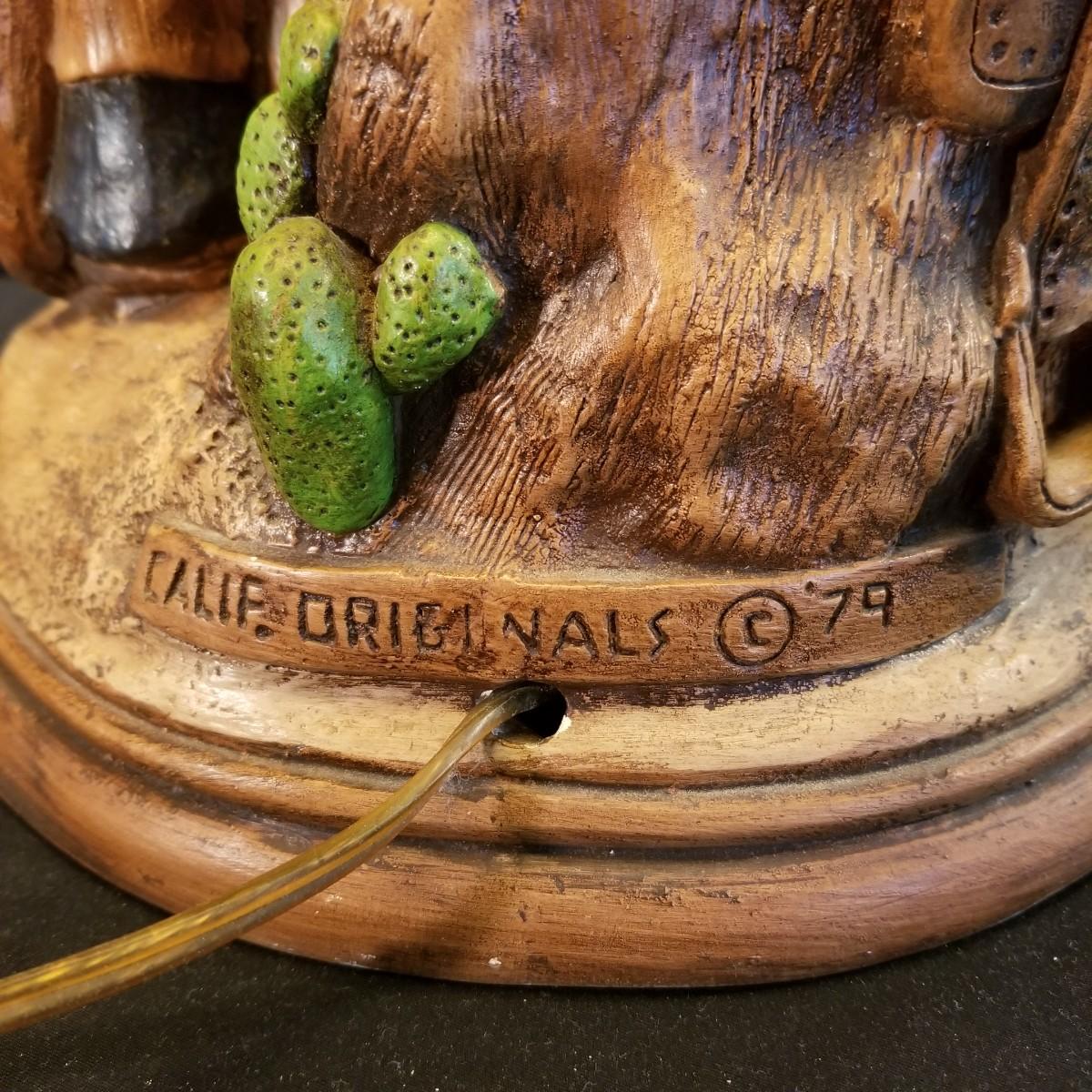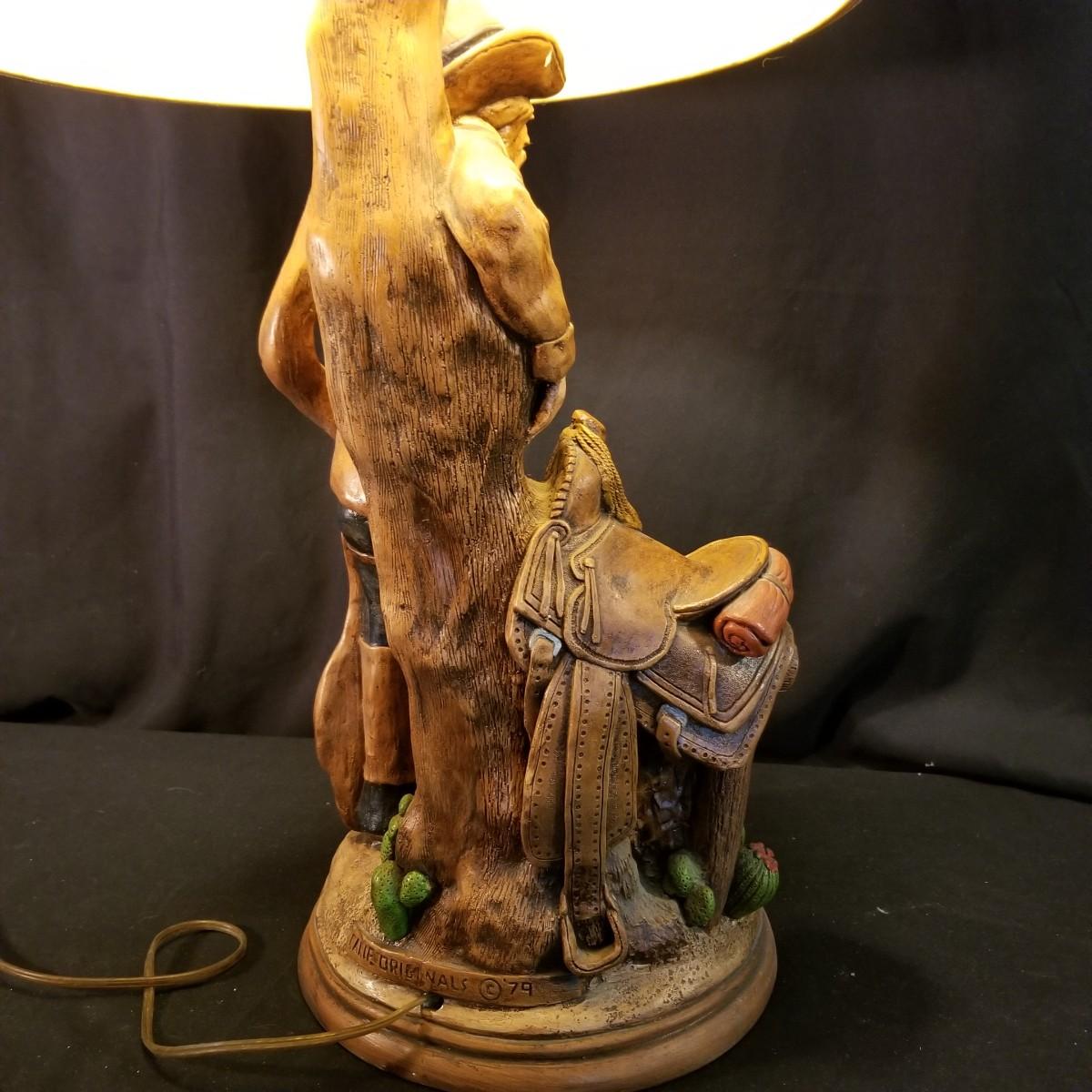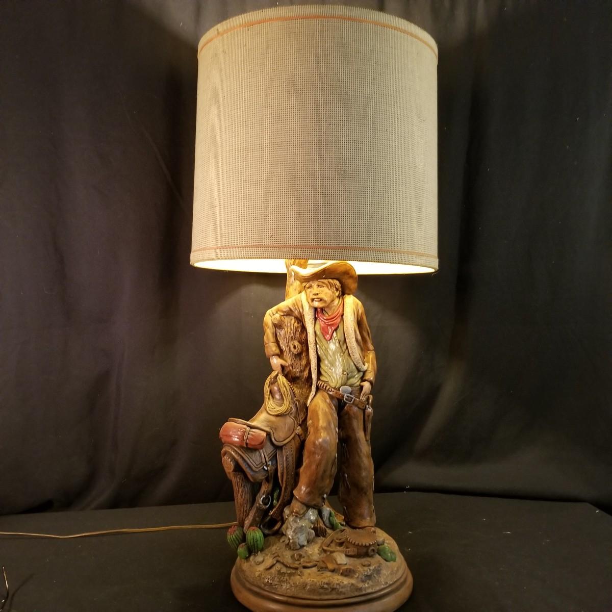 A western themed lamp depicting a cowboy and his rig. Made by California Originals and dated 1979.  Ceramic base with faux woven shade. Cowboy base is 20"h x 10"d, and with shade is 33"h. Good condition.  Shipping available.