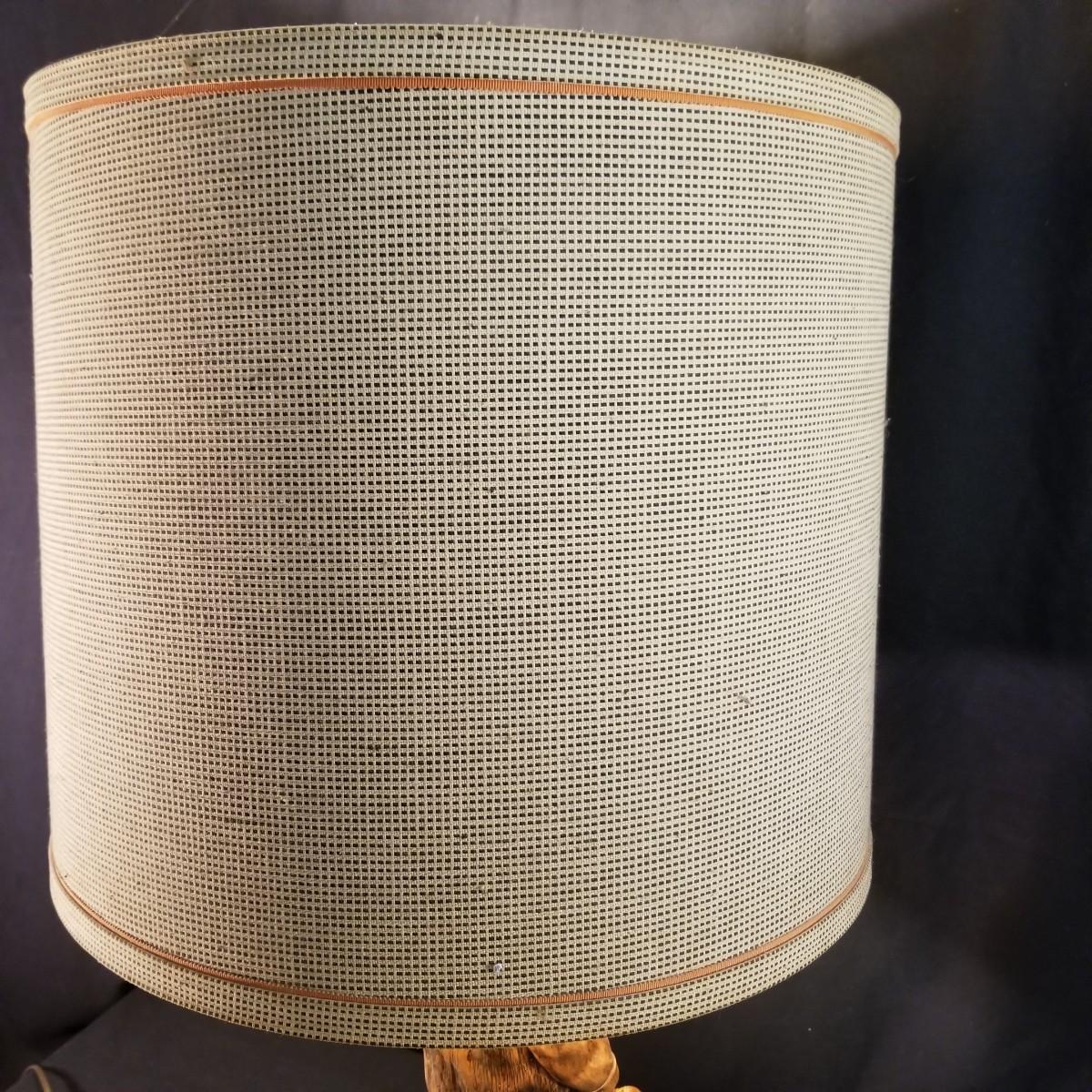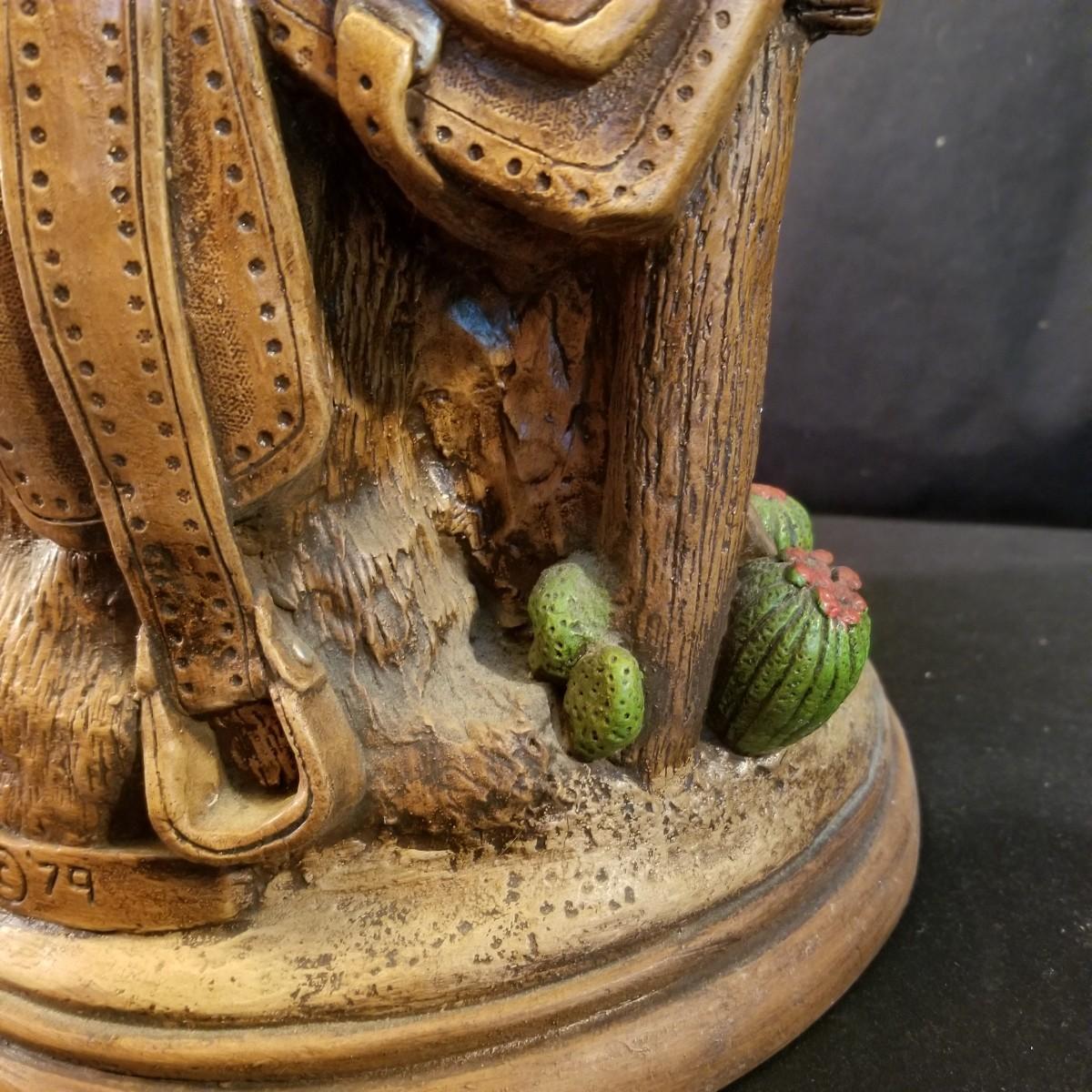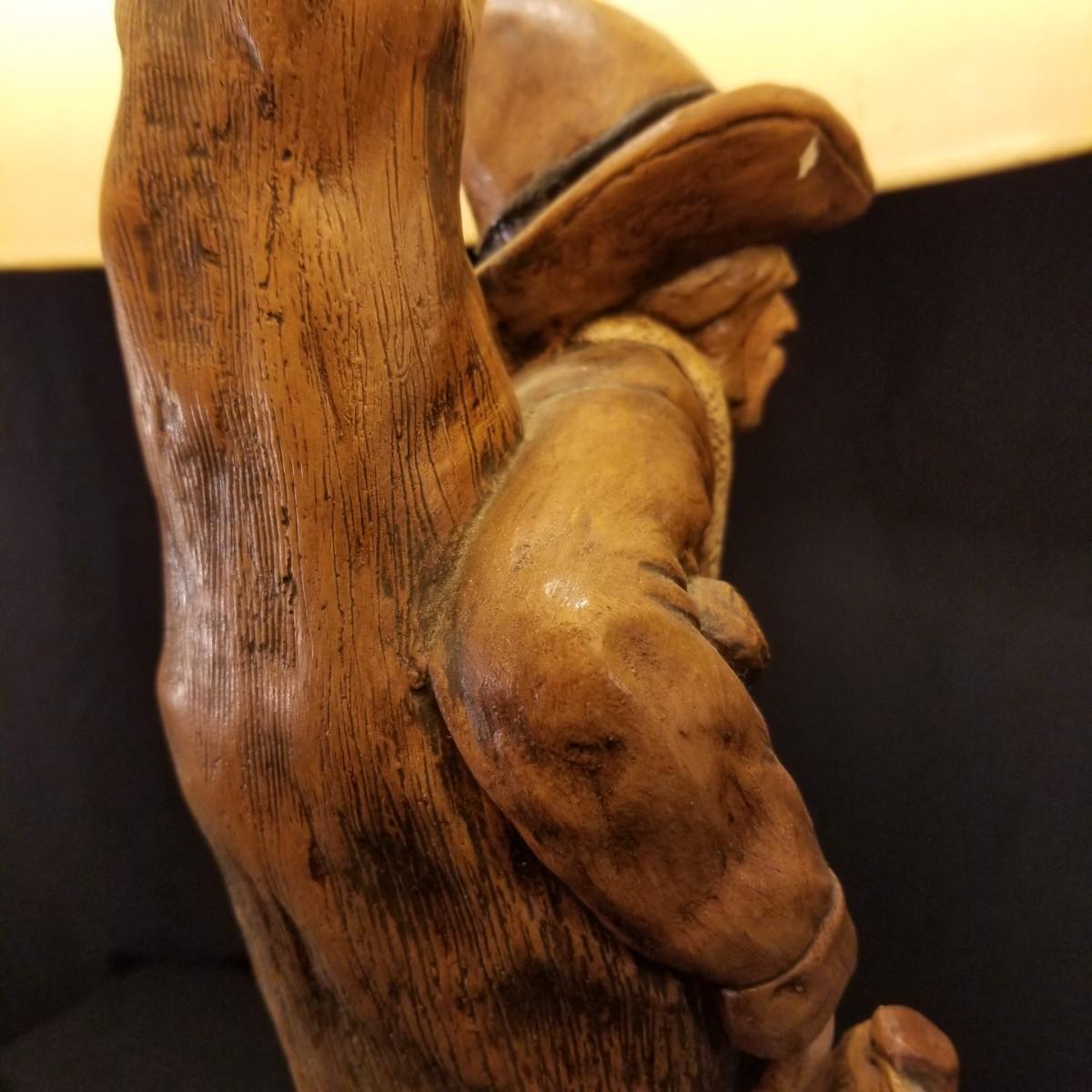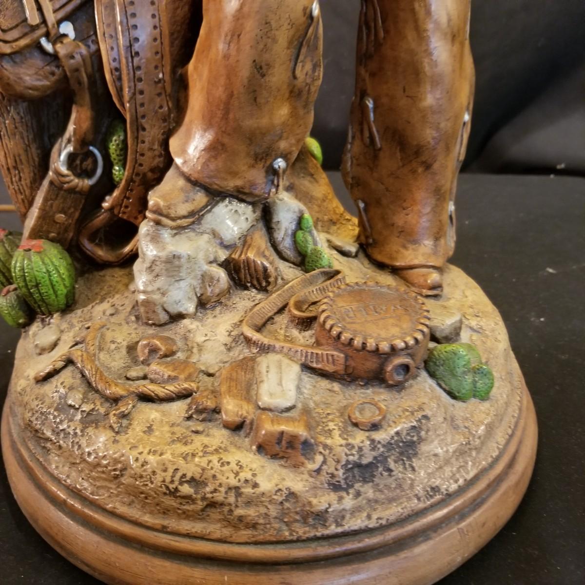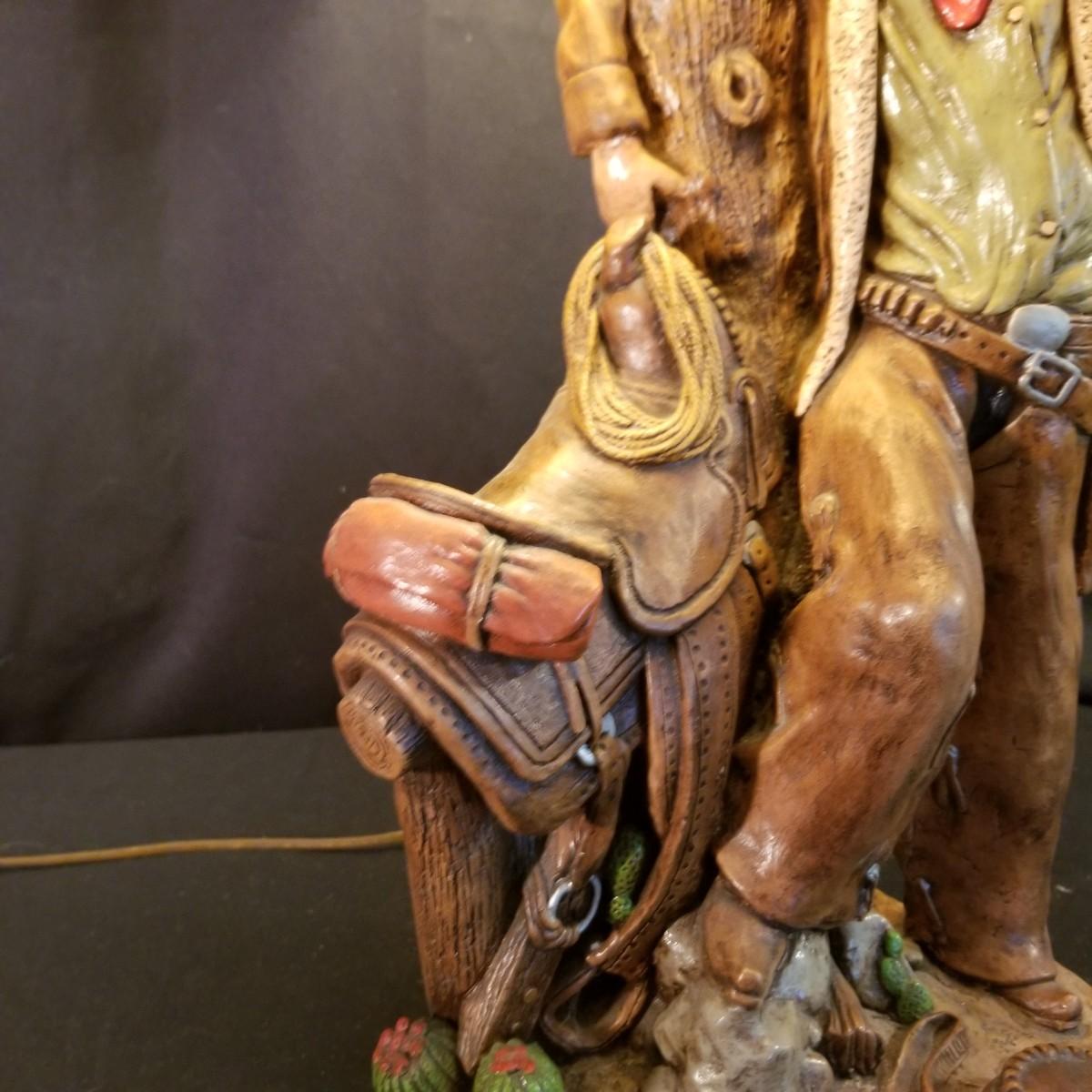 A western themed lamp depicting a cowboy and his rig. Made by California Originals and dated 1979.  Ceramic base with faux woven shade. Cowboy base is 20"h x 10"d, and with shade is 33"h. Good condition.  Shipping available.