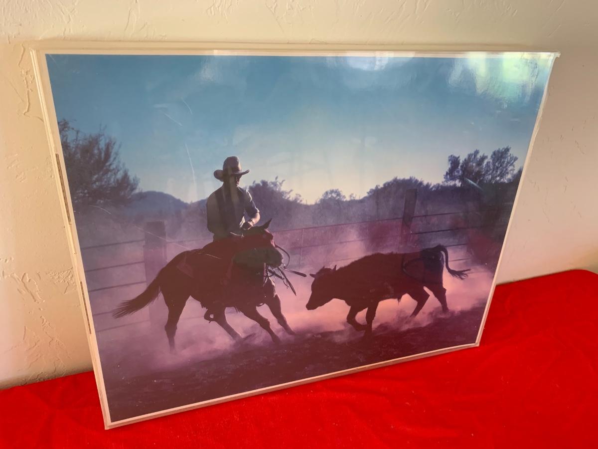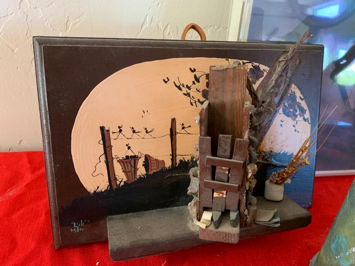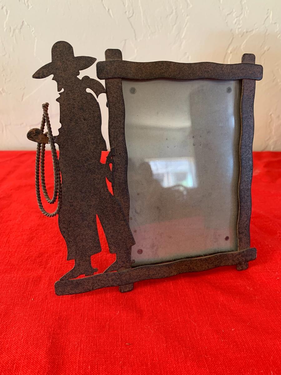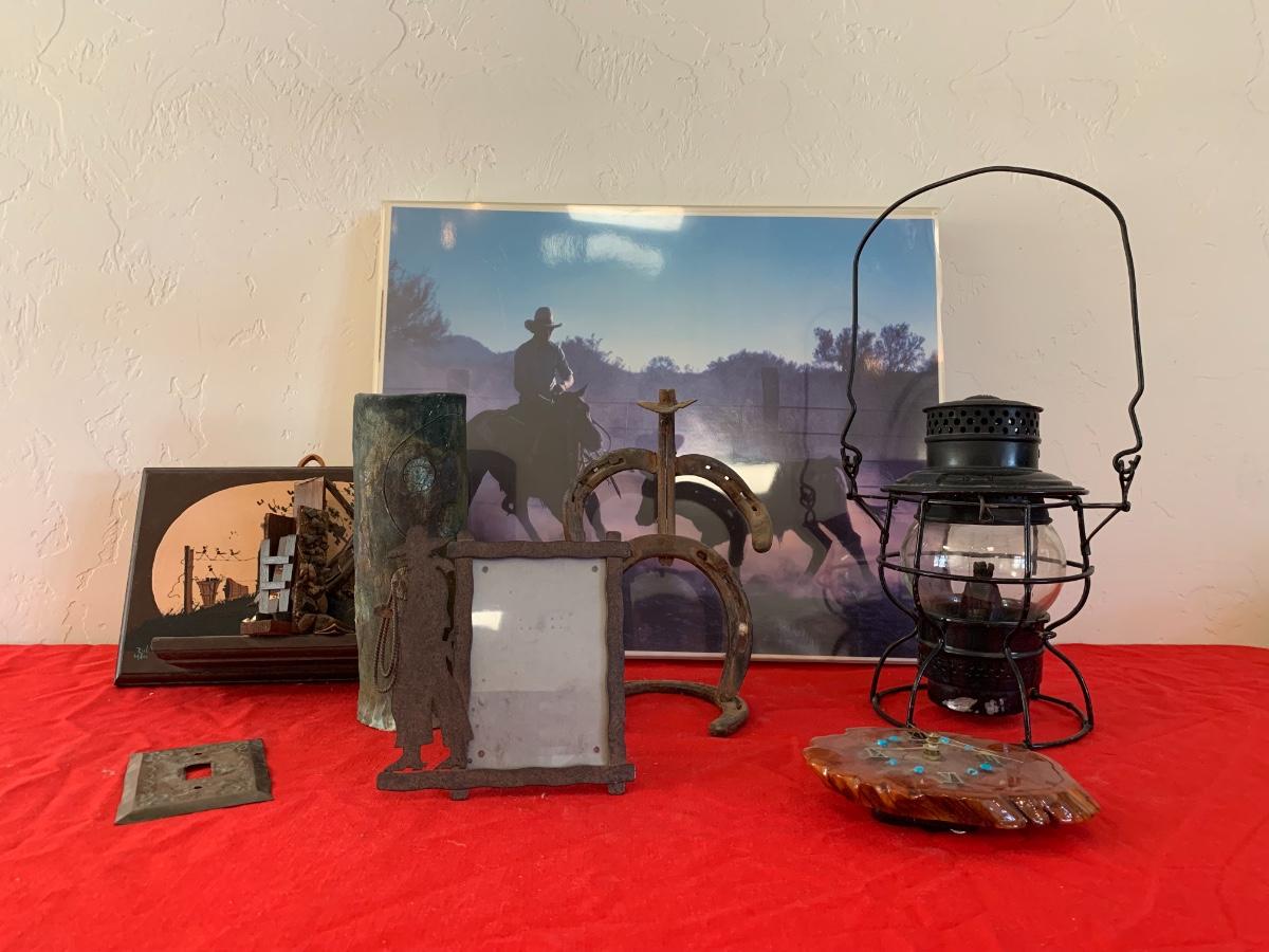 Plexi framed cowboy image (damage to right corner of frame), Tall studio pottery vase signed J Schafer, metal cowboy frame, SW themed mini diorama, a metal horseshoe cowboy sculpture, a tin punched light switch cover, a small handmade wood clock with turquoise colored hour markers, and a black painted metal antique lantern with round glass globe (great condition).