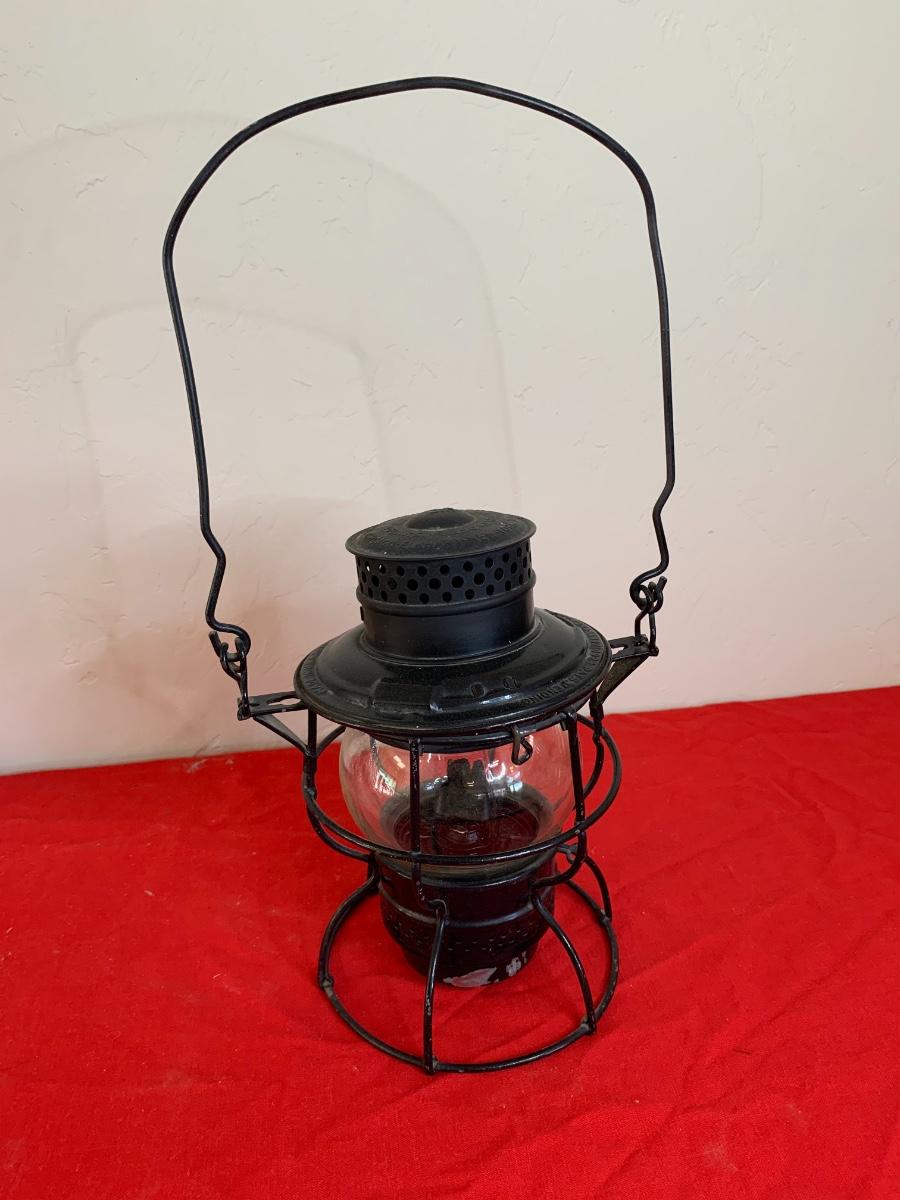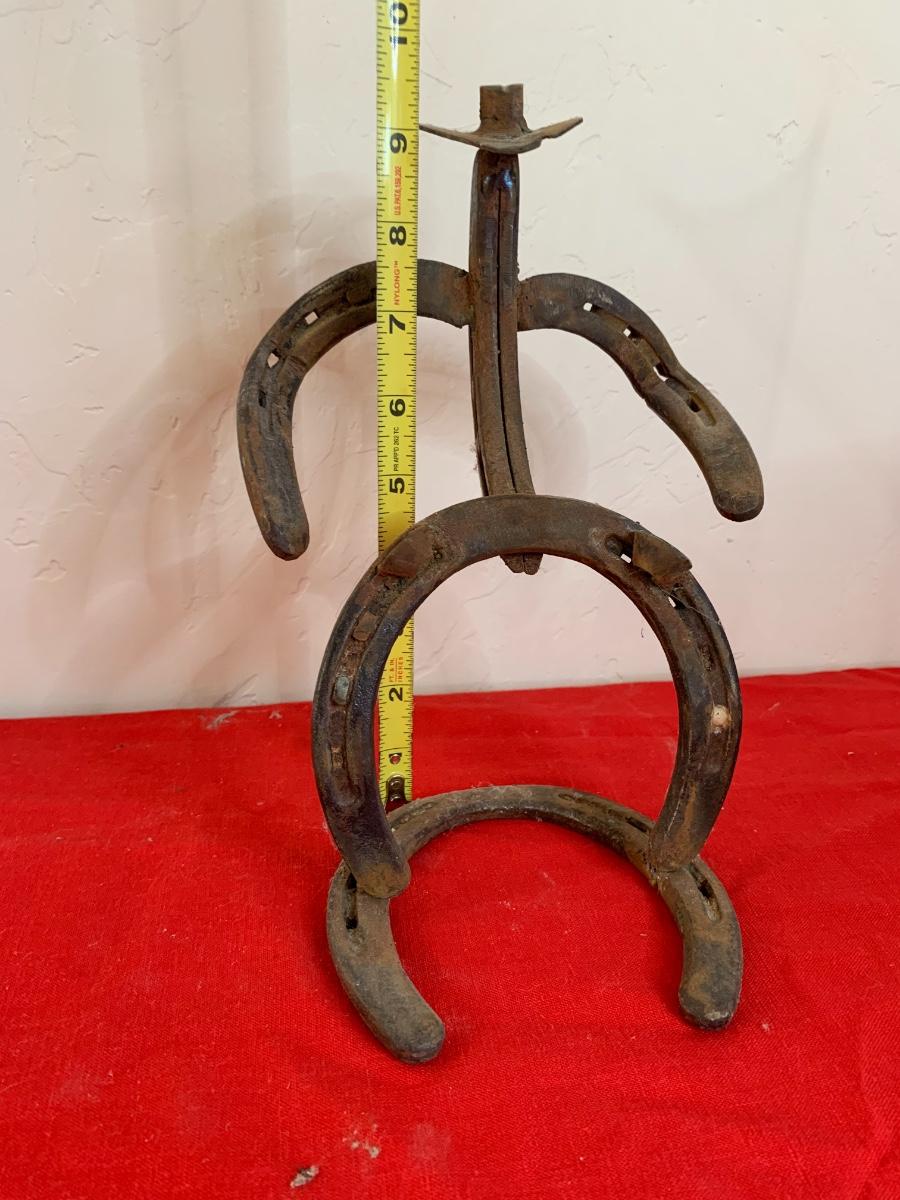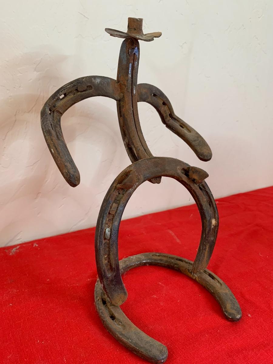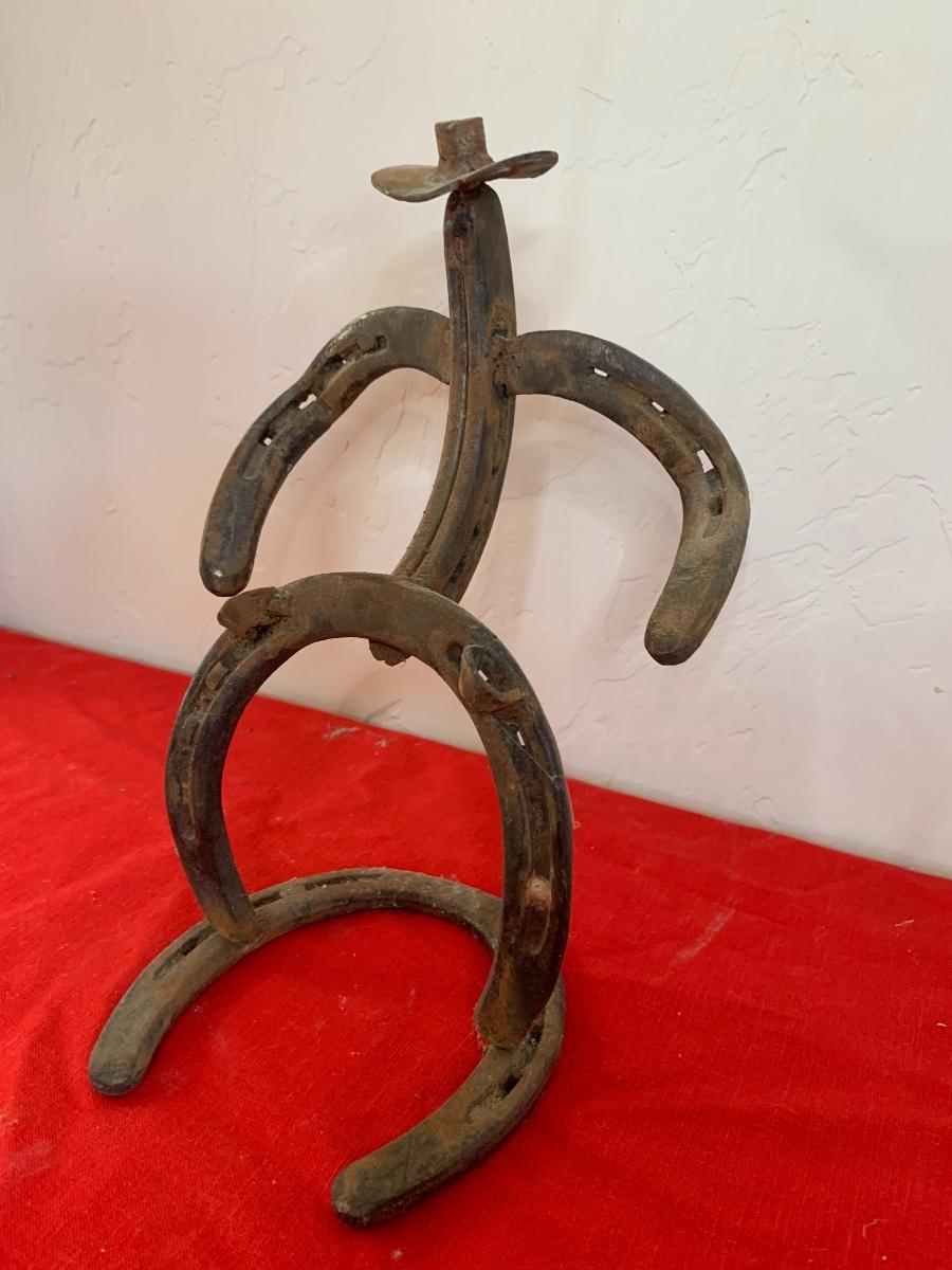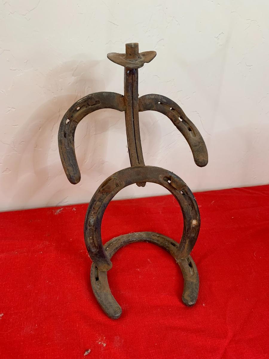 Plexi framed cowboy image (damage to right corner of frame), Tall studio pottery vase signed J Schafer, metal cowboy frame, SW themed mini diorama, a metal horseshoe cowboy sculpture, a tin punched light switch cover, a small handmade wood clock with turquoise colored hour markers, and a black painted metal antique lantern with round glass globe (great condition).