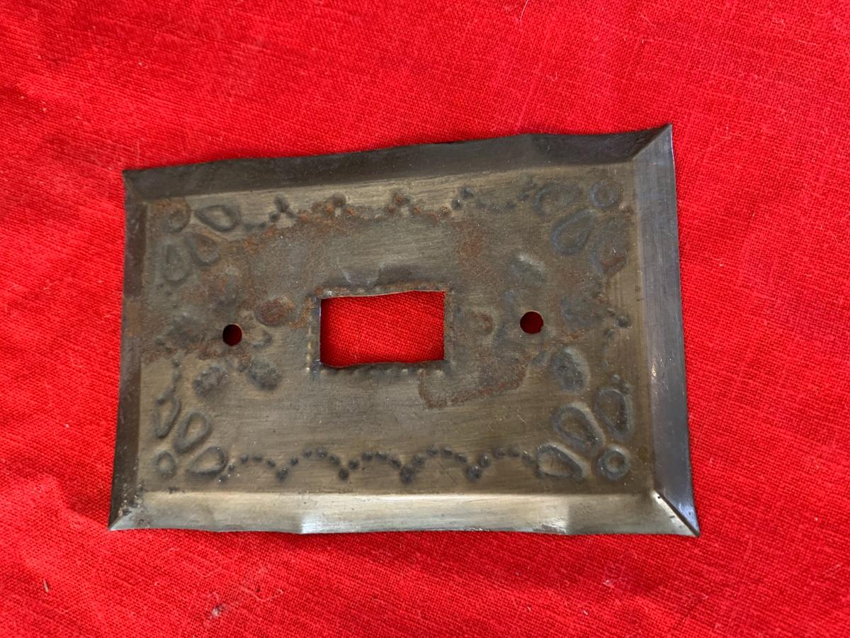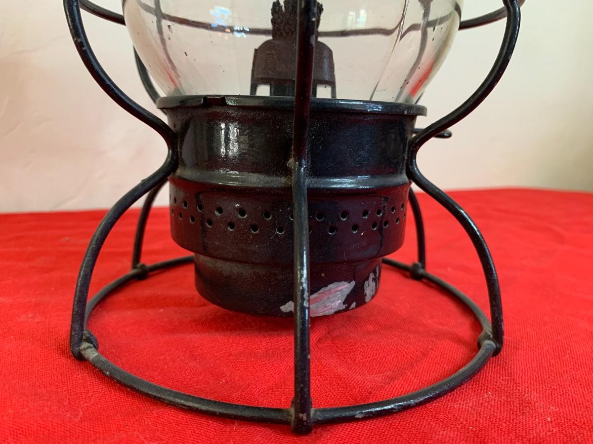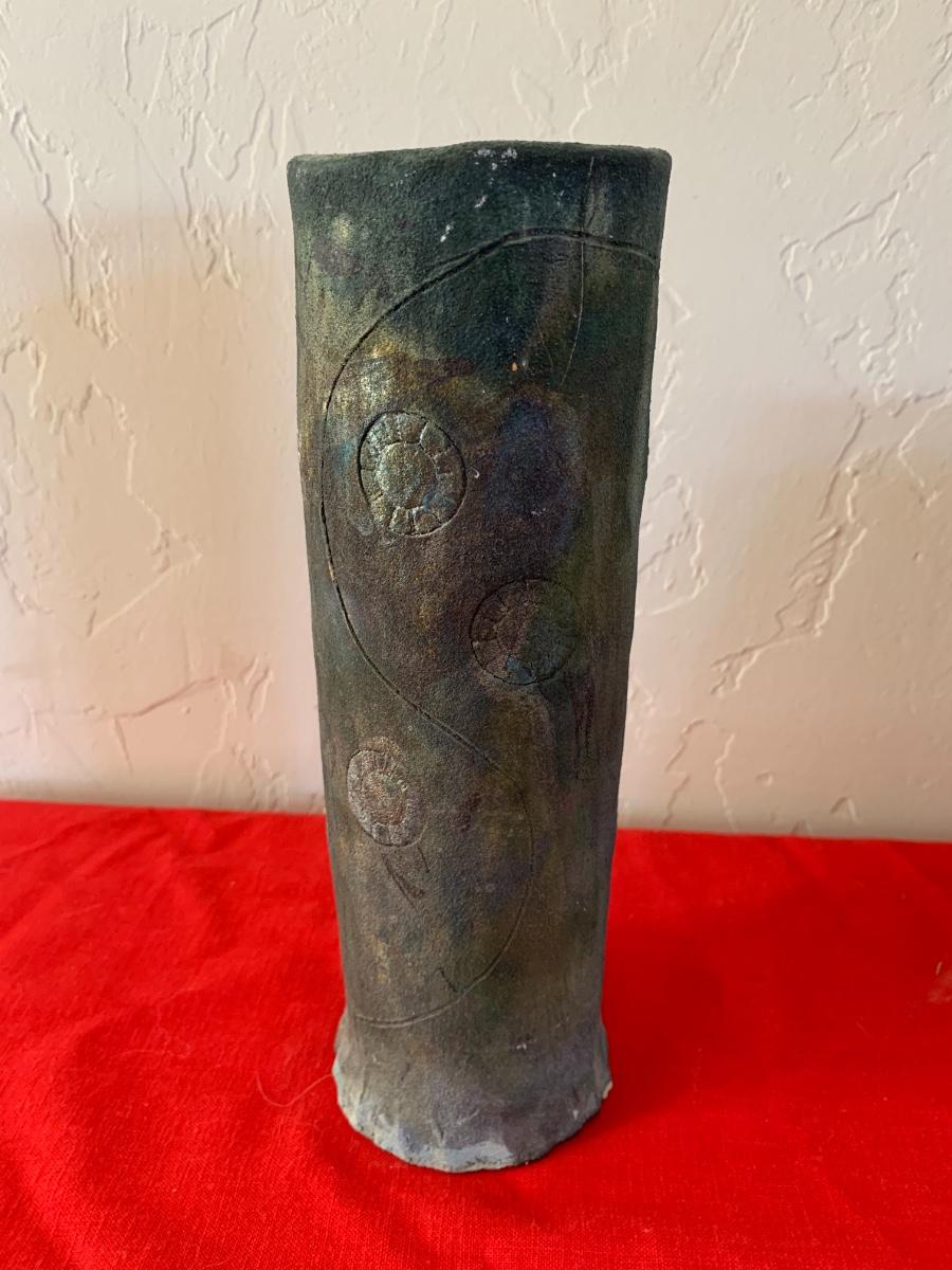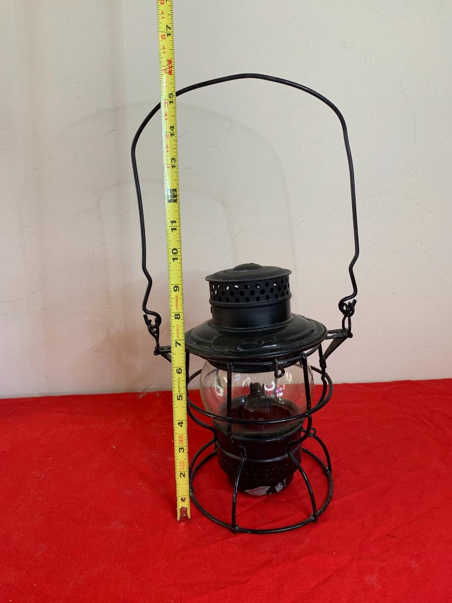 Plexi framed cowboy image (damage to right corner of frame), Tall studio pottery vase signed J Schafer, metal cowboy frame, SW themed mini diorama, a metal horseshoe cowboy sculpture, a tin punched light switch cover, a small handmade wood clock with turquoise colored hour markers, and a black painted metal antique lantern with round glass globe (great condition).