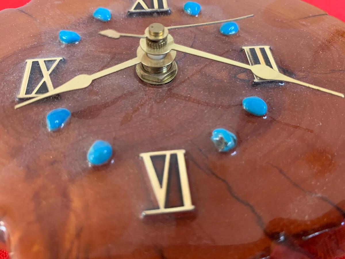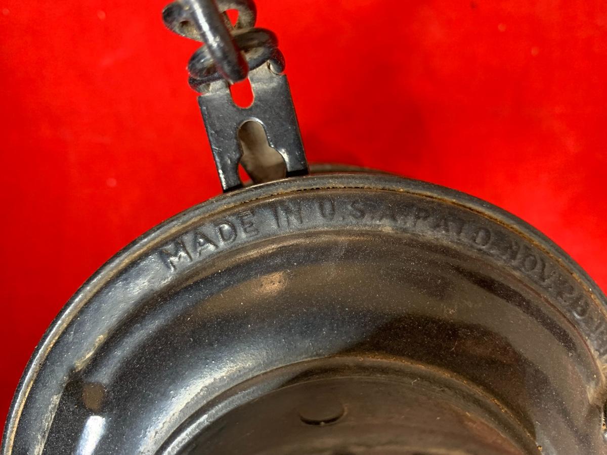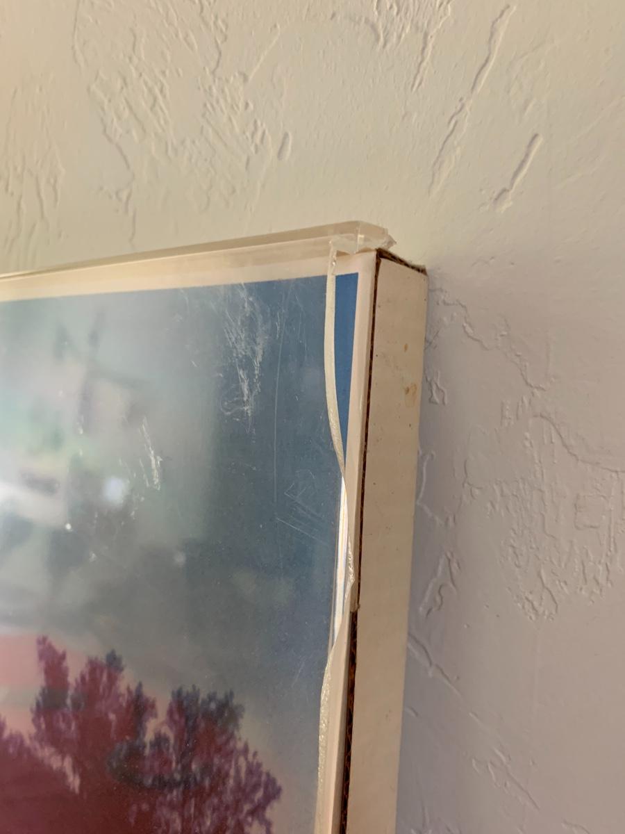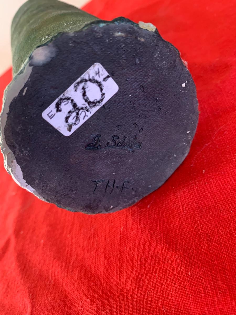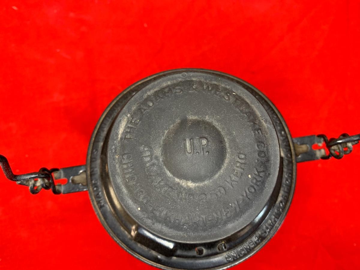 Plexi framed cowboy image (damage to right corner of frame), Tall studio pottery vase signed J Schafer, metal cowboy frame, SW themed mini diorama, a metal horseshoe cowboy sculpture, a tin punched light switch cover, a small handmade wood clock with turquoise colored hour markers, and a black painted metal antique lantern with round glass globe (great condition).
