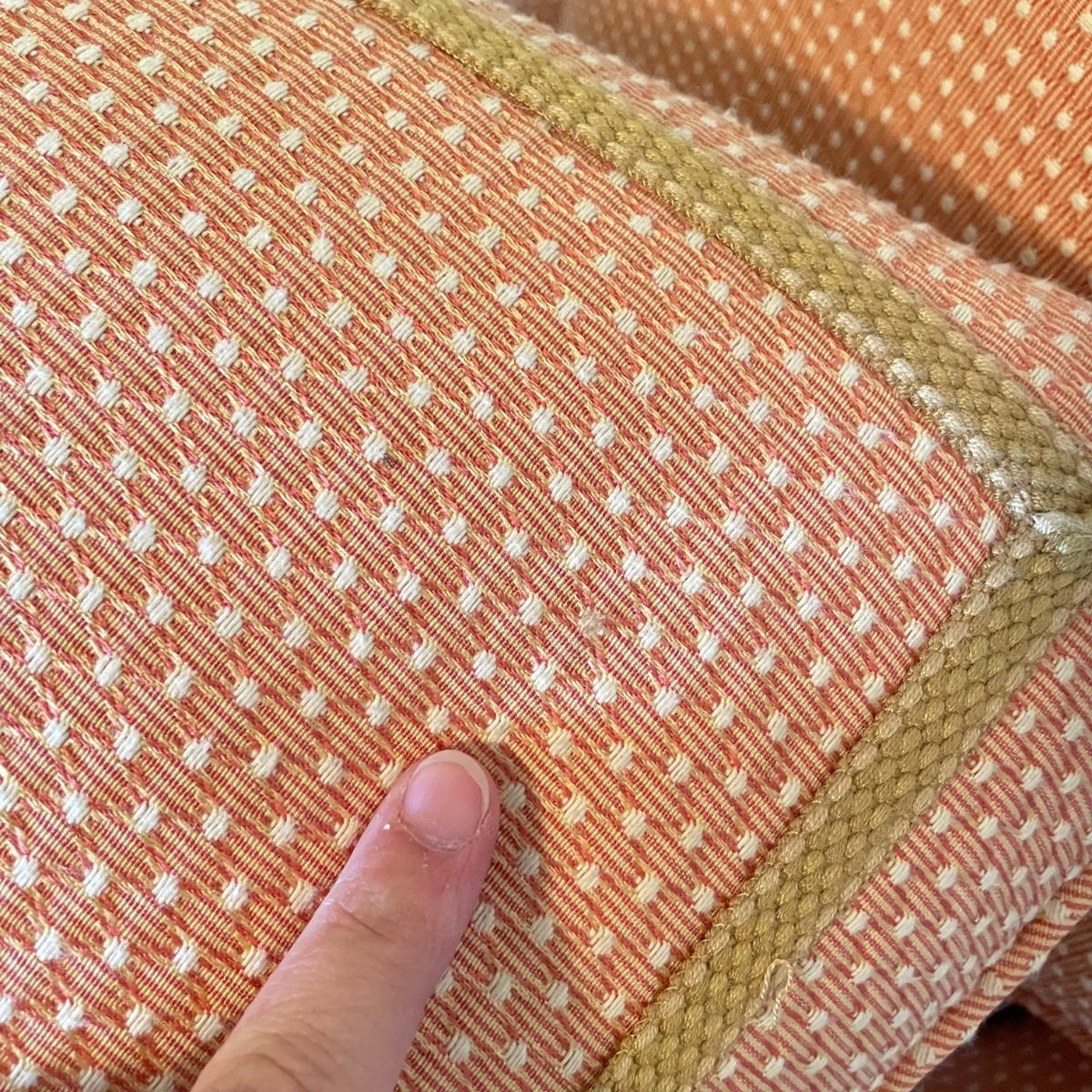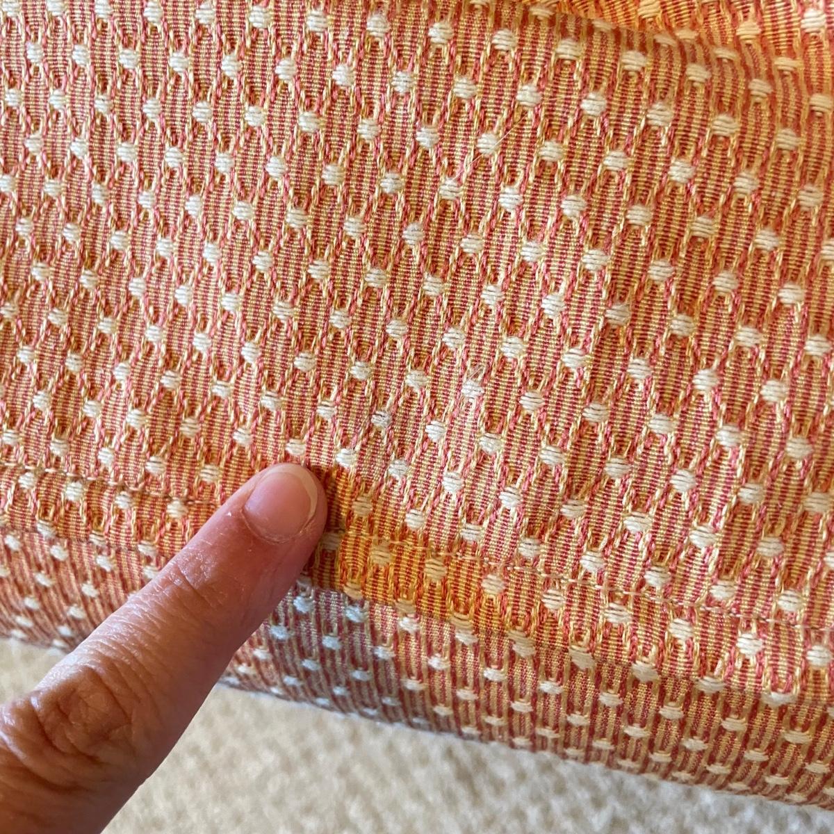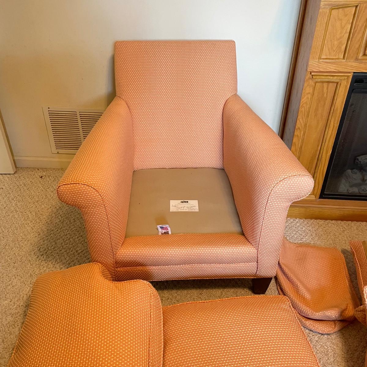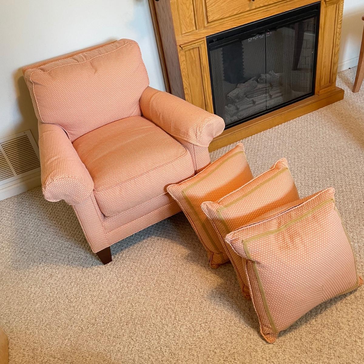 Cozy upholstered salmon/peach colored arm chair with three extra matching pillows. It appears the chair was reupholstered and the pillows are likely hand made. Just a couple spots found on the arm covers and pillows. Chair measures 33” x 37” x 31”H with a seat height at 18”H. Chair is located in basement with one flight of stairs to the main level. Winning bidder must bring assistance to help move and load this item due to its weight and/or size. Local pick up only.