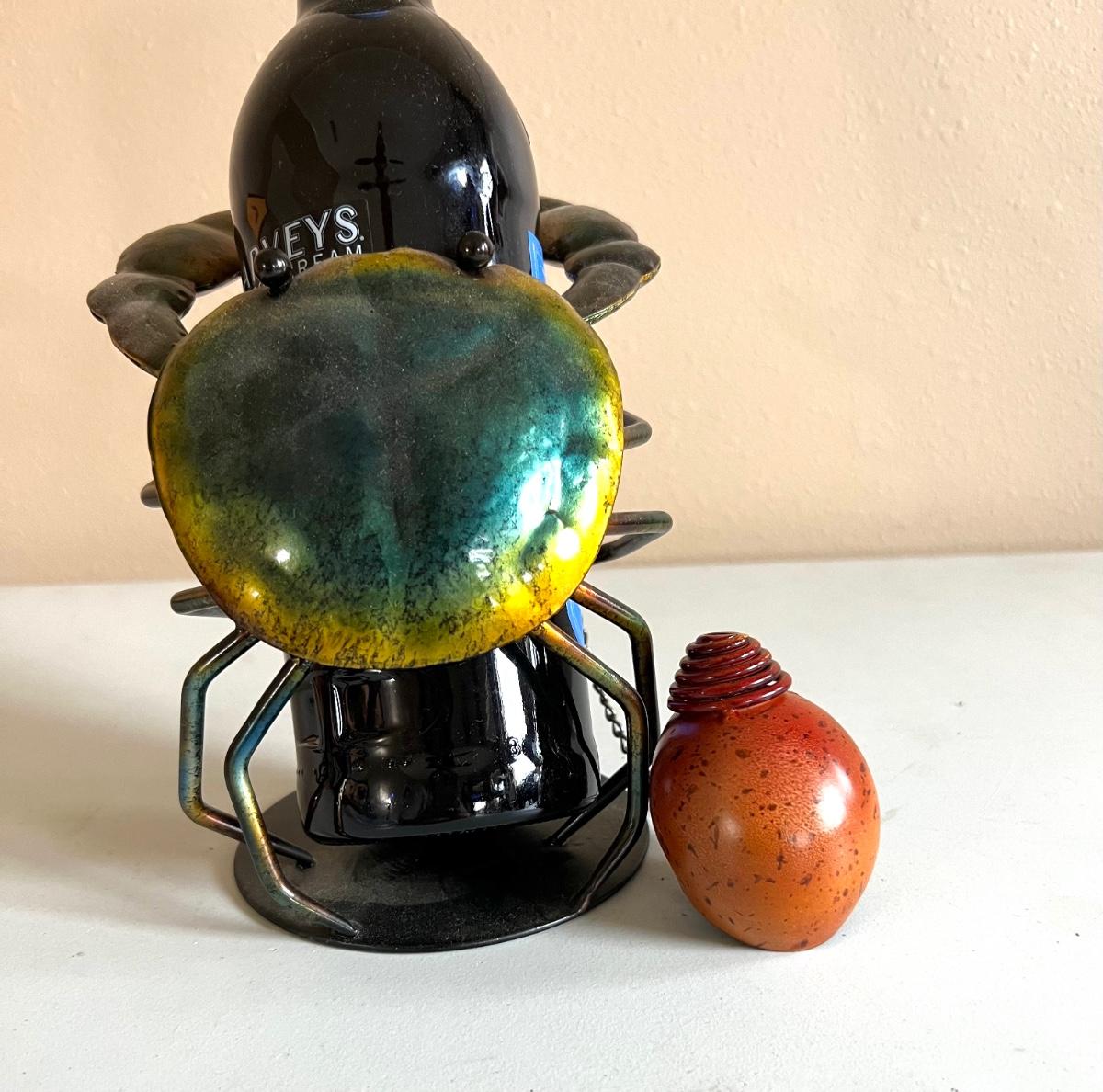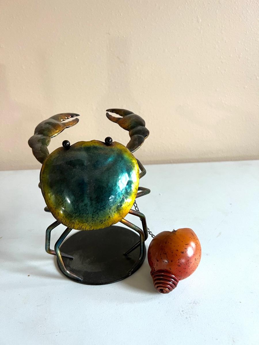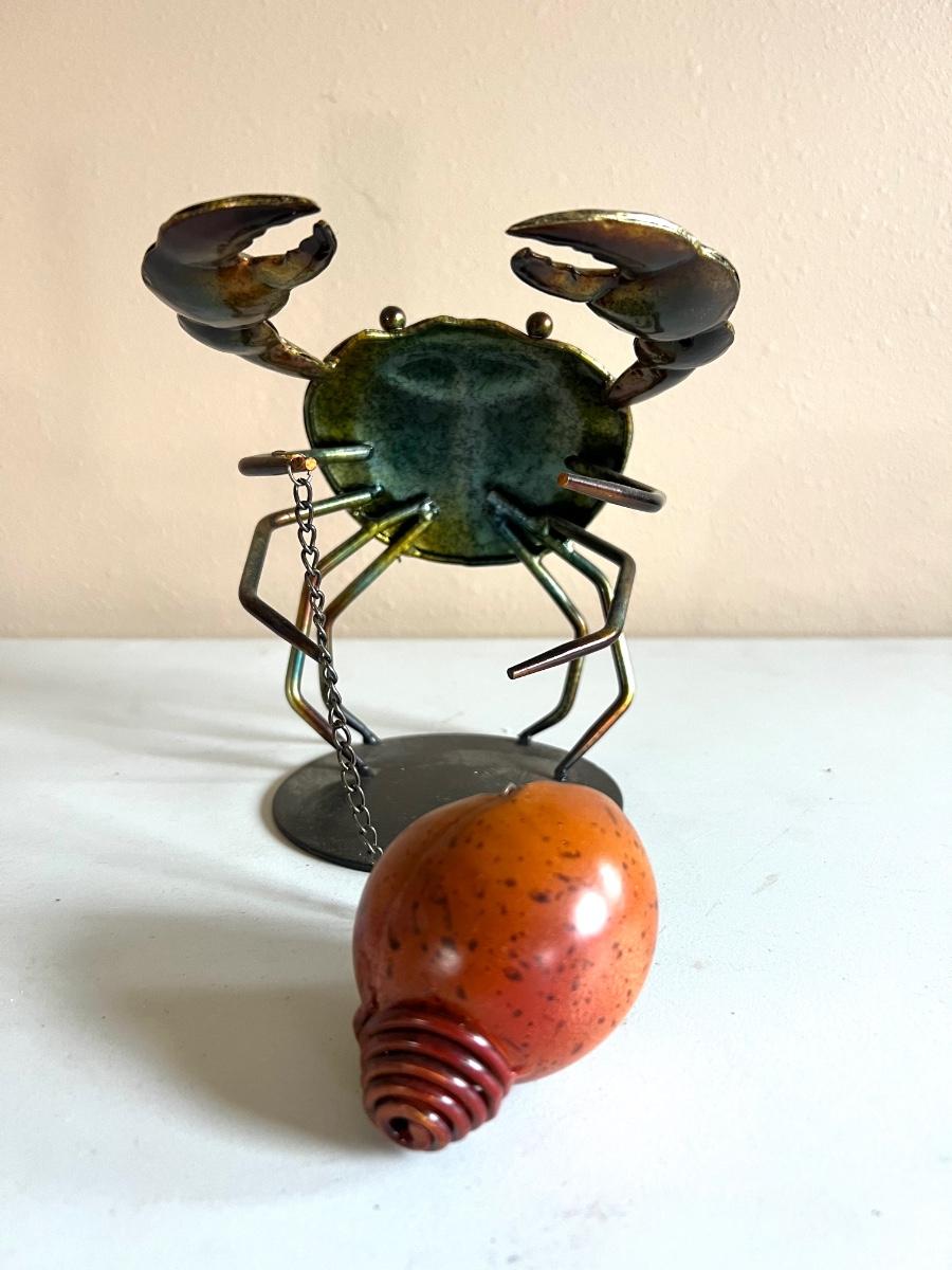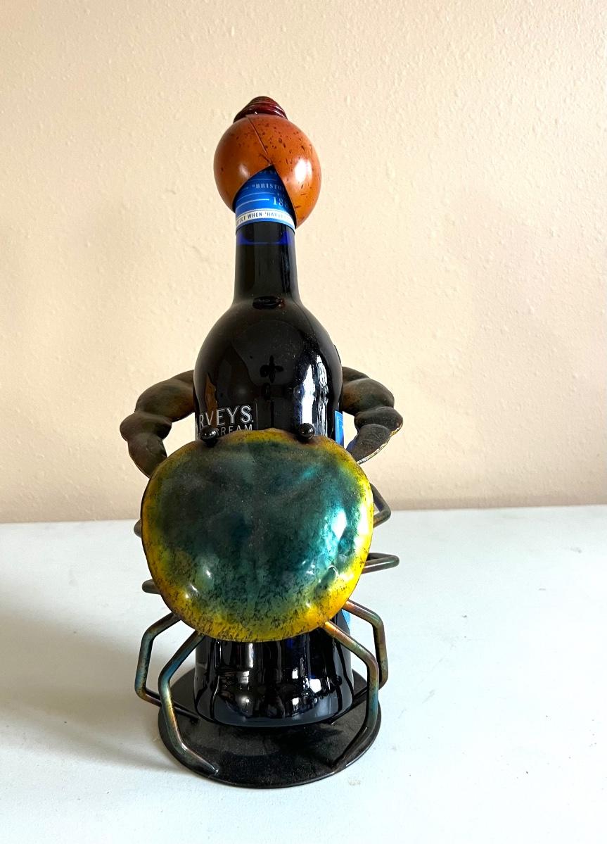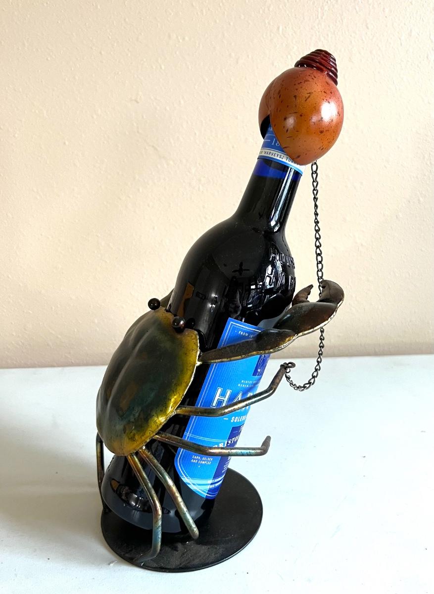 Metal Crab Wine Bottle Holder. Measures 6 1/2 inches tall, 5 1/2 inches wide, 5 1/2 inches deep. Holder Only.