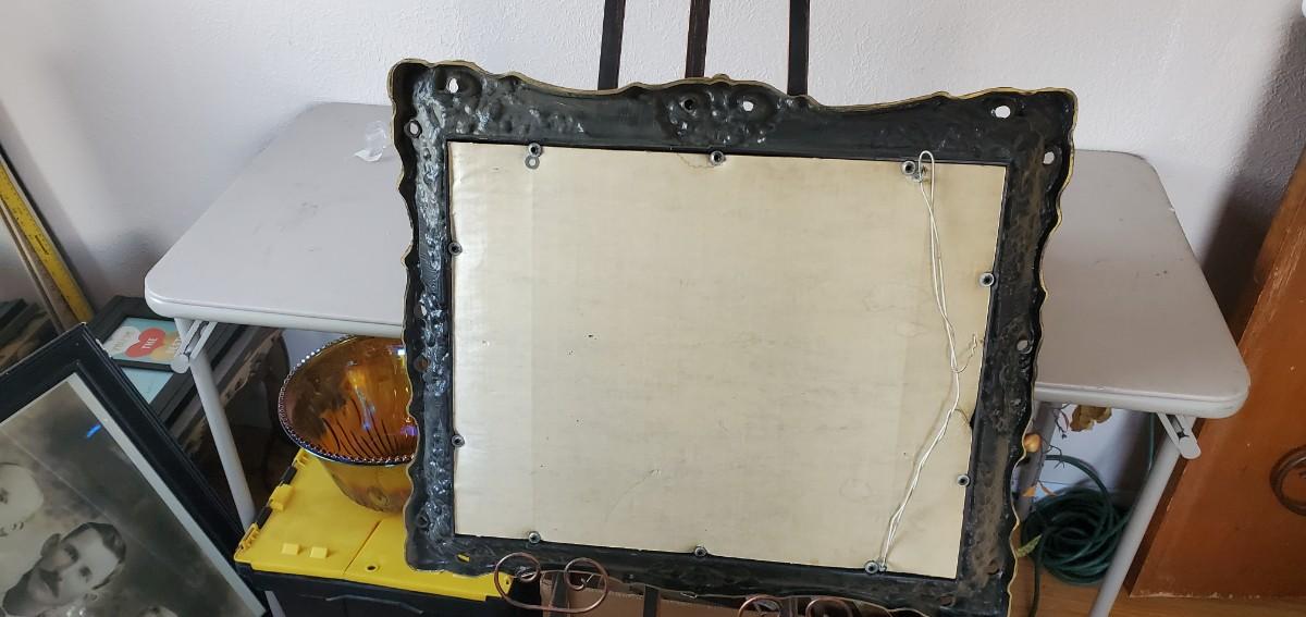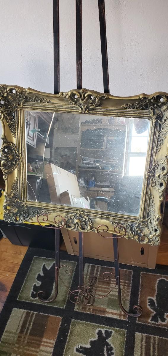 This is an old cracked bathroom mirror glass housed in a plastic frame with gold color on the frame size is 21 and 3/4 by 16 and 3/4
