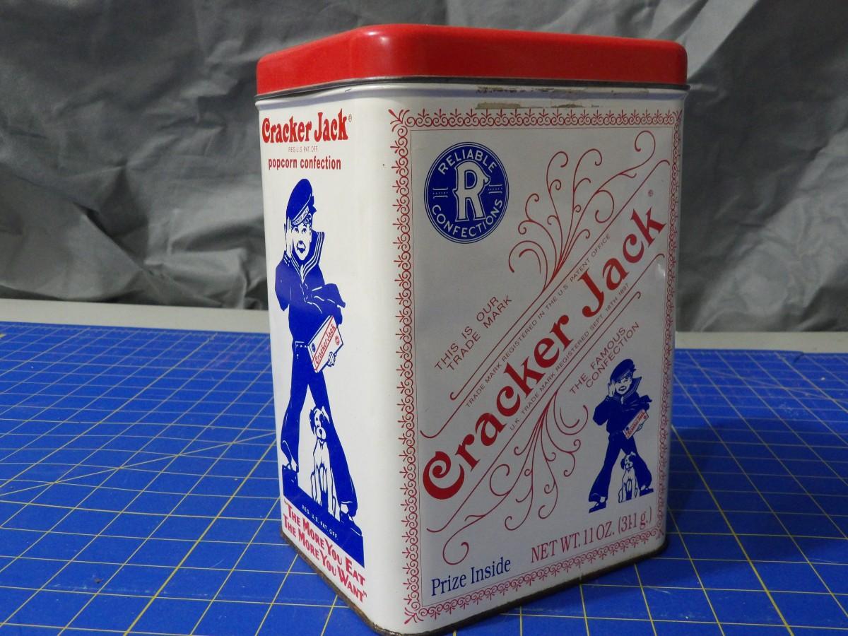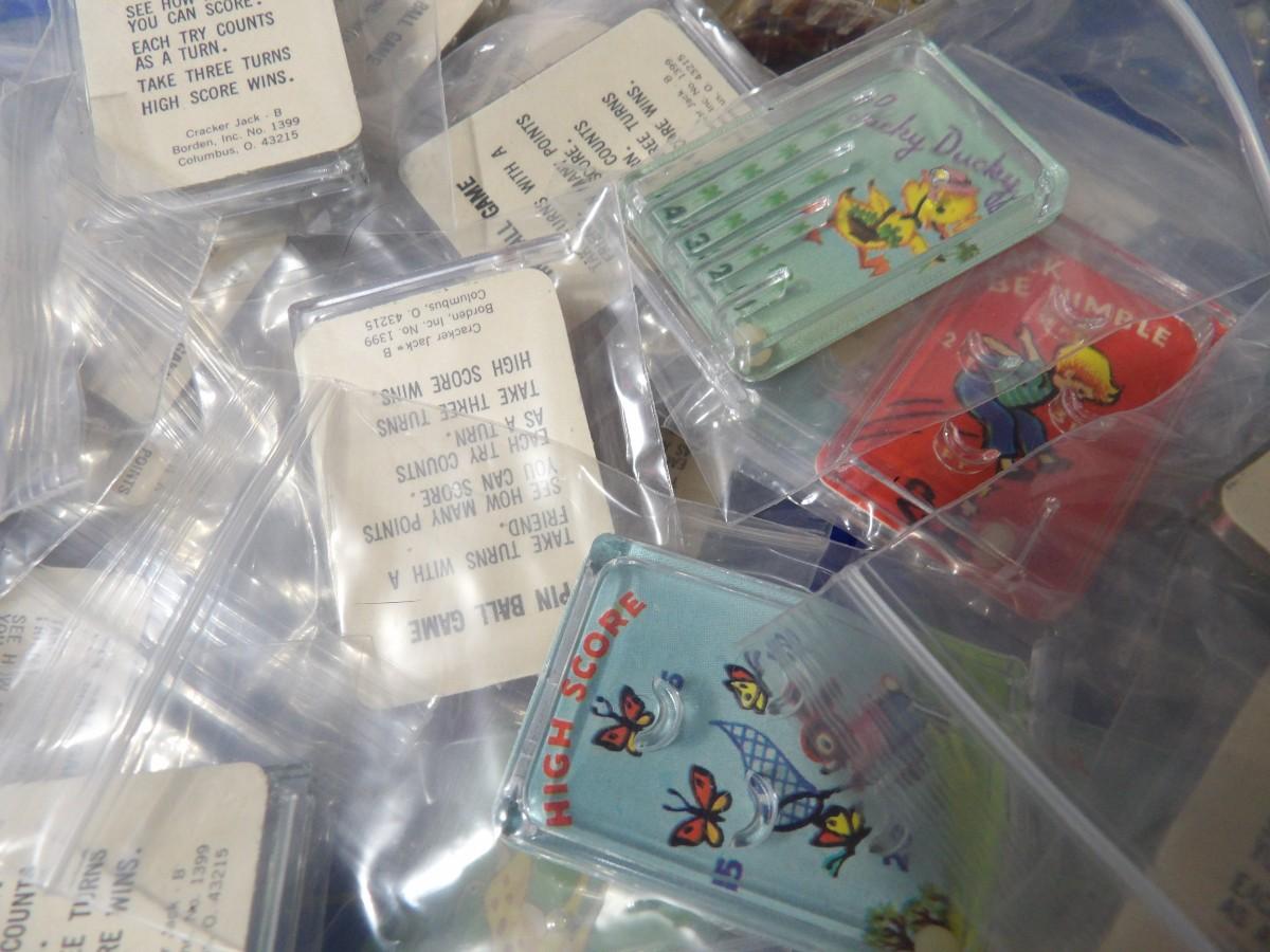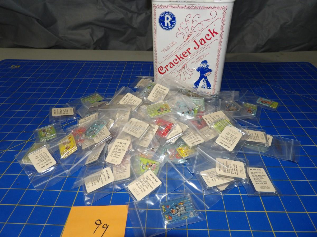 100 1960's cracker jack prizes in a 1990's cracker jack tin. All prizes are individually bagged for easy resale