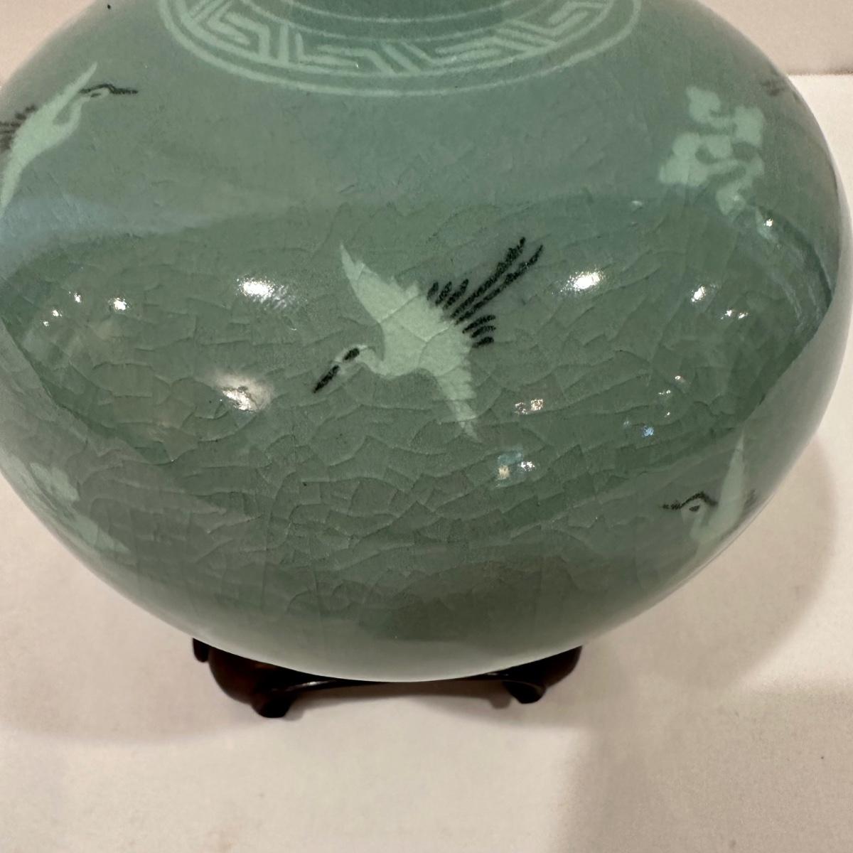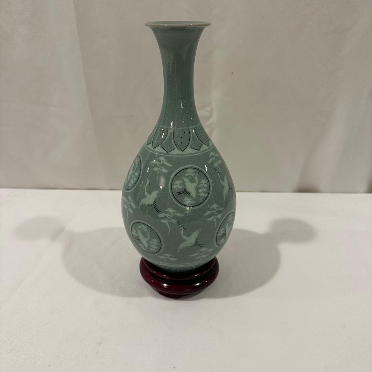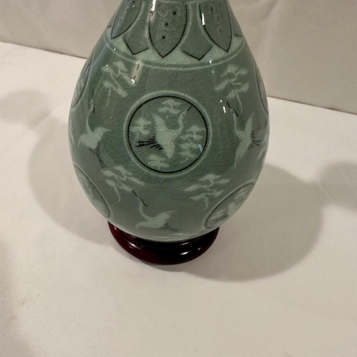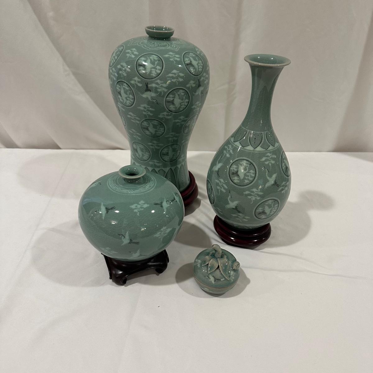 Three vases with wooden stands that appear to be porcelain with crackle celadon glaze with a flying crane design. Includes small apple with lid. Tallest vase is 12”H with wooden stand. Stand measures is 6.5”D. Shortest vase is 6.5”H with stand. Stand measures 3.5”D. Apple is 3”H x 2.5”D. Shipping available.