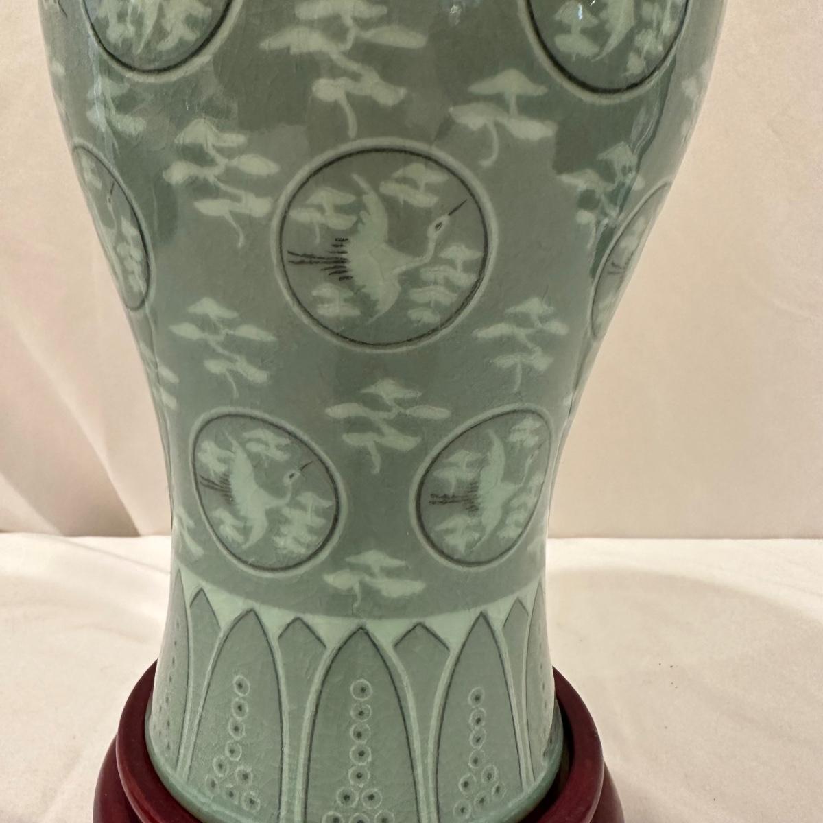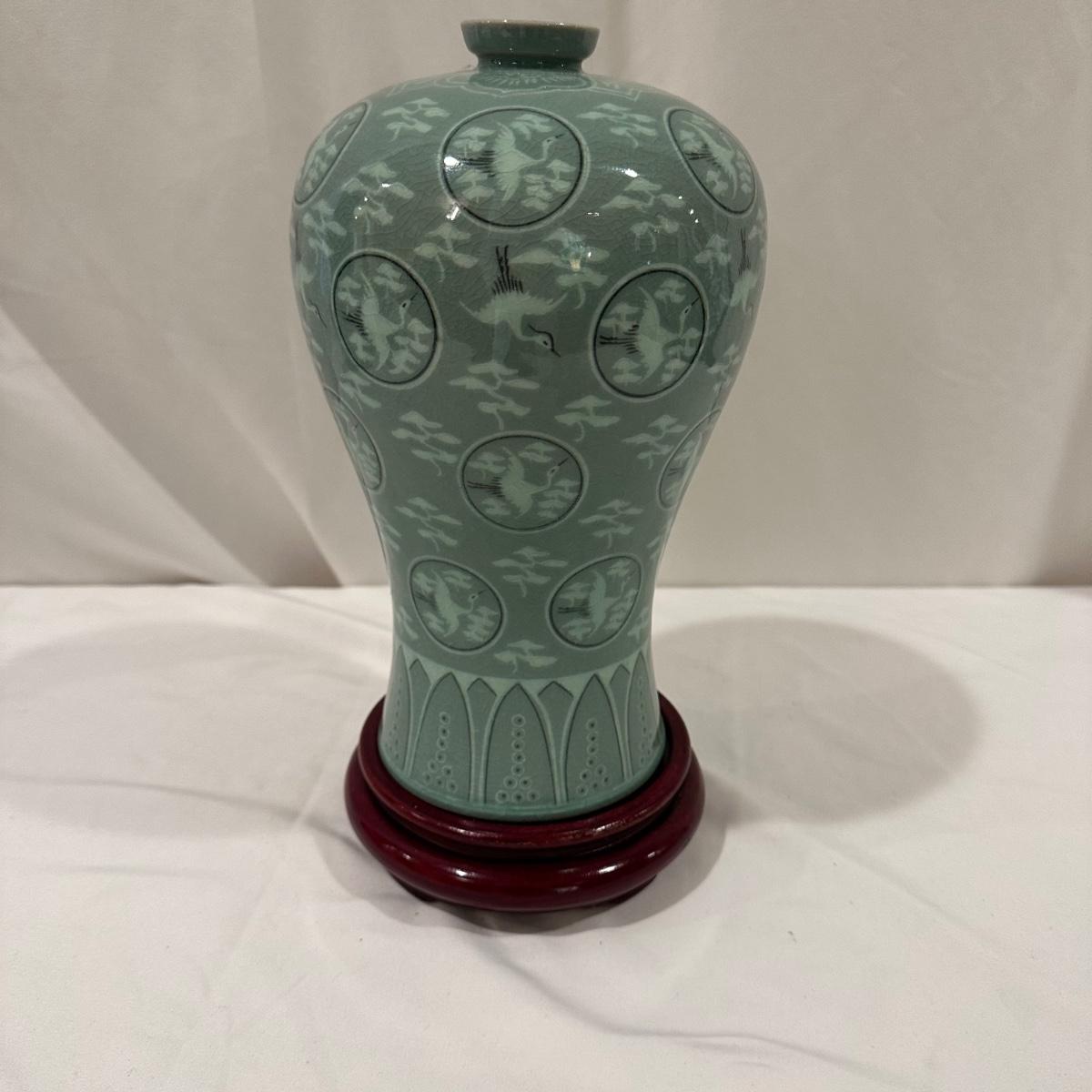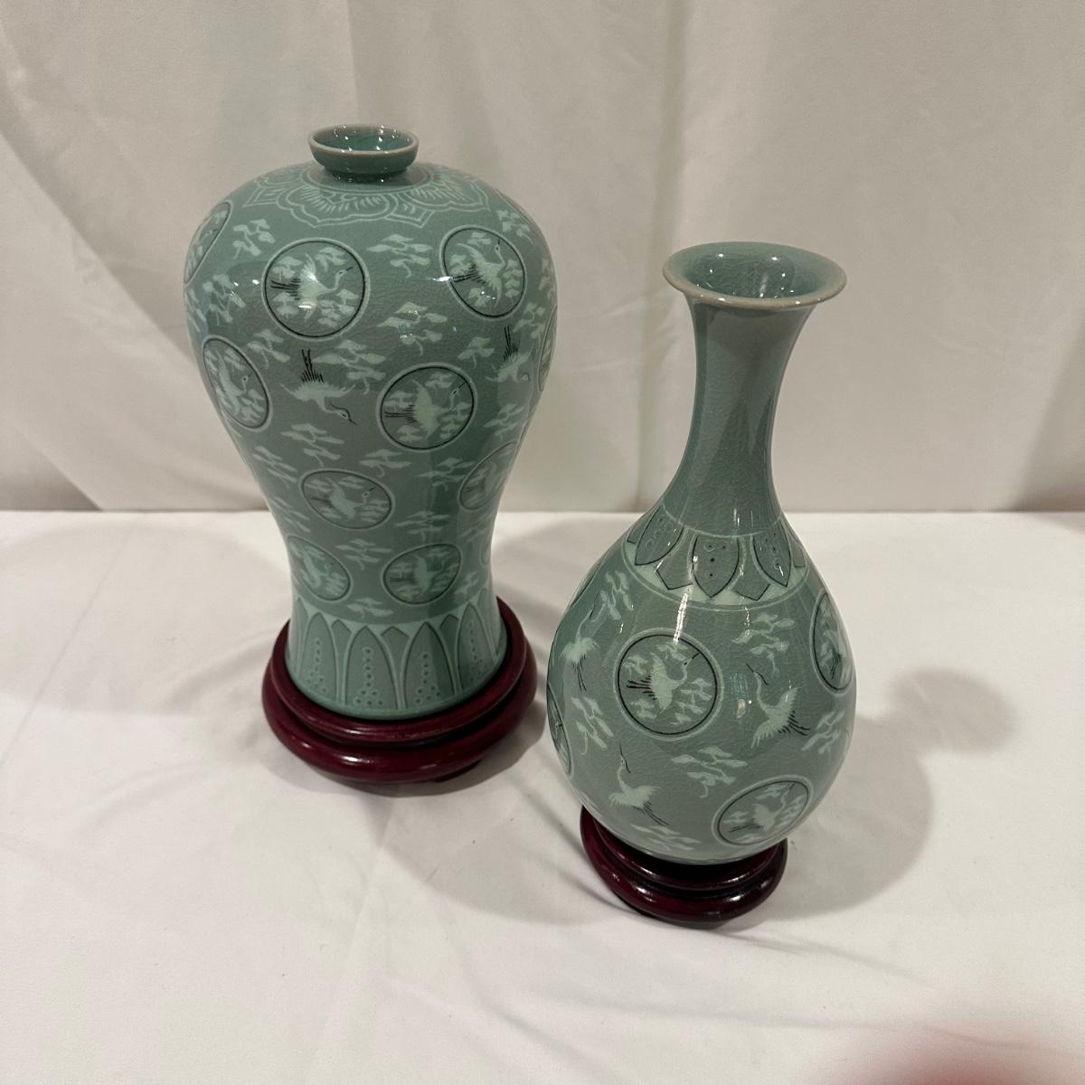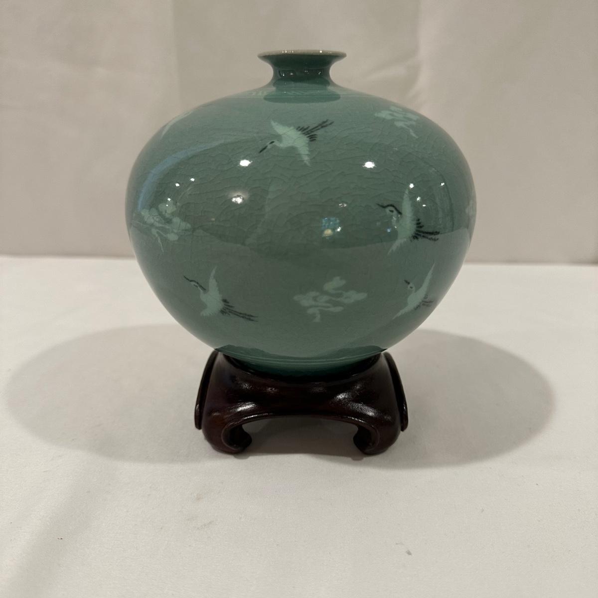 Three vases with wooden stands that appear to be porcelain with crackle celadon glaze with a flying crane design. Includes small apple with lid. Tallest vase is 12”H with wooden stand. Stand measures is 6.5”D. Shortest vase is 6.5”H with stand. Stand measures 3.5”D. Apple is 3”H x 2.5”D. Shipping available.