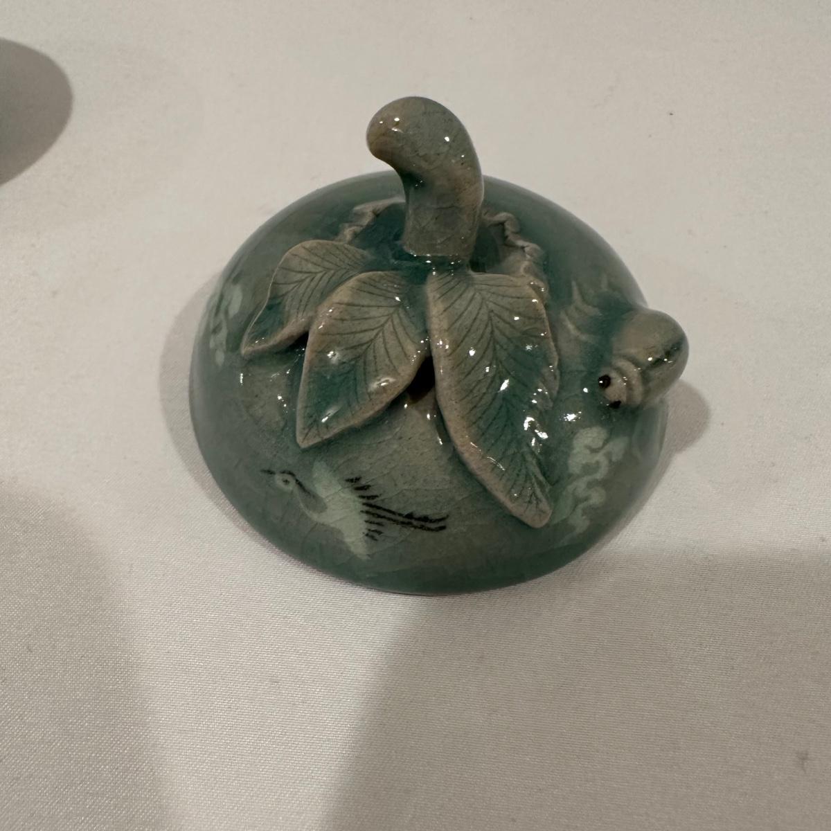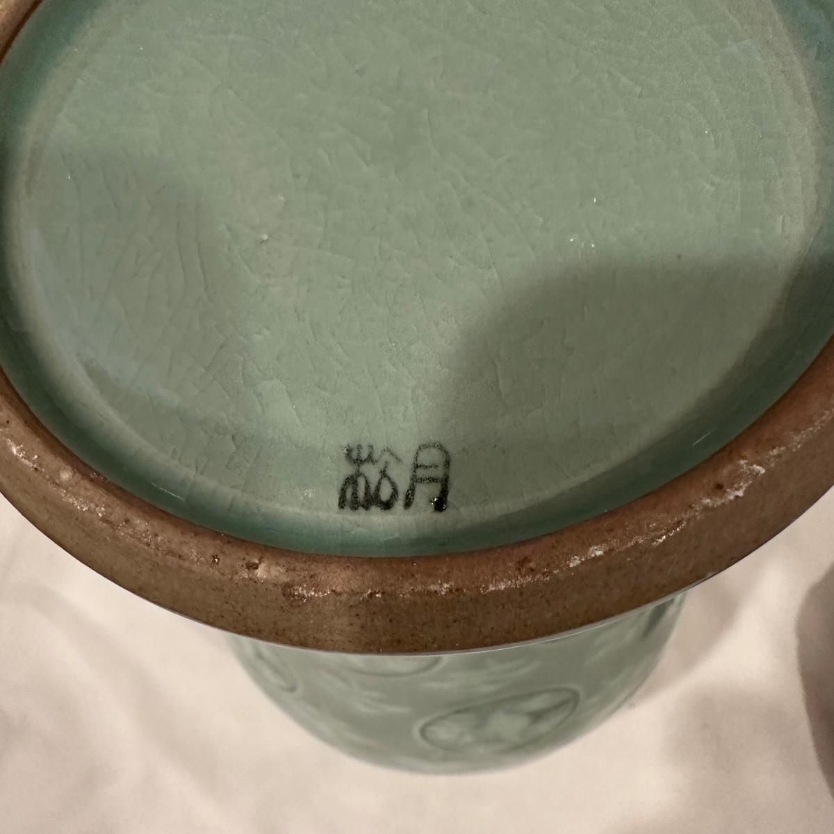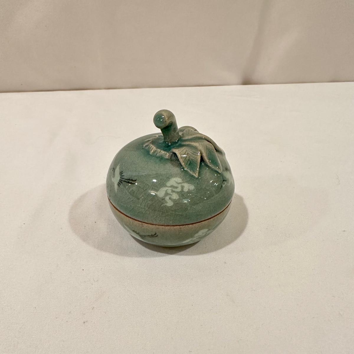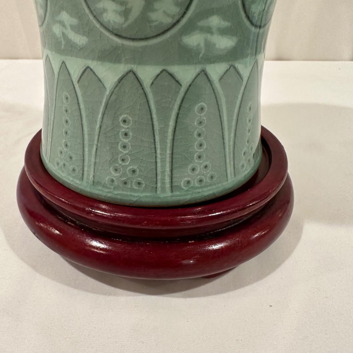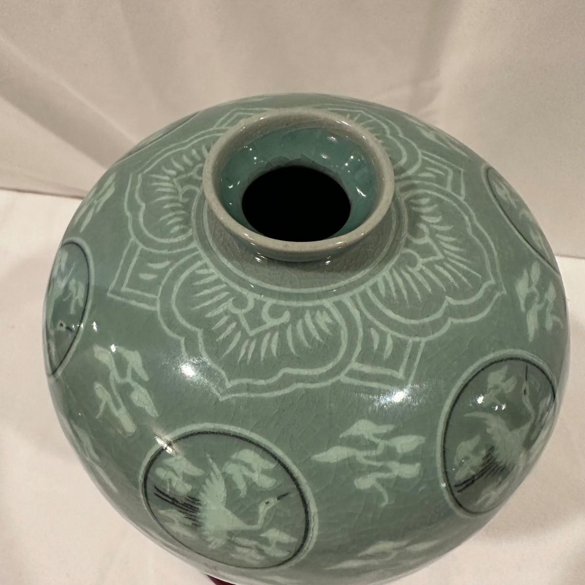 Three vases with wooden stands that appear to be porcelain with crackle celadon glaze with a flying crane design. Includes small apple with lid. Tallest vase is 12”H with wooden stand. Stand measures is 6.5”D. Shortest vase is 6.5”H with stand. Stand measures 3.5”D. Apple is 3”H x 2.5”D. Shipping available.